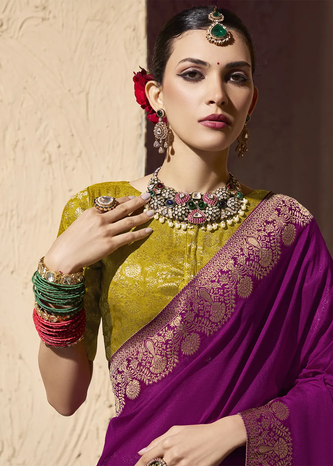 Magenta Meenakari Banarasi Saree with Contrast Blouse