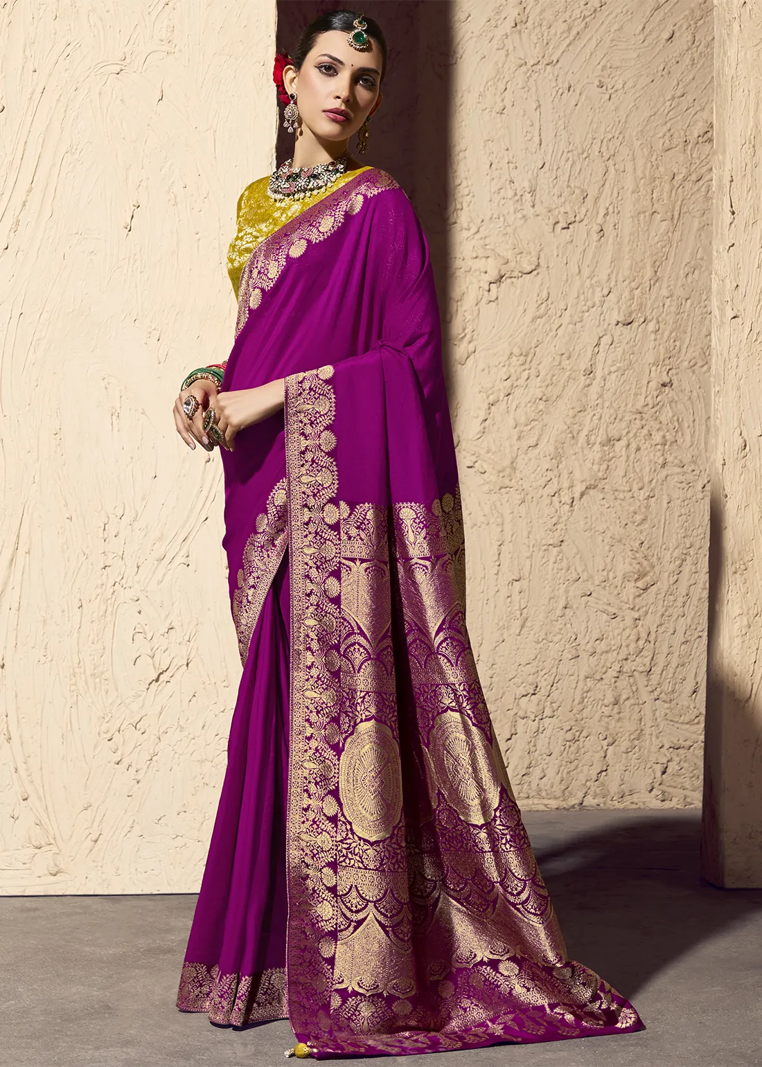 Magenta Georgette Banarasi Saree with Golden Zari