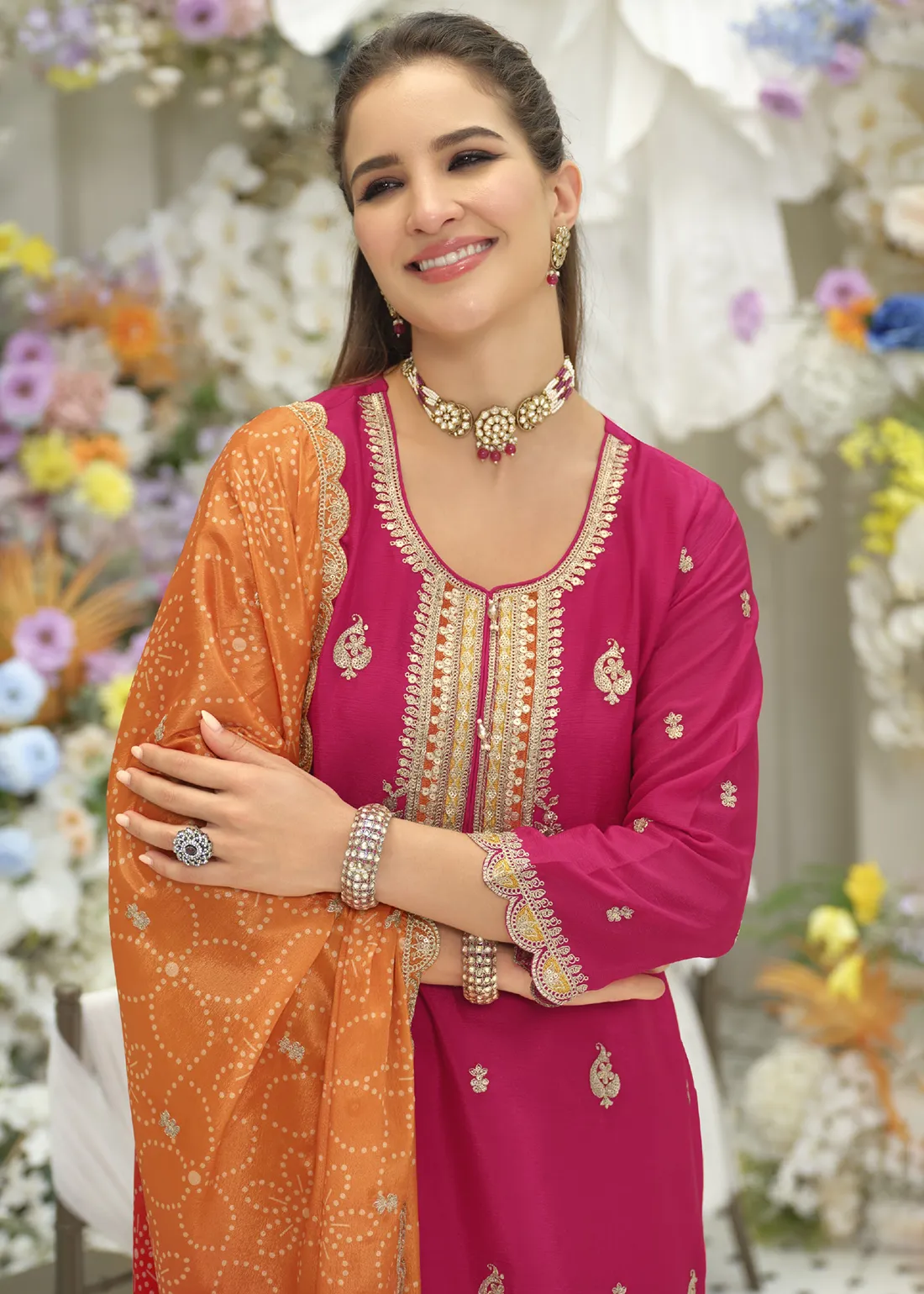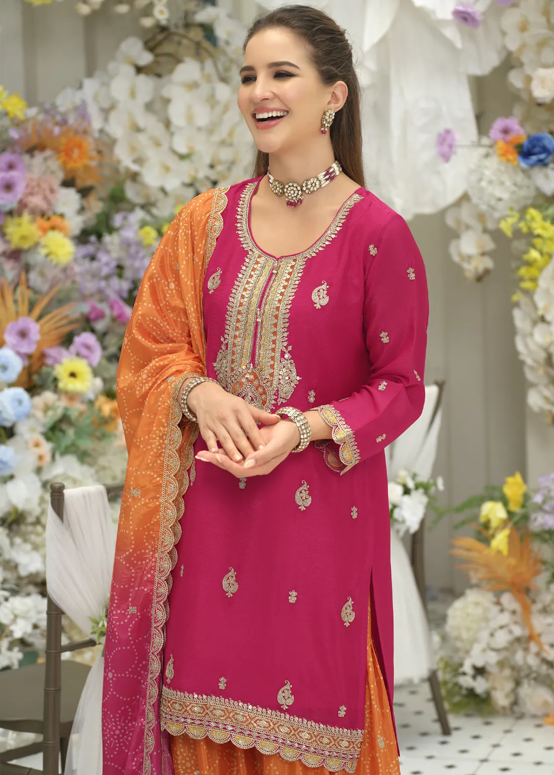 Magenta & Orange Embroidered Chinon Sharara Suit