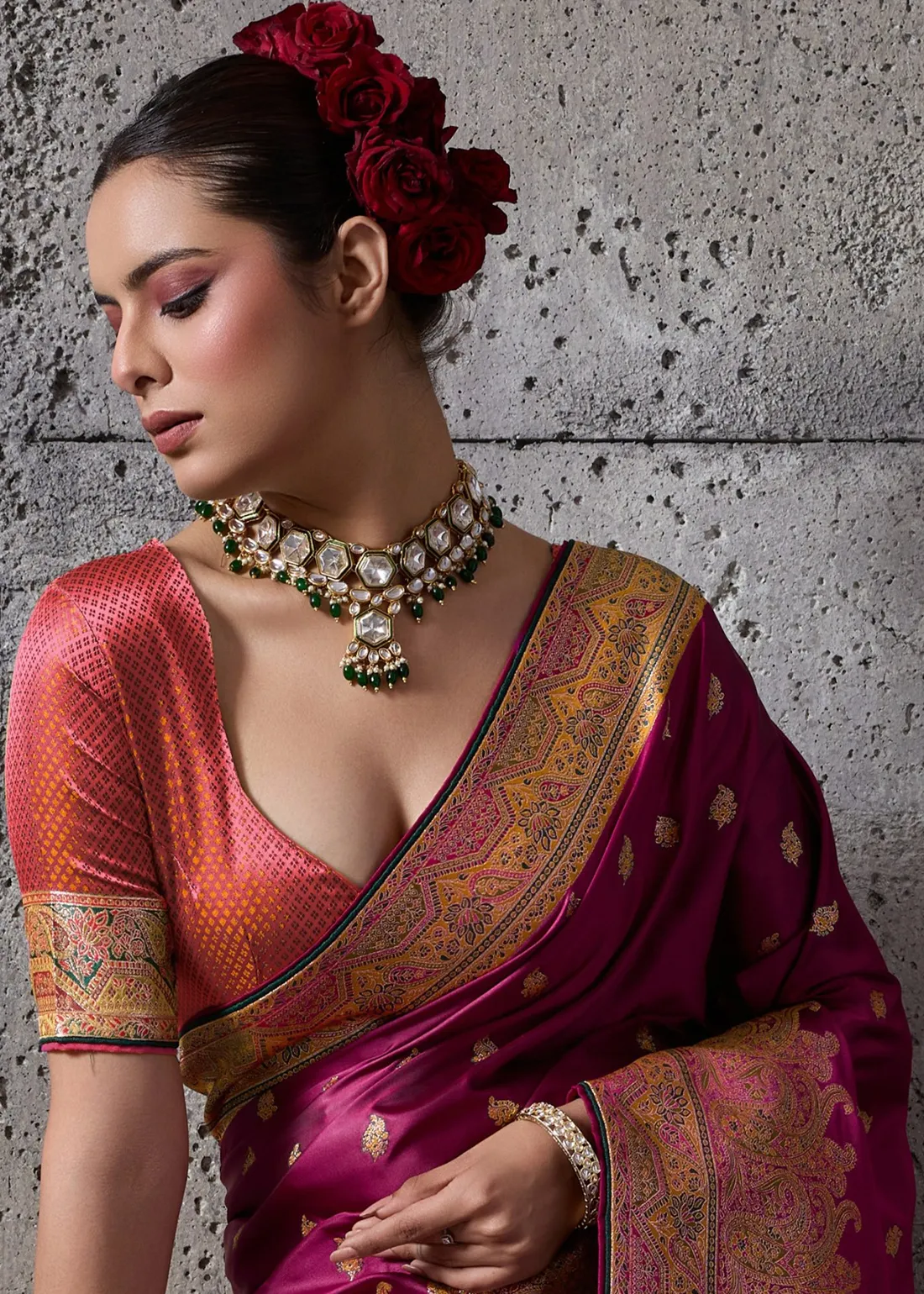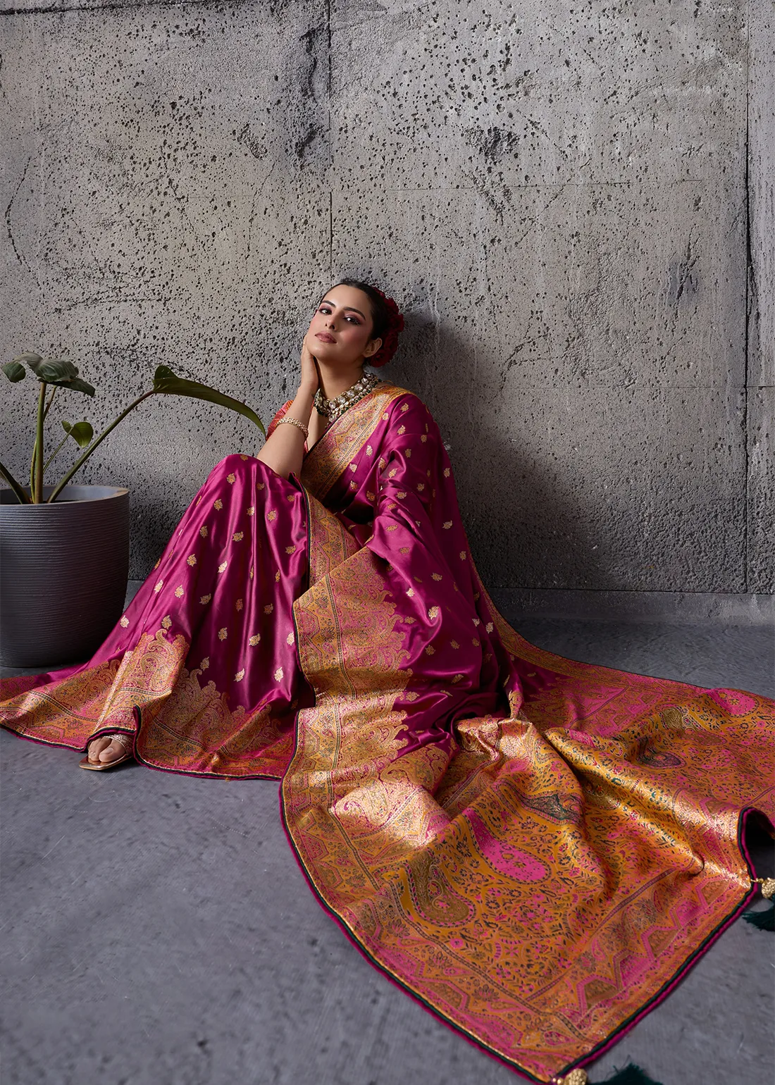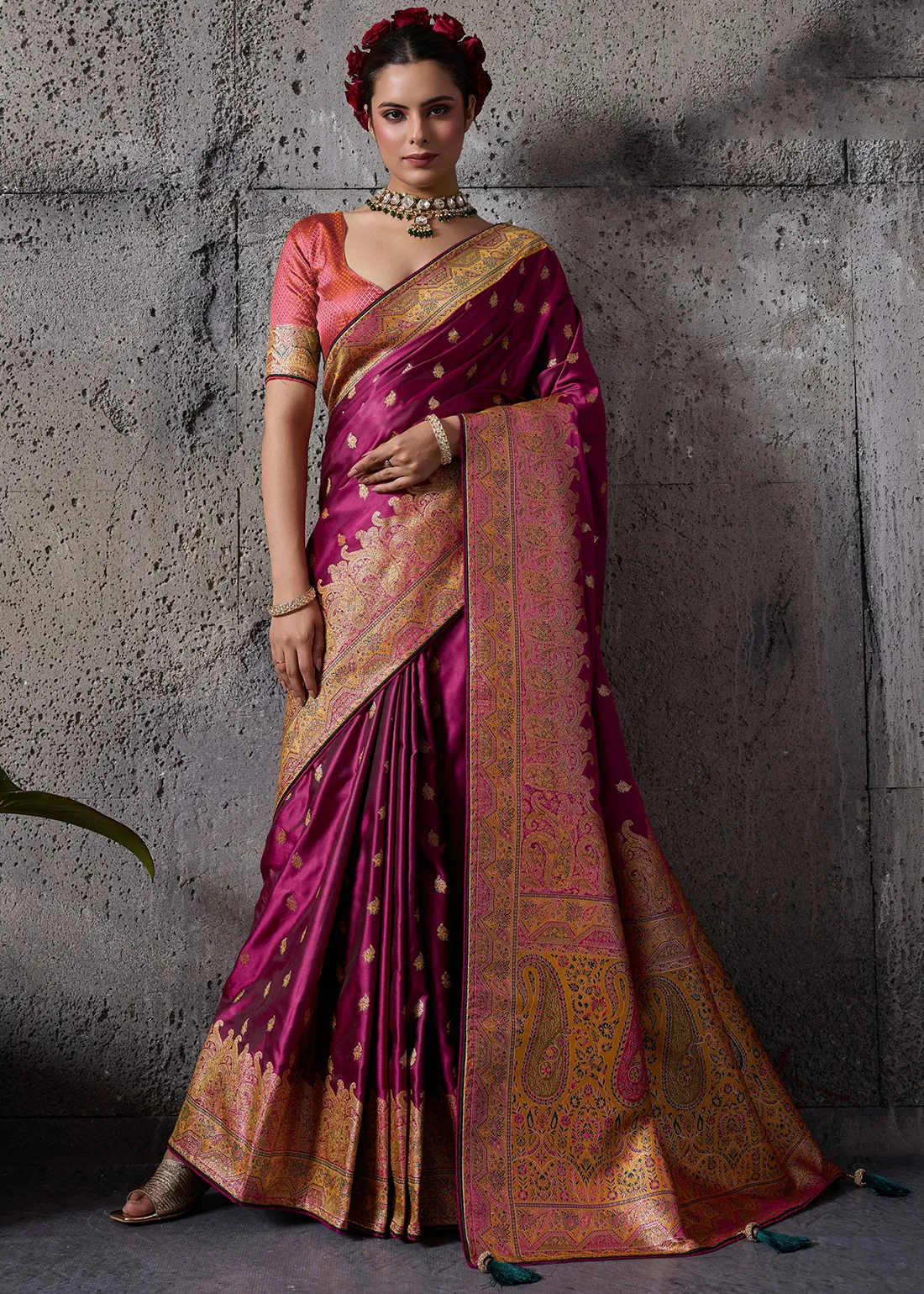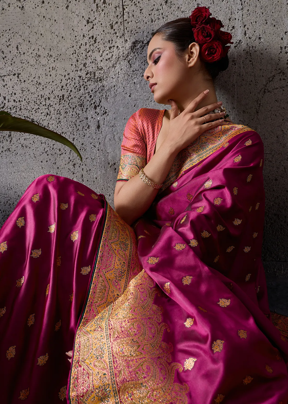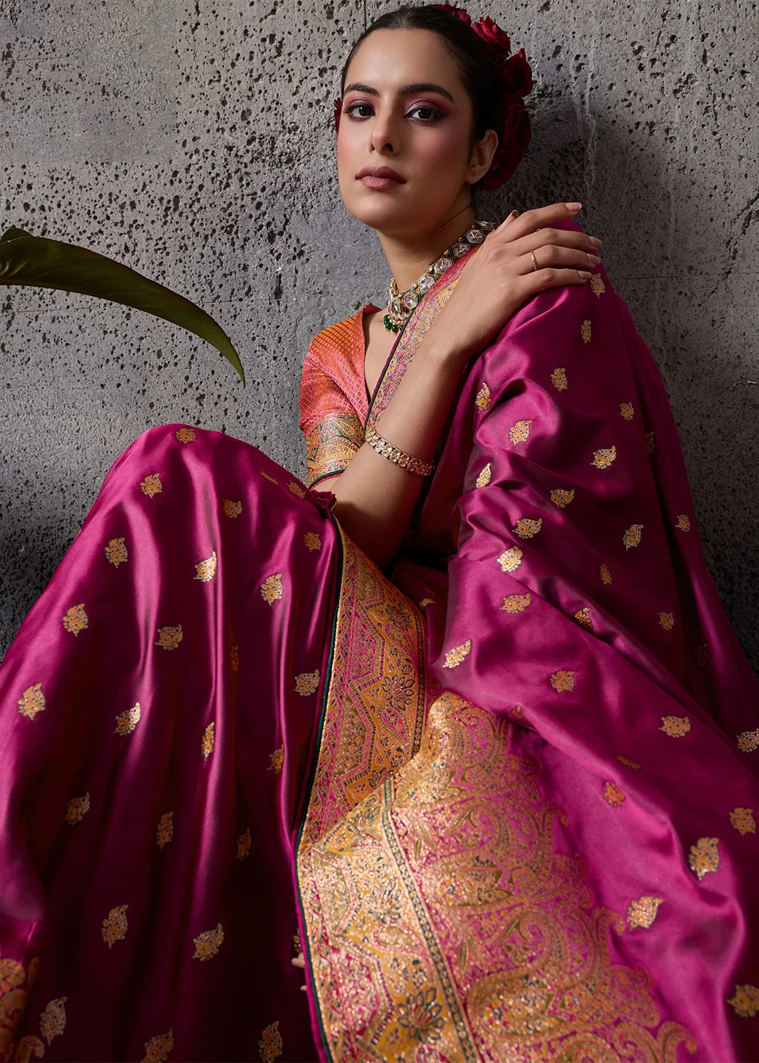 Saree: Command attention with this magnificent Deep Magenta Satin Silk Banarasi Saree. The ultra-smooth, glossy satin silk drapes beautifully, providing a luminous and incredibly rich canvas adorned with delicate golden zari bootis. The true masterpiece is the grand, heavy zari woven border and sweeping pallu, intricately detailed with exquisite Meenakari work. The colorful thread accents breathe life into the traditional paisley and floral motifs, offering a bespoke, couture-level finish. This drape is the ultimate choice for evening receptions, grand weddings, and luxurious festive galas.