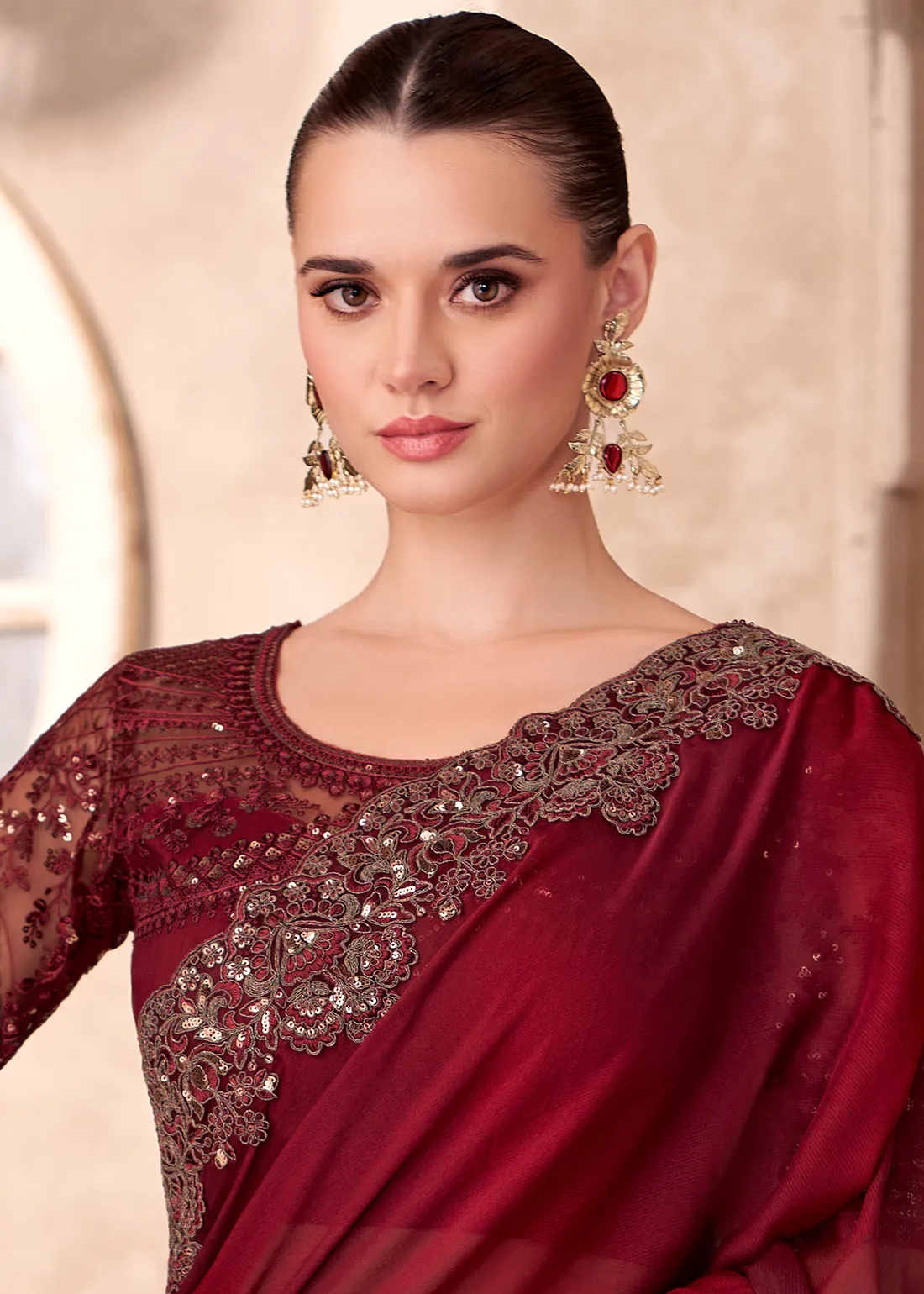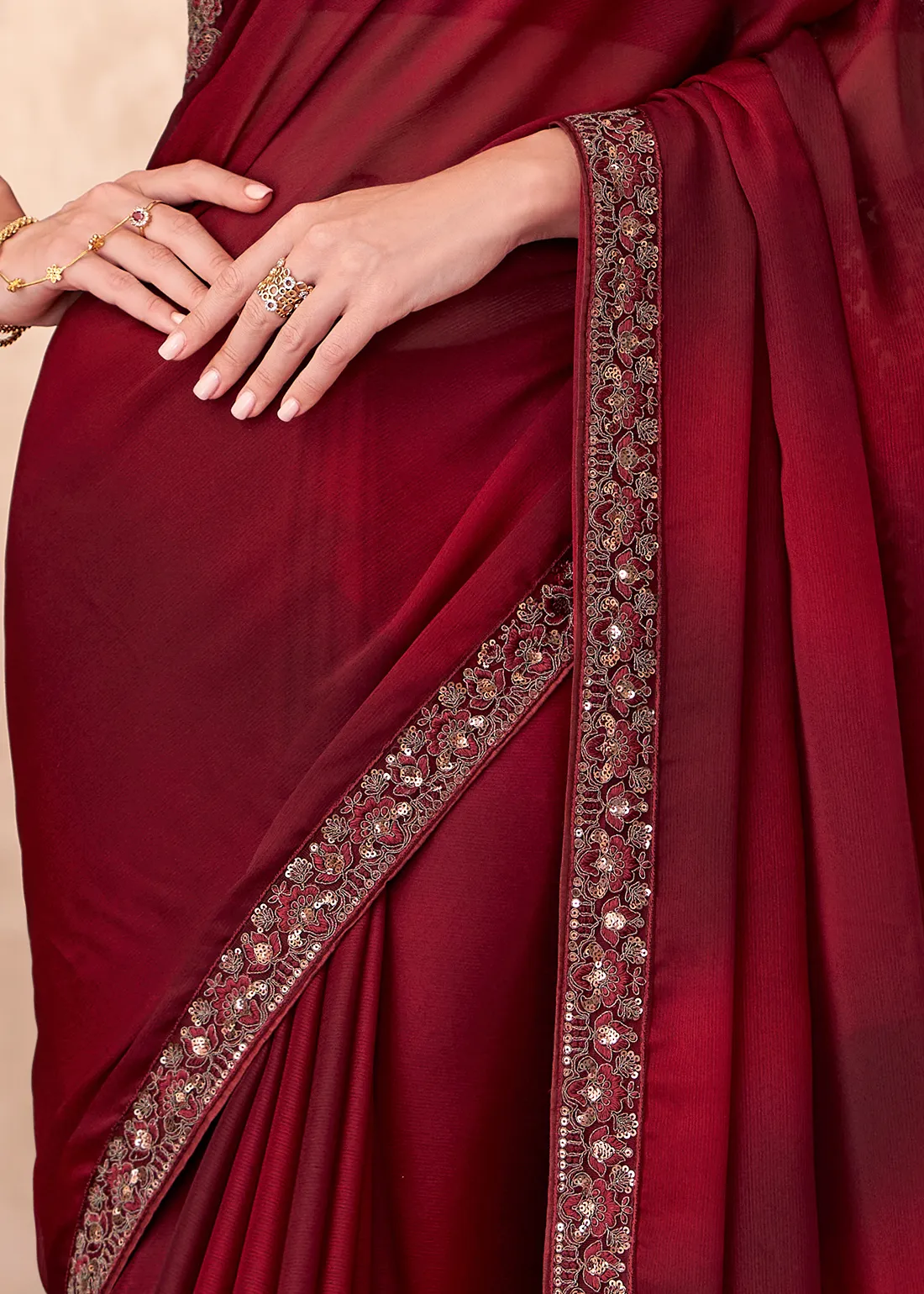 Maroon Embroidered Chiffon Saree with Embroidered Blouse