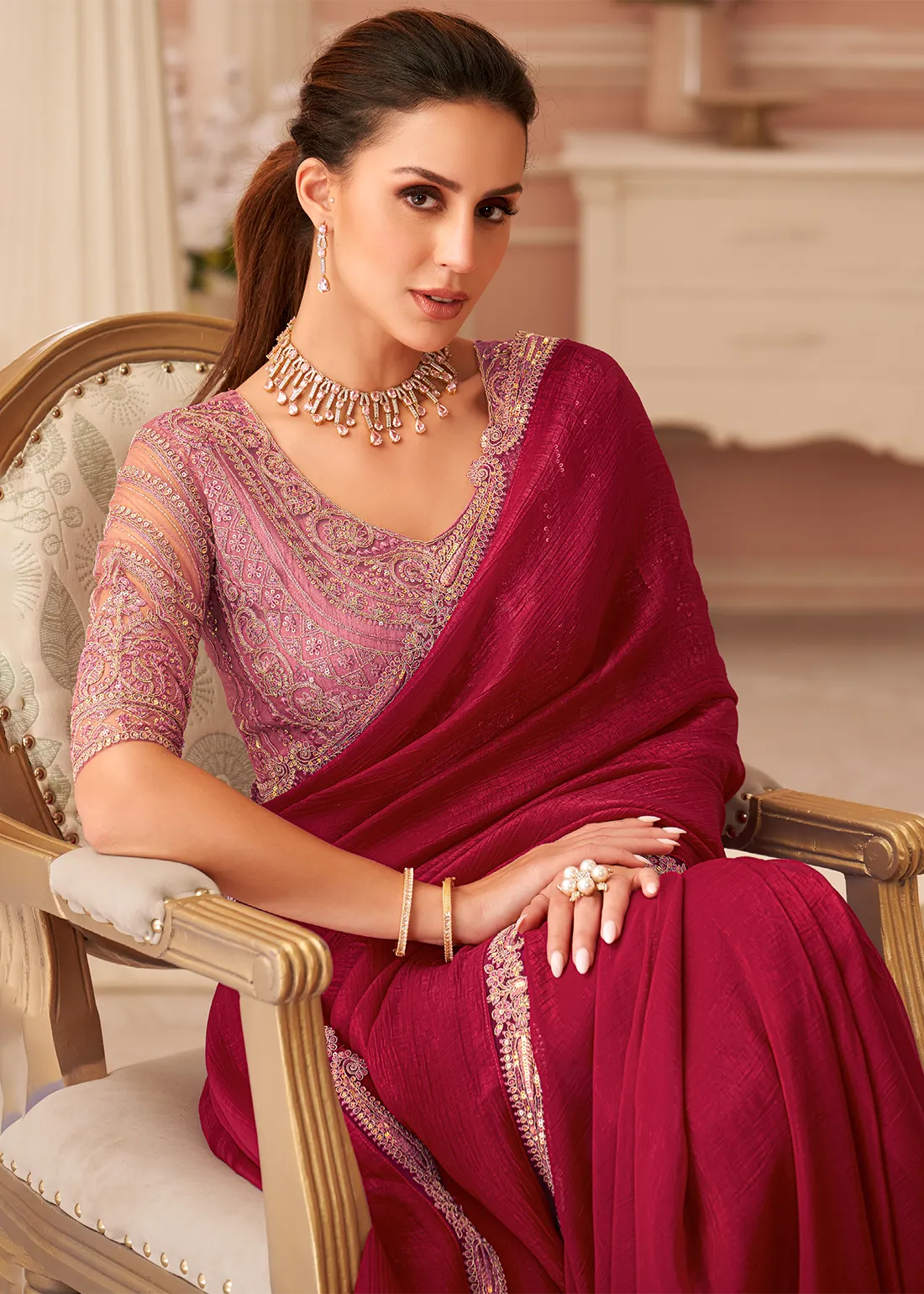 Maroon Embroidered Chiffon Saree with Pink Embroidered Blouse