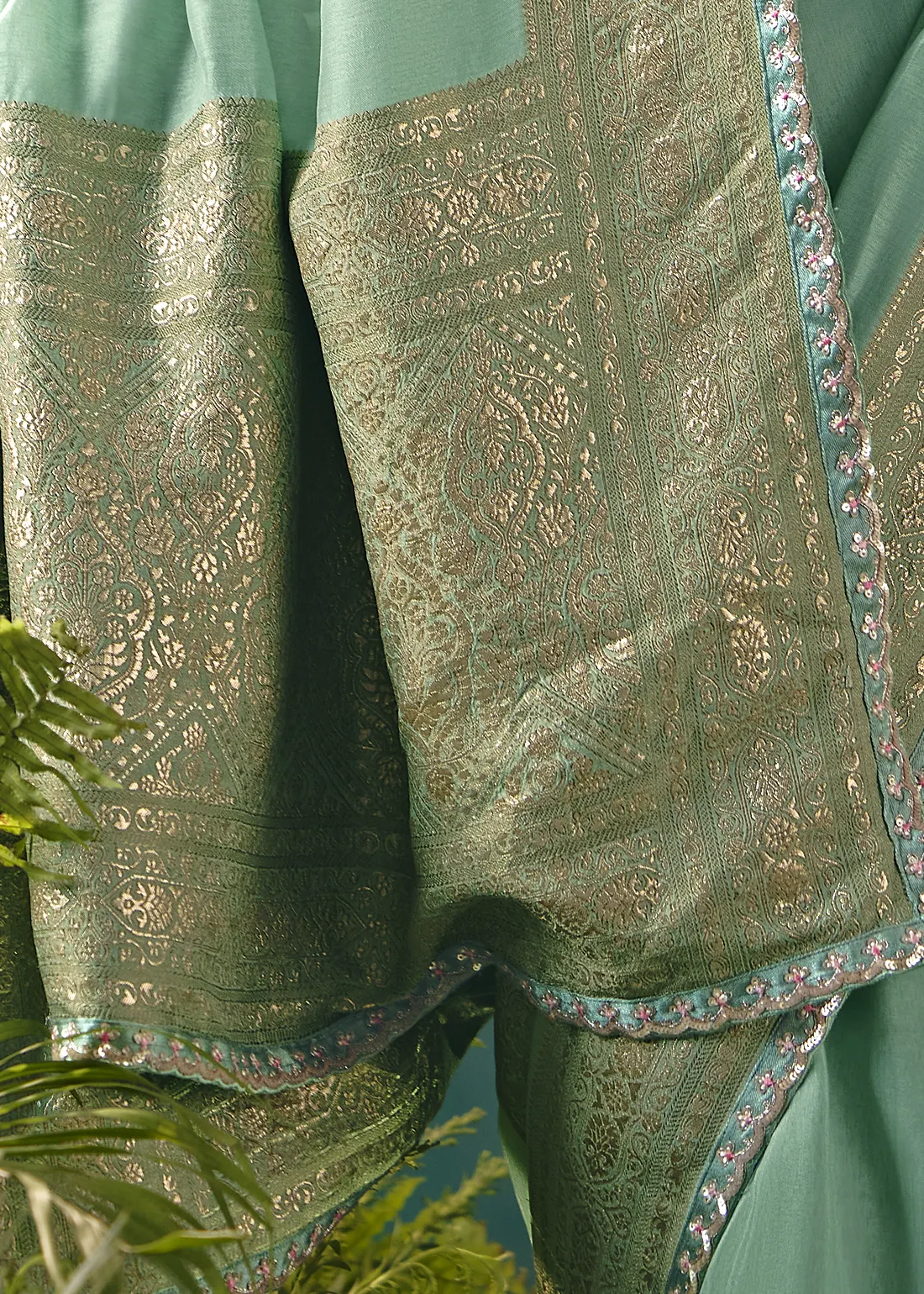 Mint Green Banarasi Dola Silk Saree with Embroidered Pink Blouse
