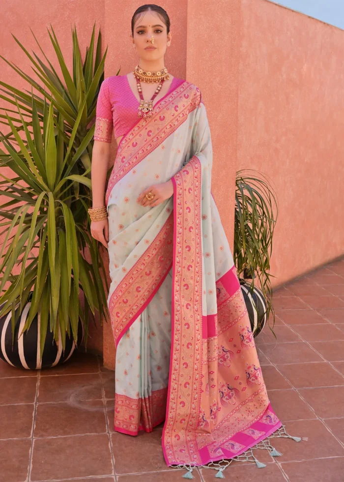■ This exquisite Mint Green Paithani Silk Saree is a timeless masterpiece crafted with unwavering devotion and love.