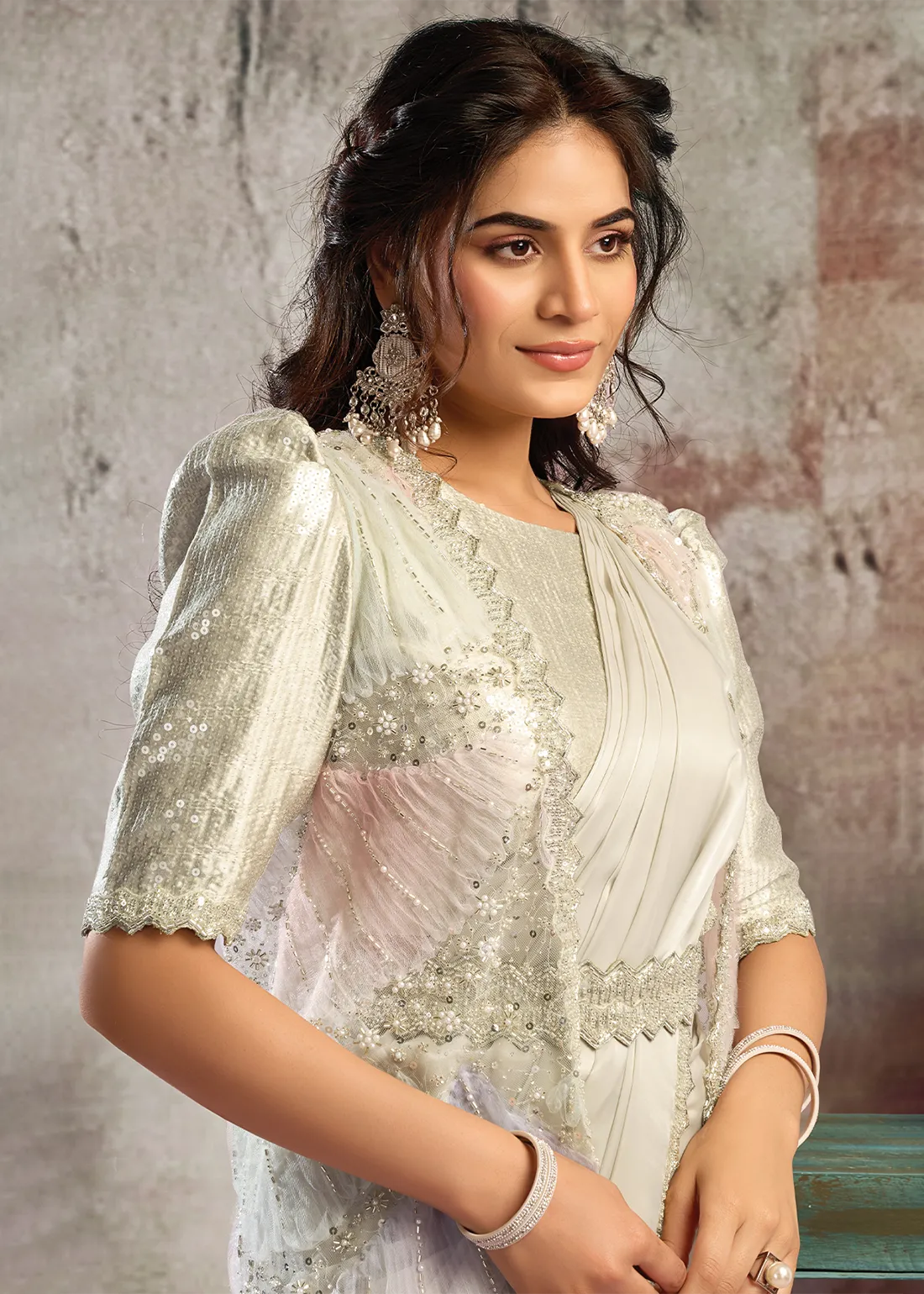 Set Content: Saree with Stitched Blouse, Shrug, and Belt.