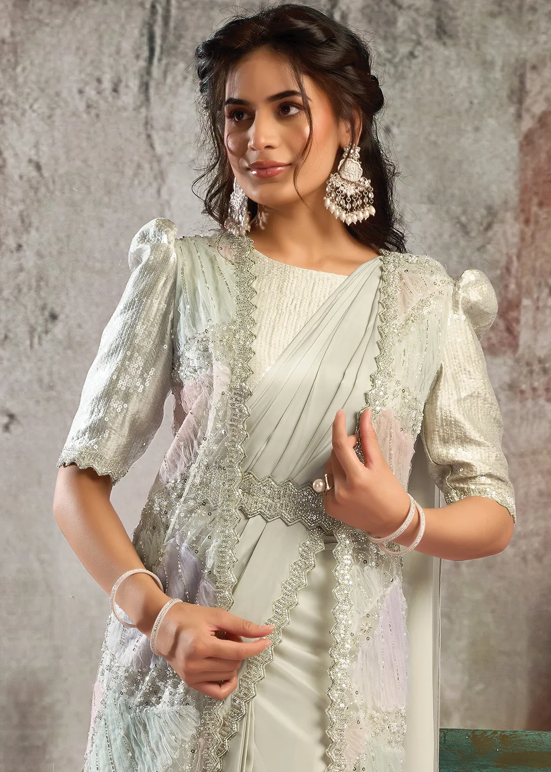 Mint Green Ready to Wear Satin Saree with Shrug & Belt
