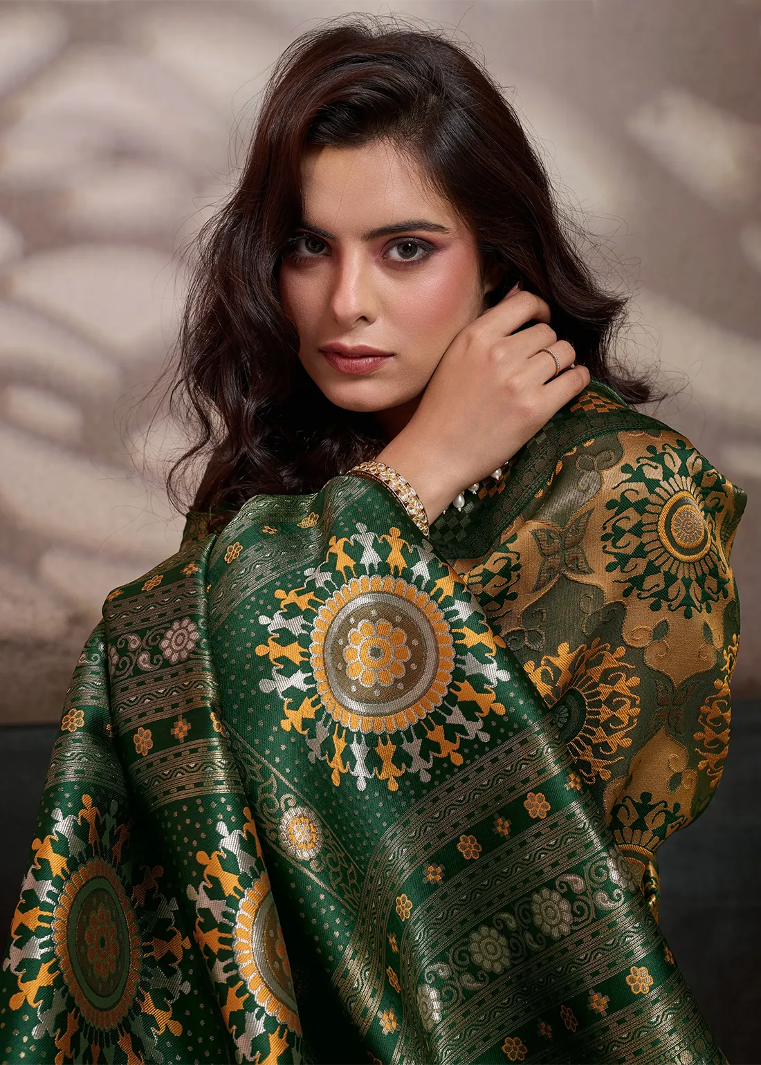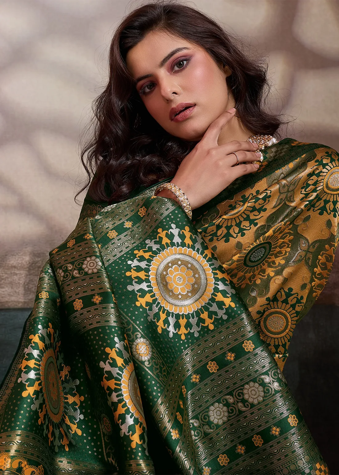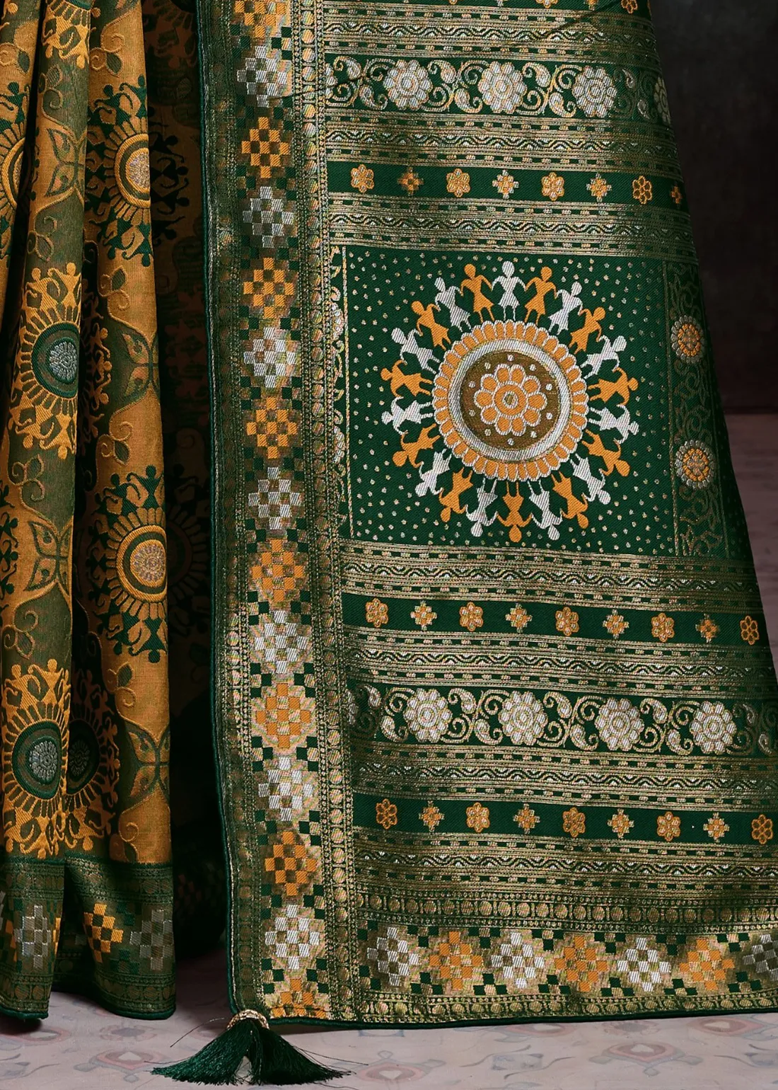 Mustard Yellow Banarasi Saree with Bottle Green Kalamkari Motifs