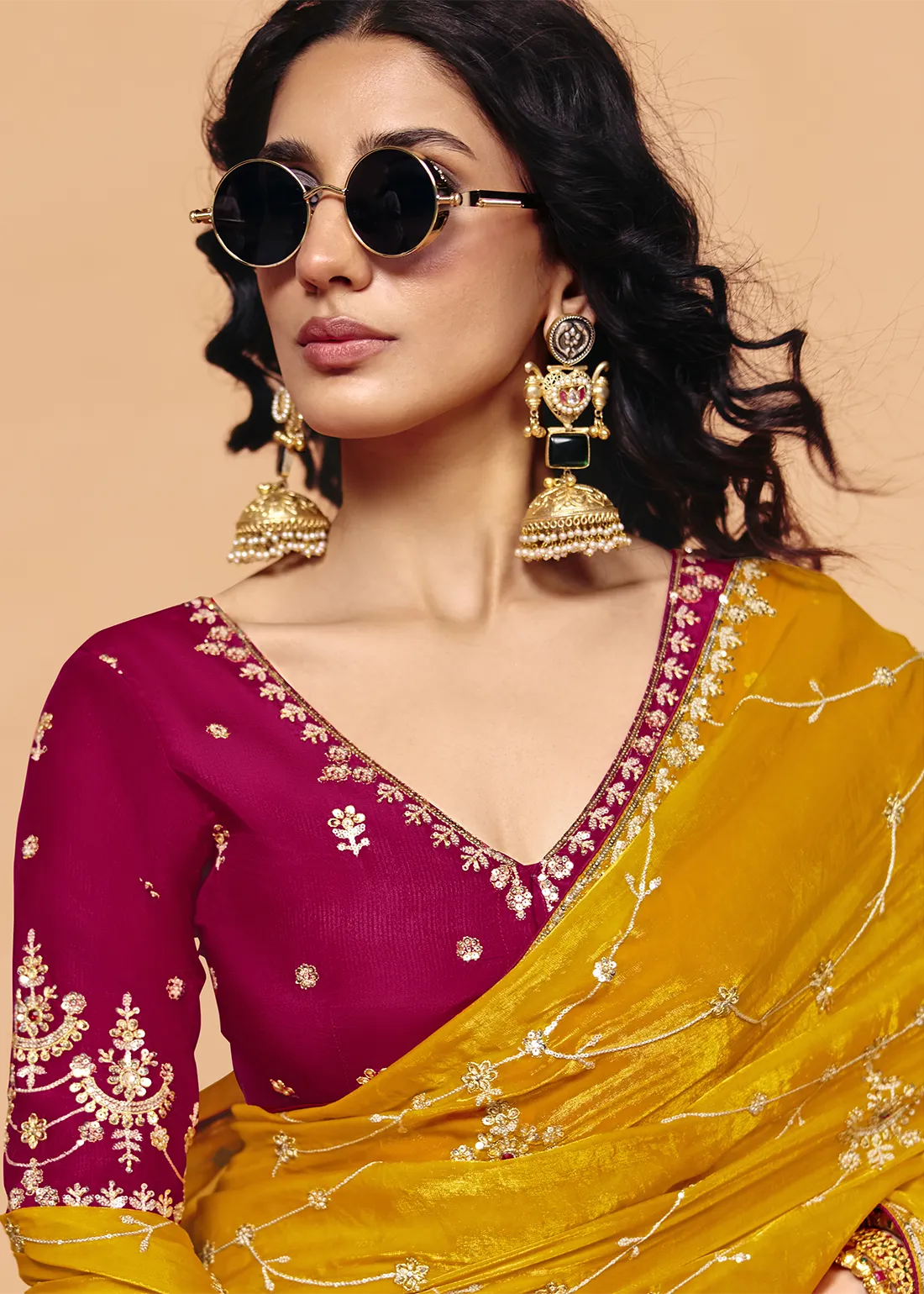 Blouse: Includes a striking contrast Deep Magenta unstitched blouse piece that brings a regal pop of color to the ensemble. Featuring coordinating floral sequin and stone embroidery along the sleeves and a beautifully detailed neckline, it allows you to tailor a flawless, high-fashion designer look that perfectly offsets the bright yellow drape.