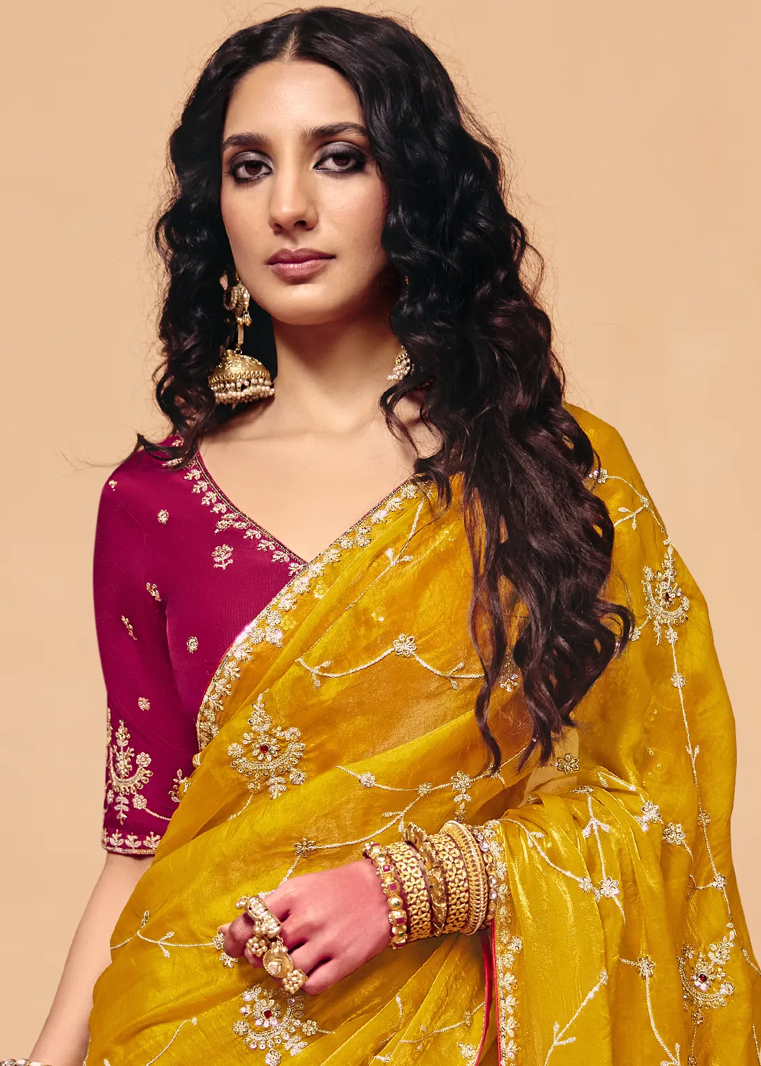 Mustard Yellow Embroidered Organza Saree with Magenta Blouse