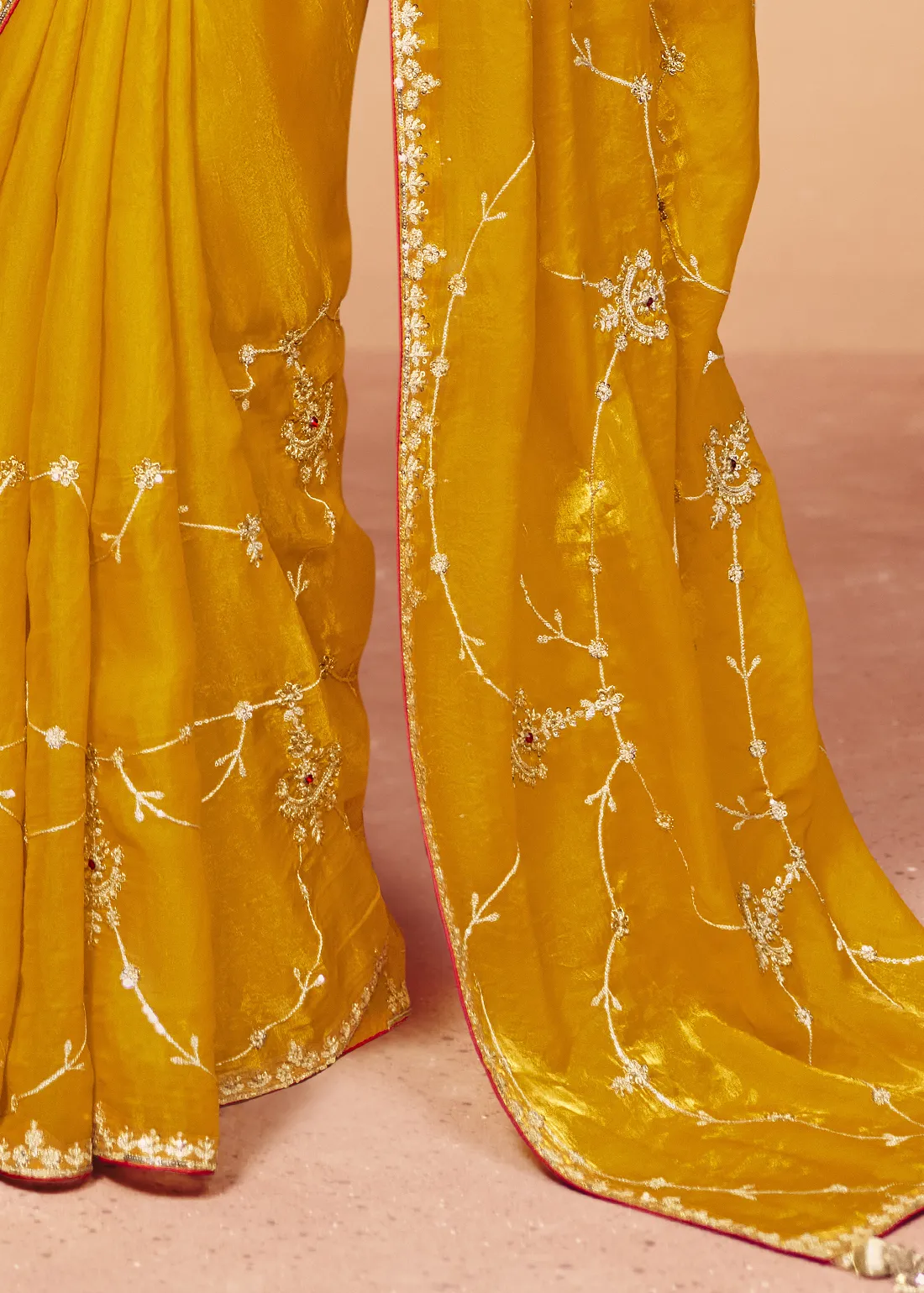 Saree: Radiate joy and festive energy with this breathtaking Mustard Yellow Embroidered Organza Saree. The sheer, lightweight drape of premium organza provides a bright, luminous canvas beautifully framed by a delicately detailed border. Hand-embellished with shimmering sequins, intricate stone detailing, and elegant trailing floral threadwork, this masterpiece perfectly balances traditional vibrancy with modern glamour. It is the ultimate statement piece for Haldi ceremonies, daytime weddings, and joyous festive celebrations.