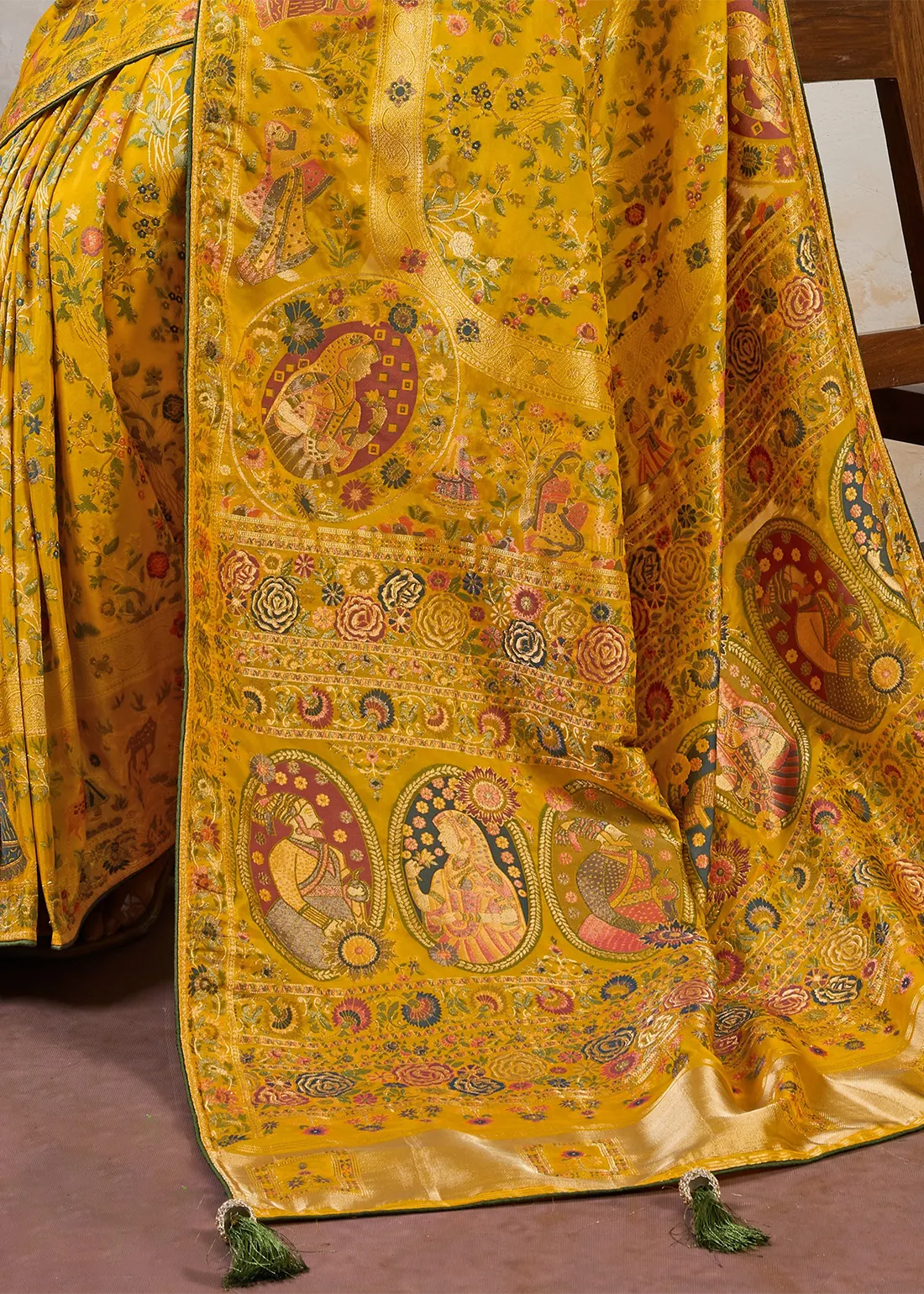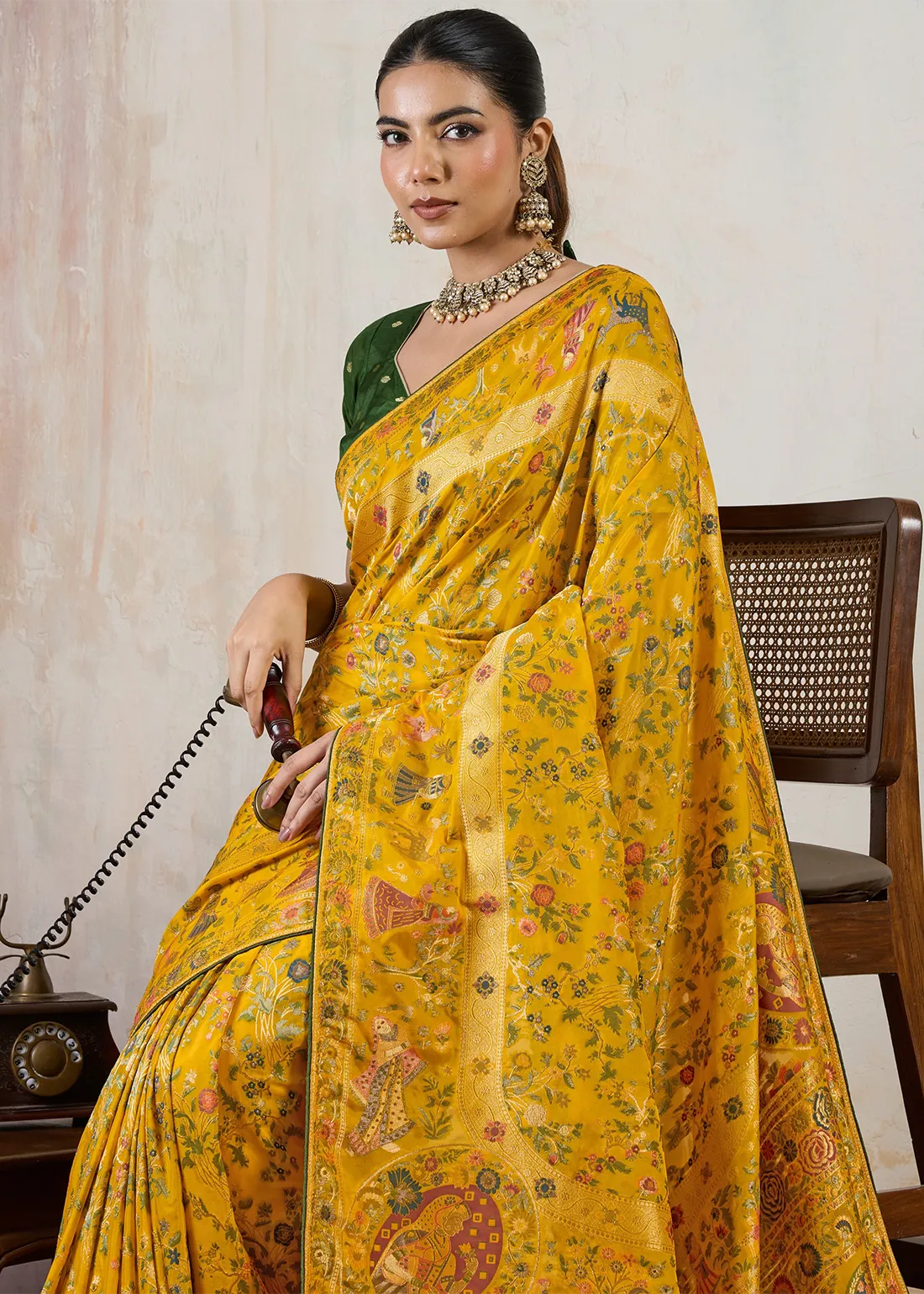 Step into the grandeur of timeless craftsmanship with this Mustard Yellow Banarasi Silk Saree, intricately handwoven using the rare 11-shade Meenakari technique. Every thread tells a story of royal elegance—depicting Mughal-inspired miniature figures, florals, and paisleys, rendered in a mesmerizing palette of eleven interwoven hues. The saree’s artistic storytelling is enhanced by rich gold zari and finished with green piping and handcrafted tassels, while the emerald green zari blouse adds a regal contrast. A true heirloom creation, this saree is a collector’s piece—perfect for weddings, festive soirées, and cultural celebrations.