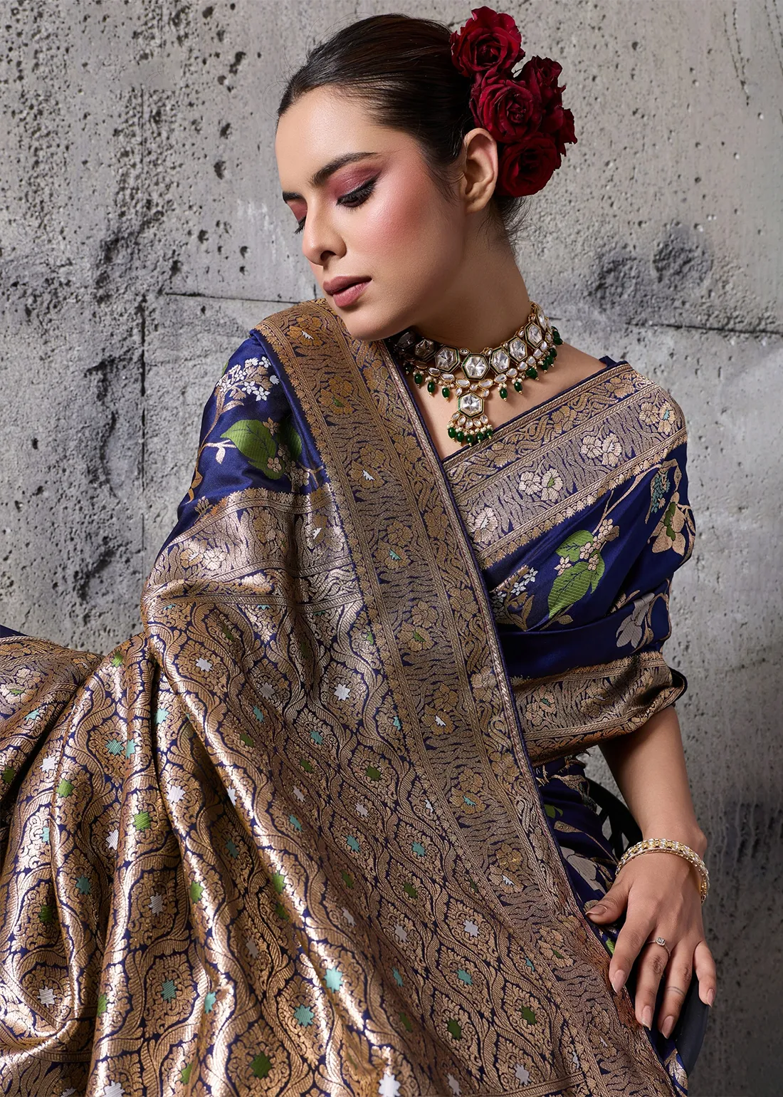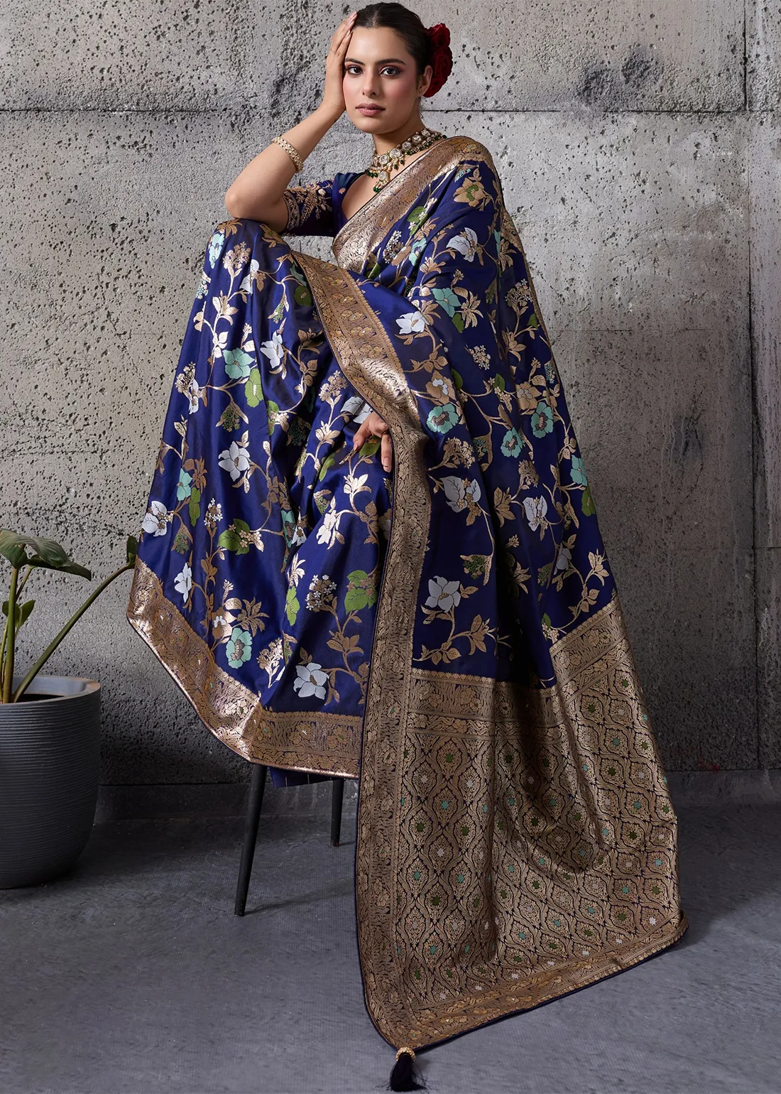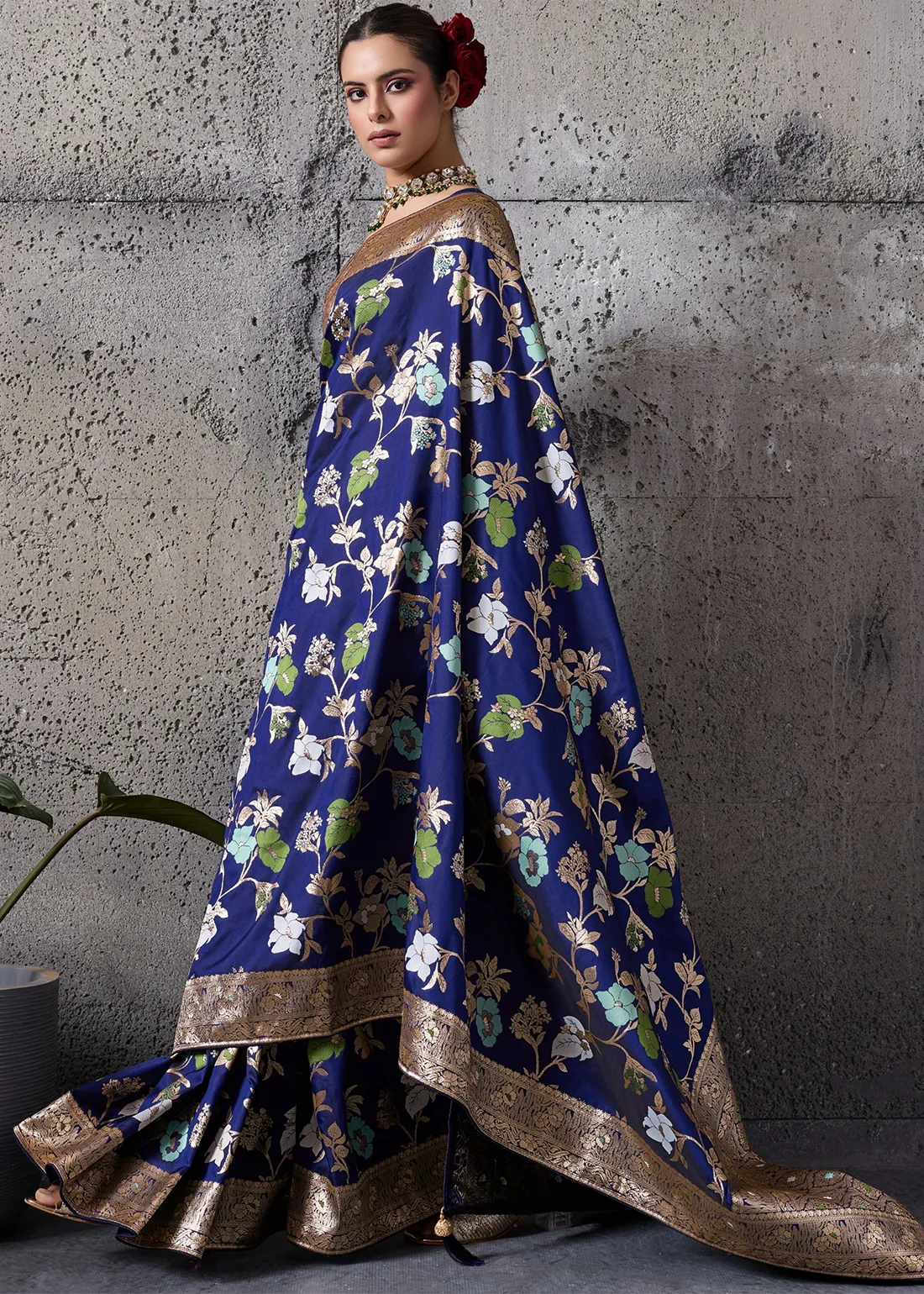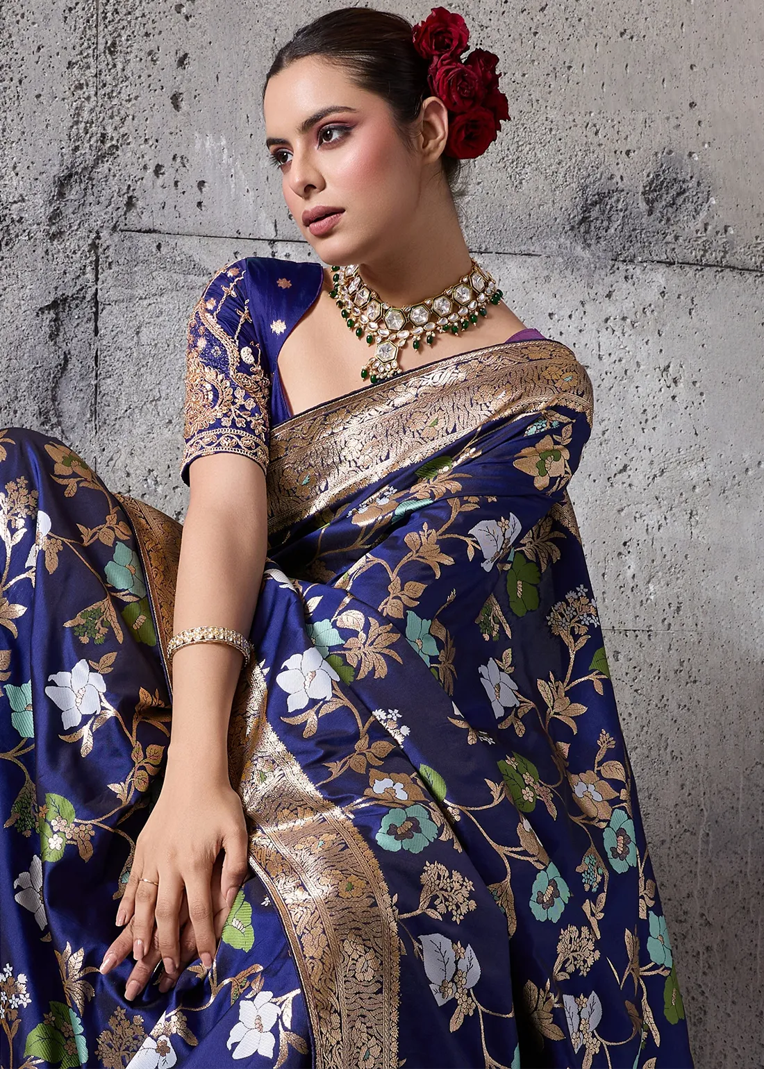 Saree: Embrace unparalleled elegance with this stunning Navy Blue Banarasi Silk Saree. Woven to perfection, the deep, lustrous base is beautifully detailed with delicate floral motifs in contrasting hues. The true highlight is the heavily brocaded gold zari border and sweeping grand pallu, reflecting the majestic heritage of authentic Banarasi craftsmanship. Perfect for evening weddings, grand receptions, and festive galas, this drape guarantees a highly sophisticated and regal silhouette.