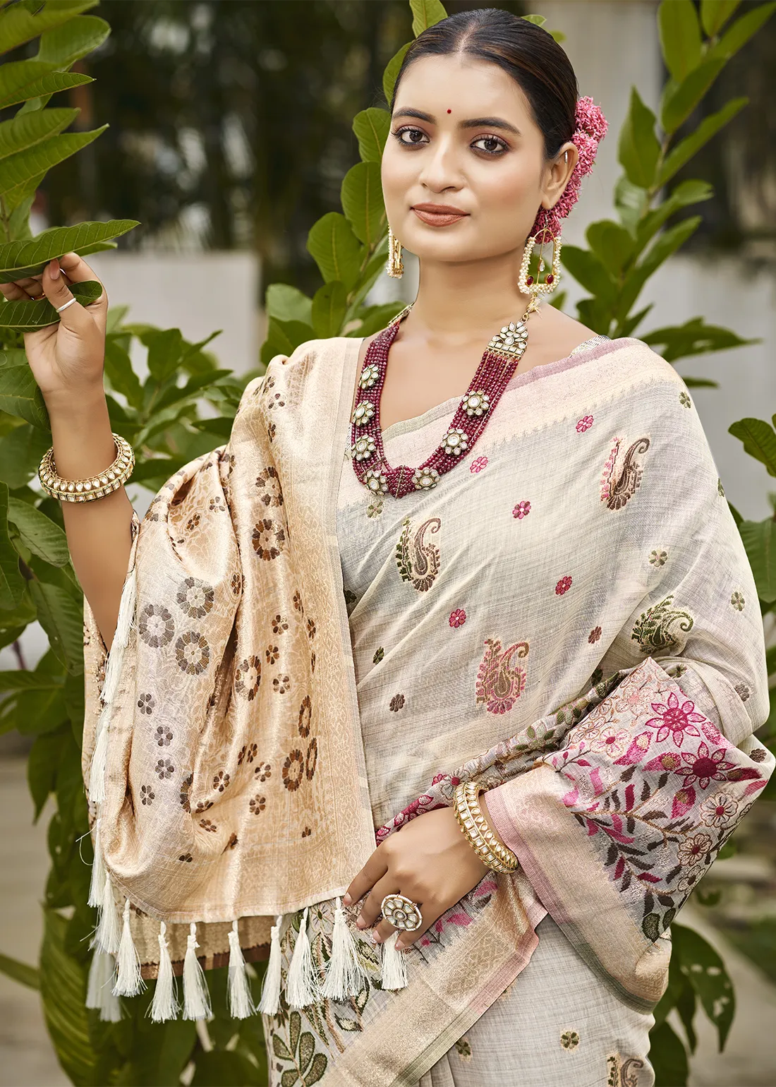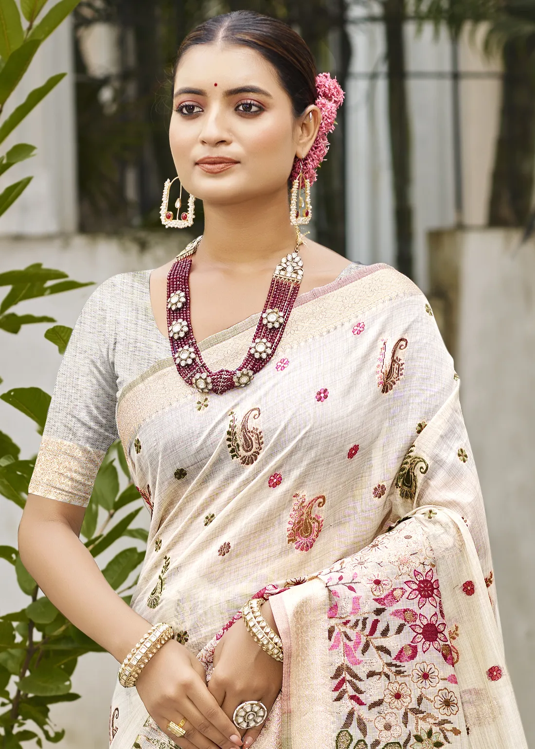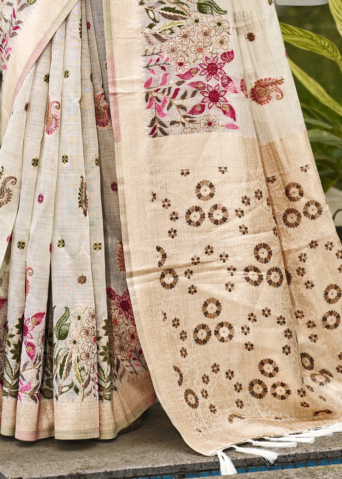 Ivory Linen Silk Banarasi Saree with Meenakari Floral Buttis
