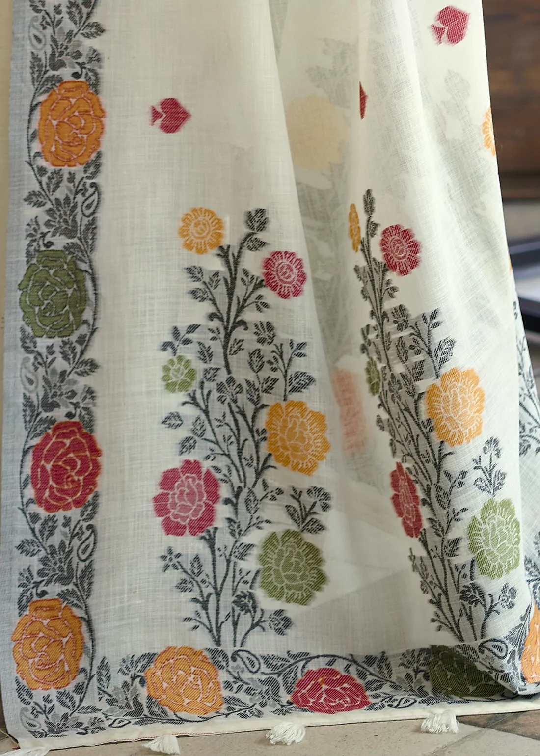 Off White Woven Linen Saree with Floral Motifs