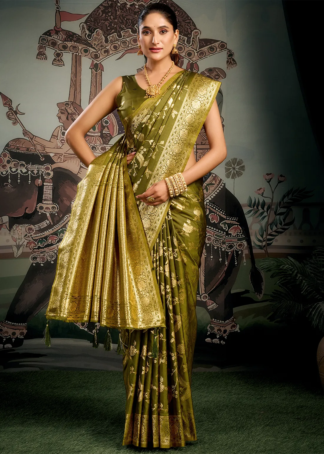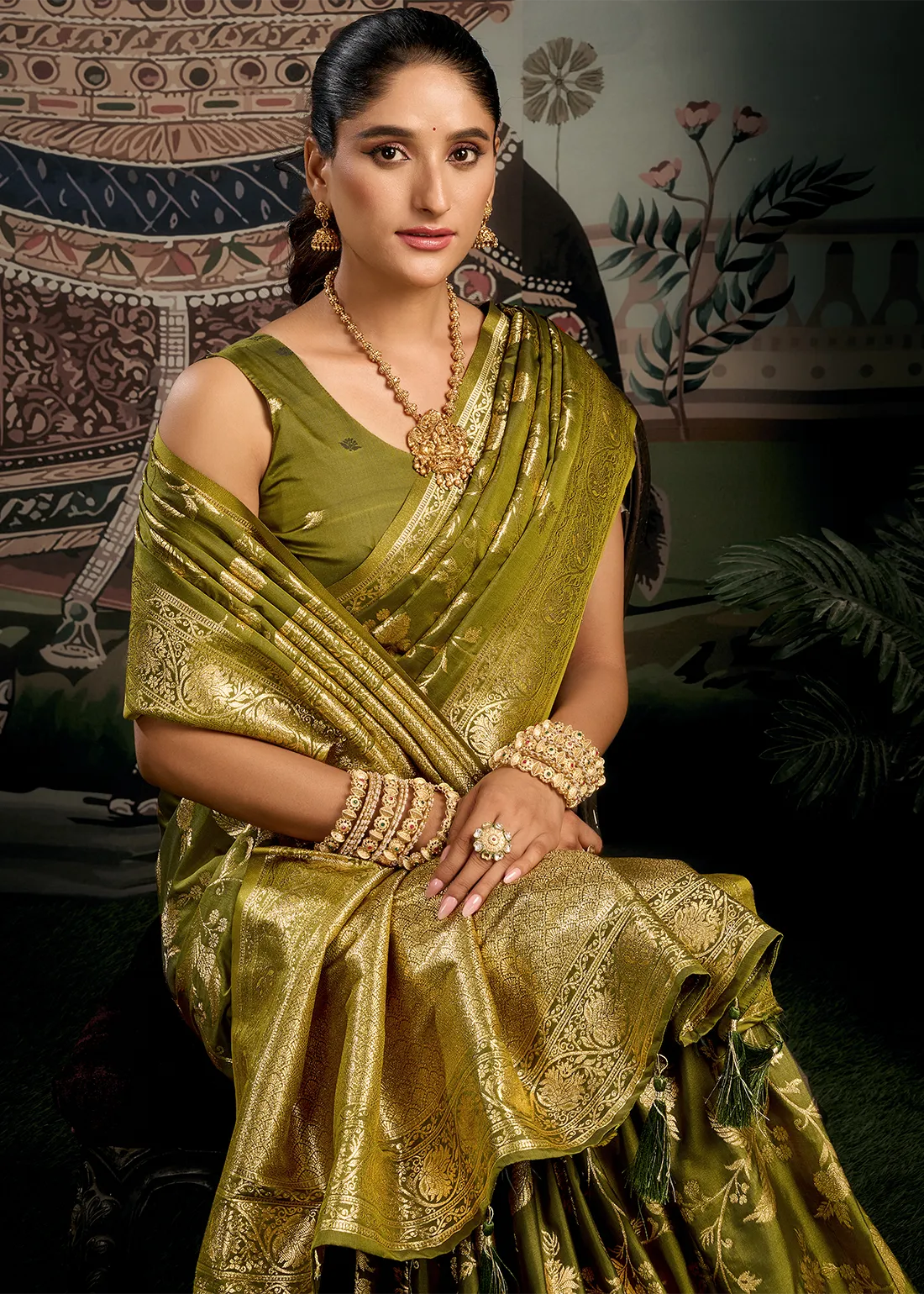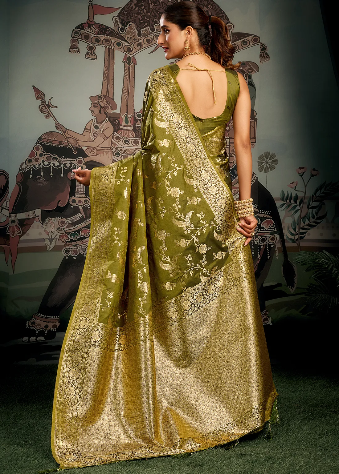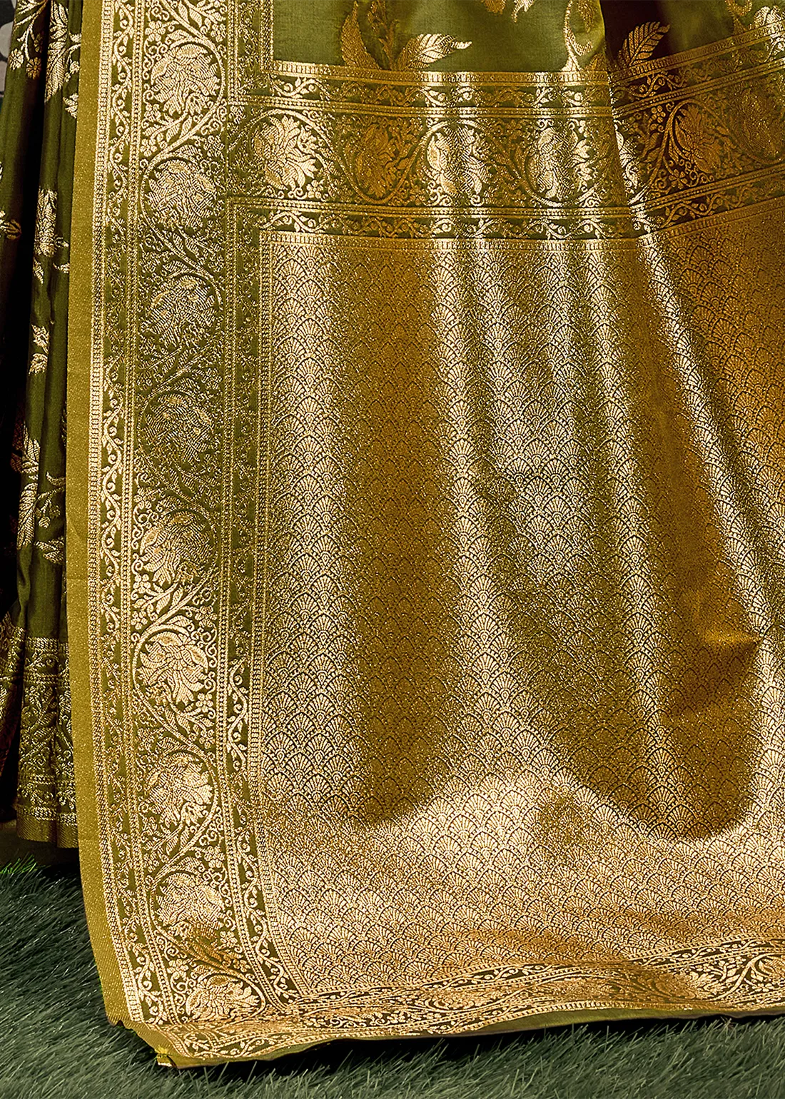 Olive Green Banarasi Silk Saree with Golden Zari Weaving