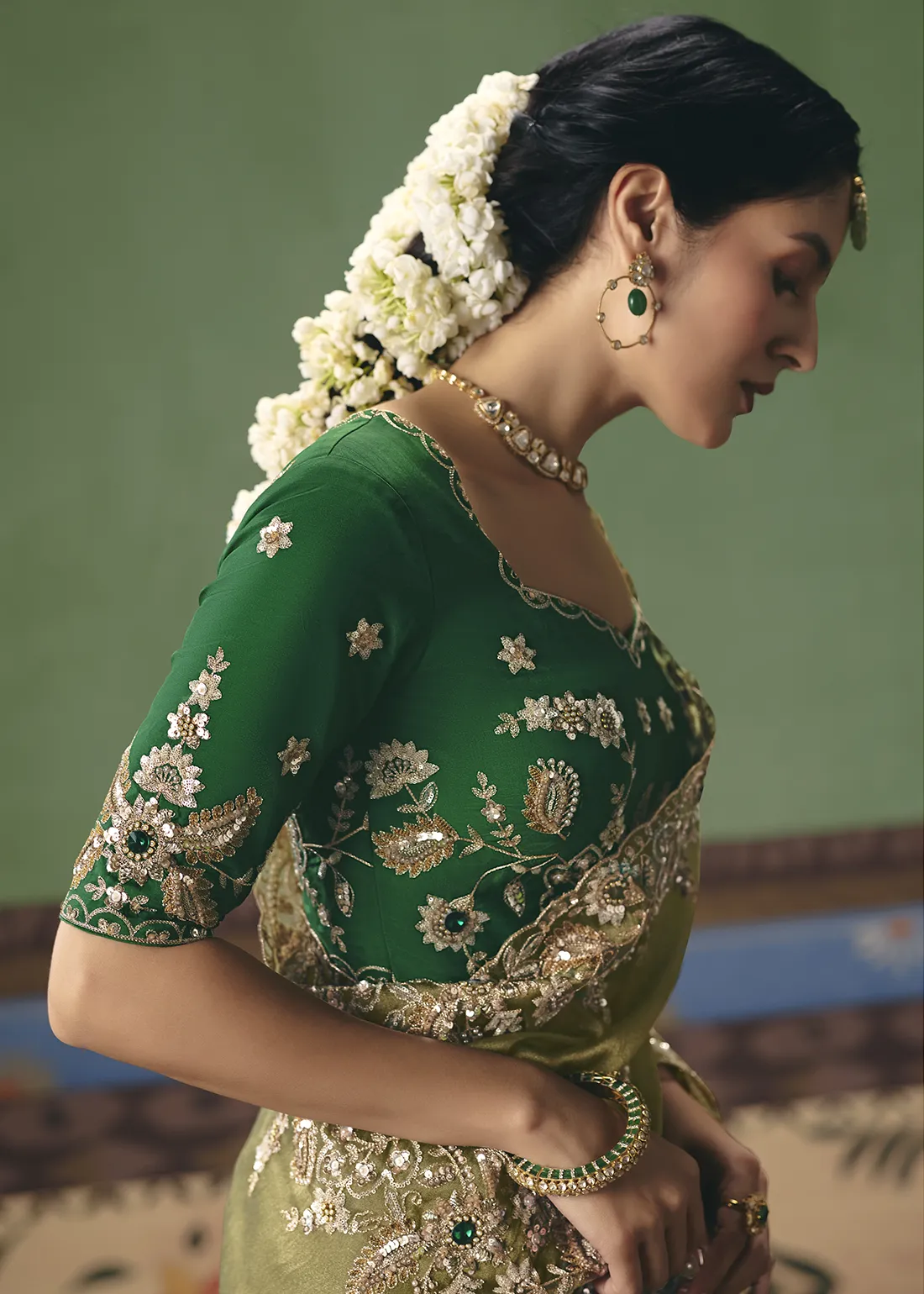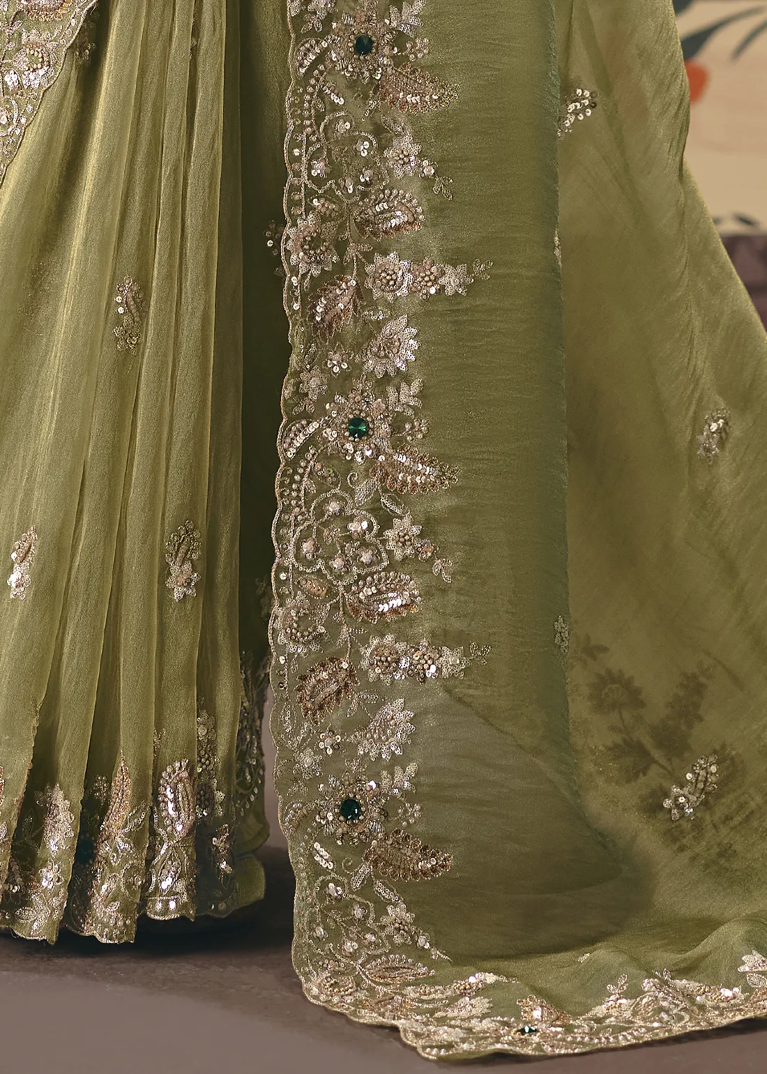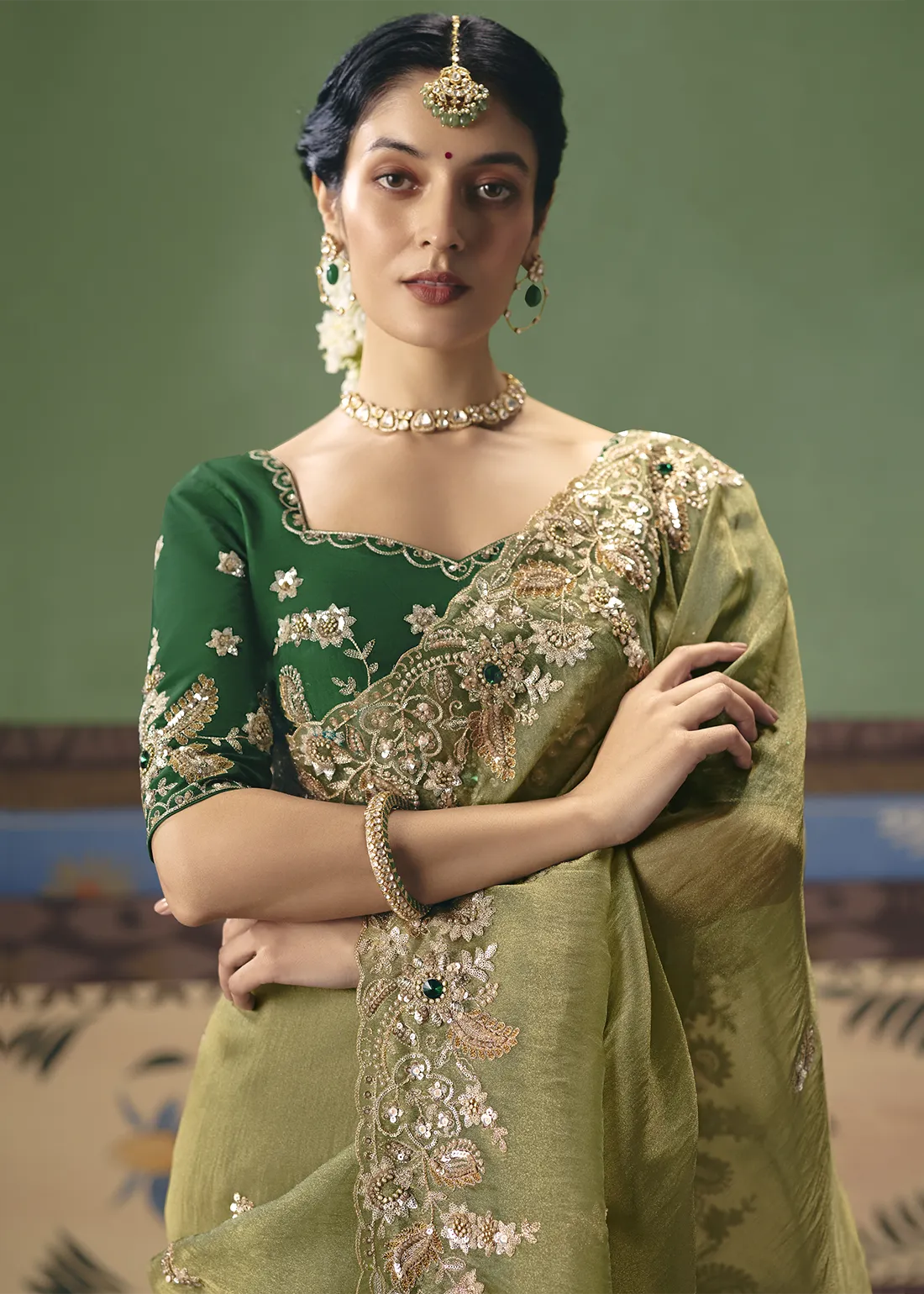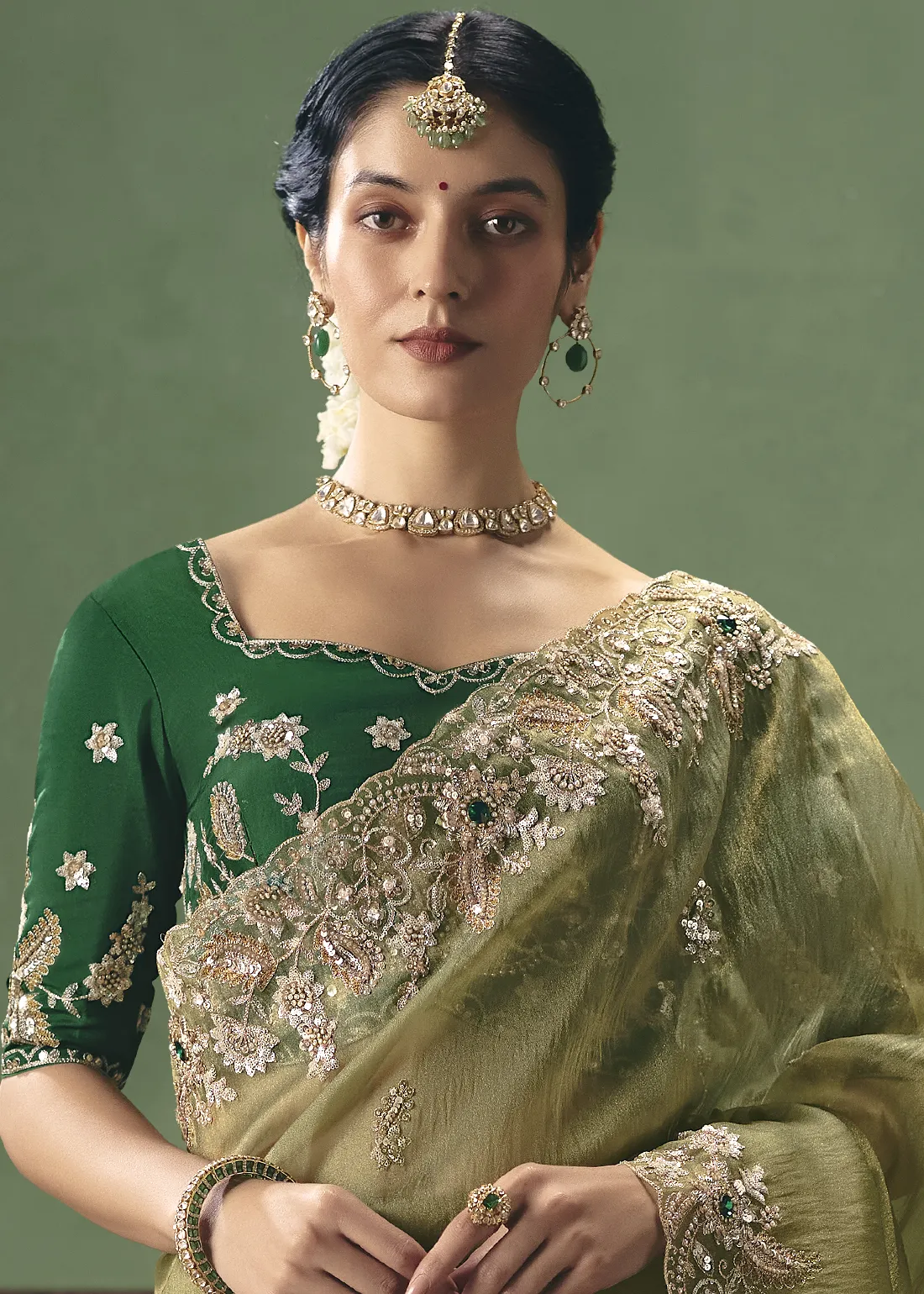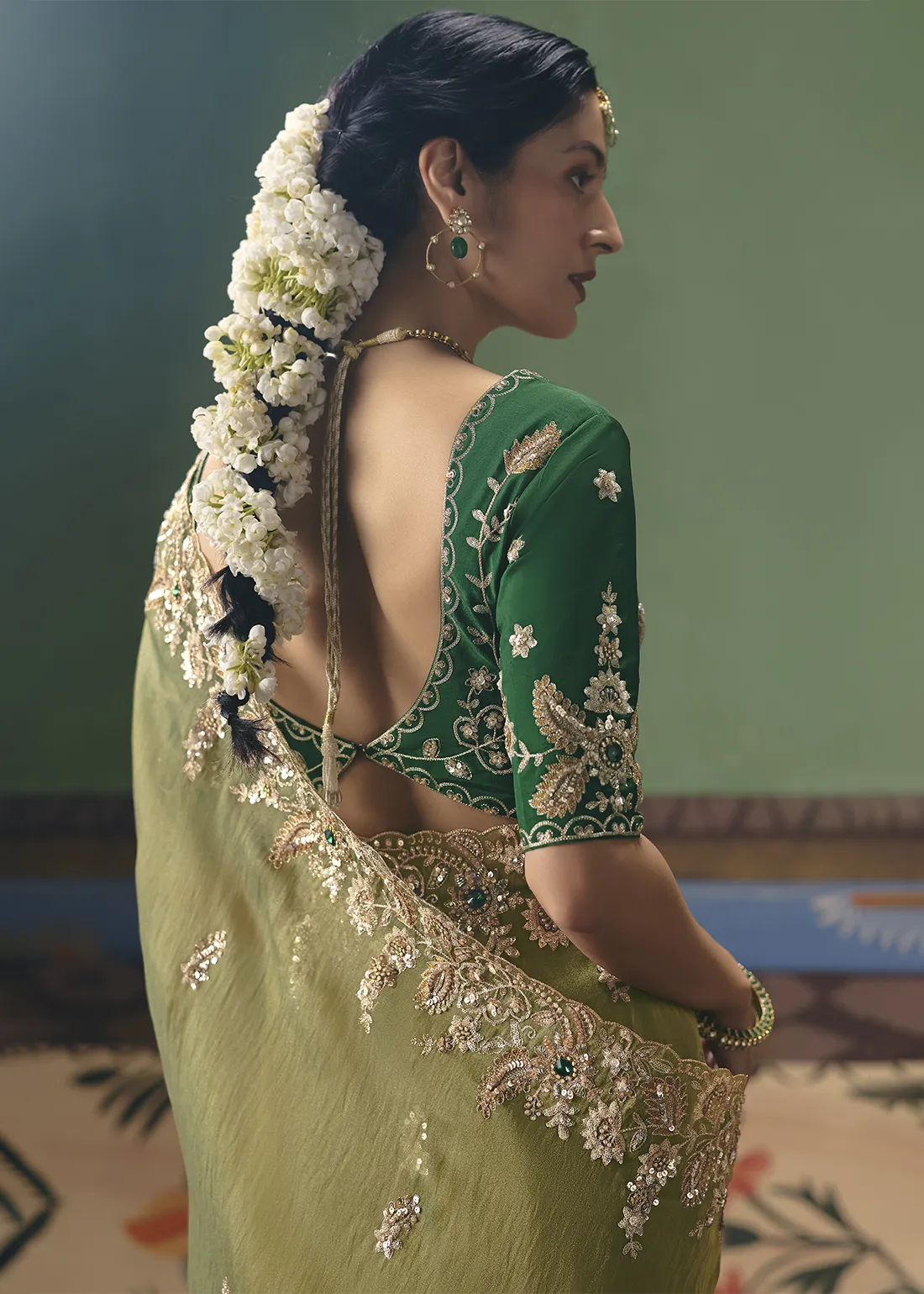 Olive Green Embroidered Organza Saree with Emerald Blouse