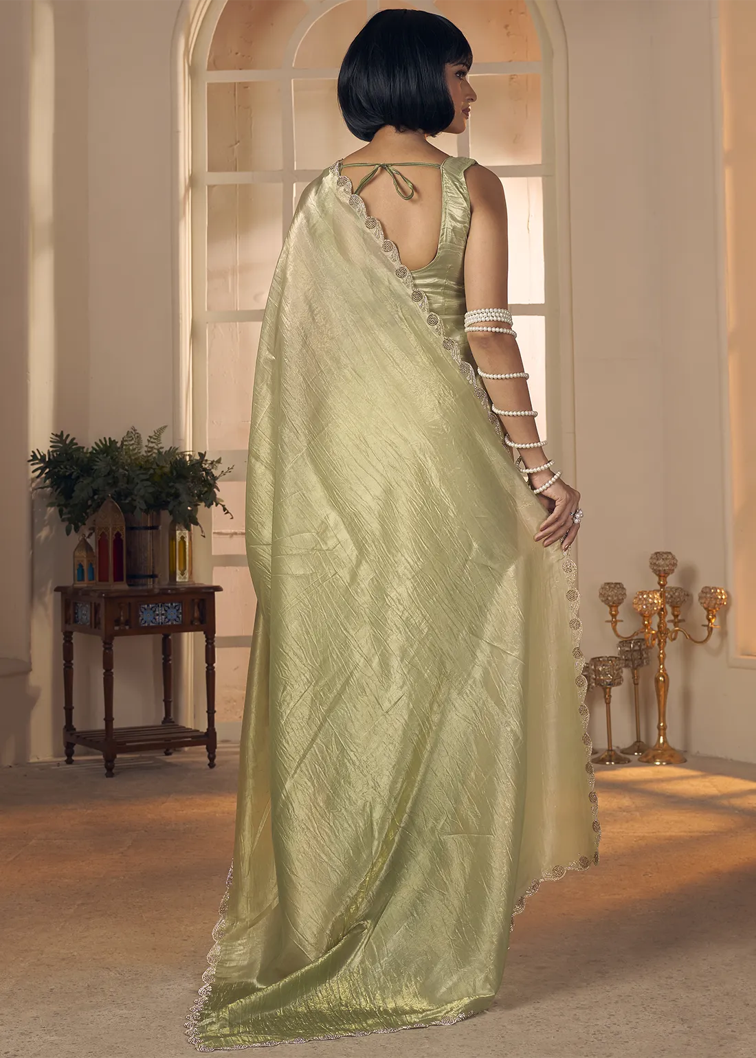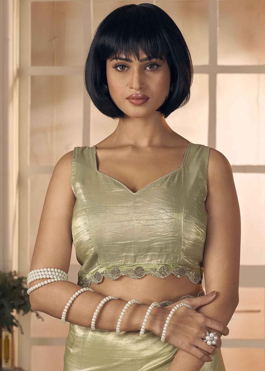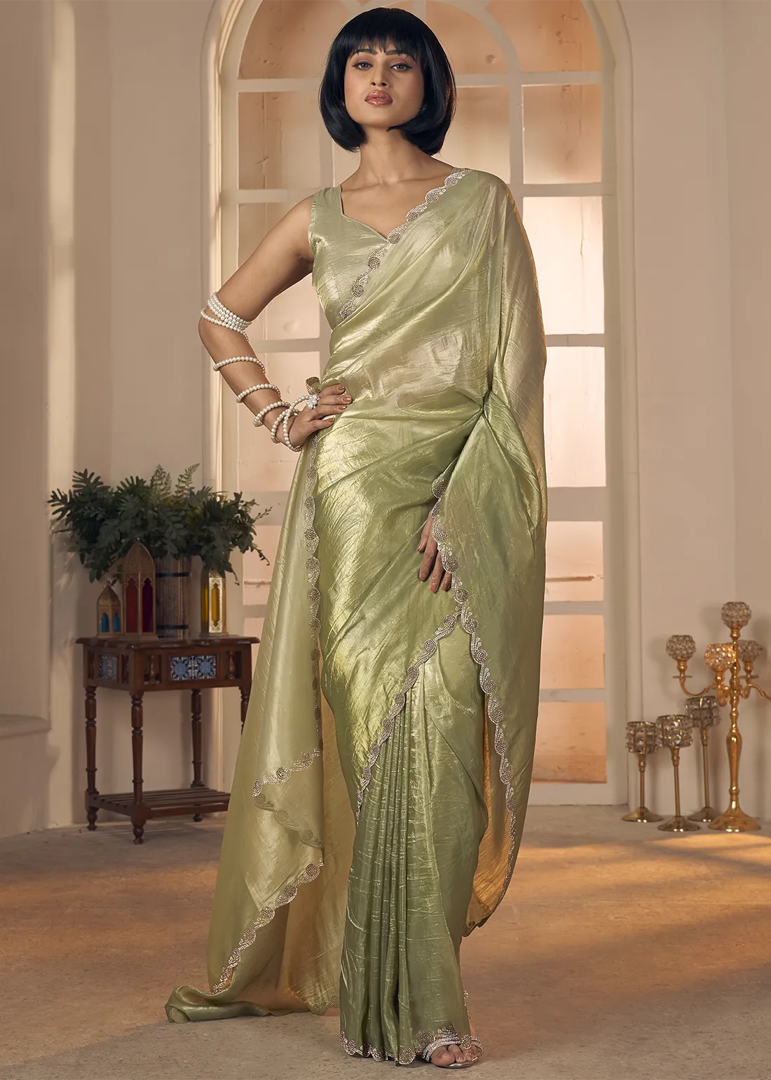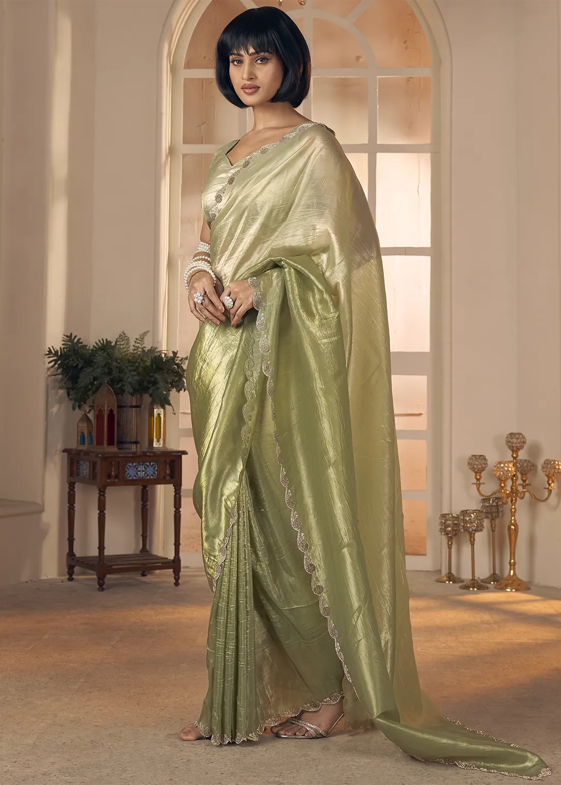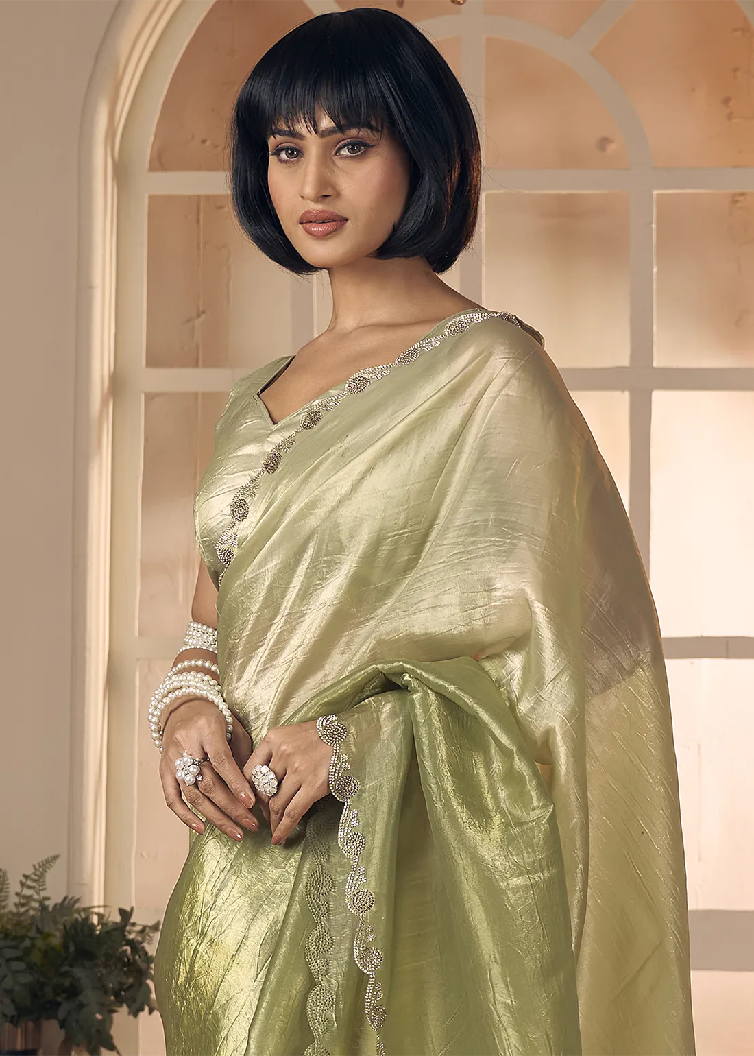 Saree: Ombré Olive Tissue Silk Saree featuring beautiful Stone handwork that makes the saree a unique masterpiece of craftsmanship. This beautifully crafted drape has a luxurious and royal appeal and looks captivating when worn. Whether you’re attending a wedding, a party, or any other grand event, this Designer Saree promises to turn heads and make you a vision of grace and sophisticated beauty.