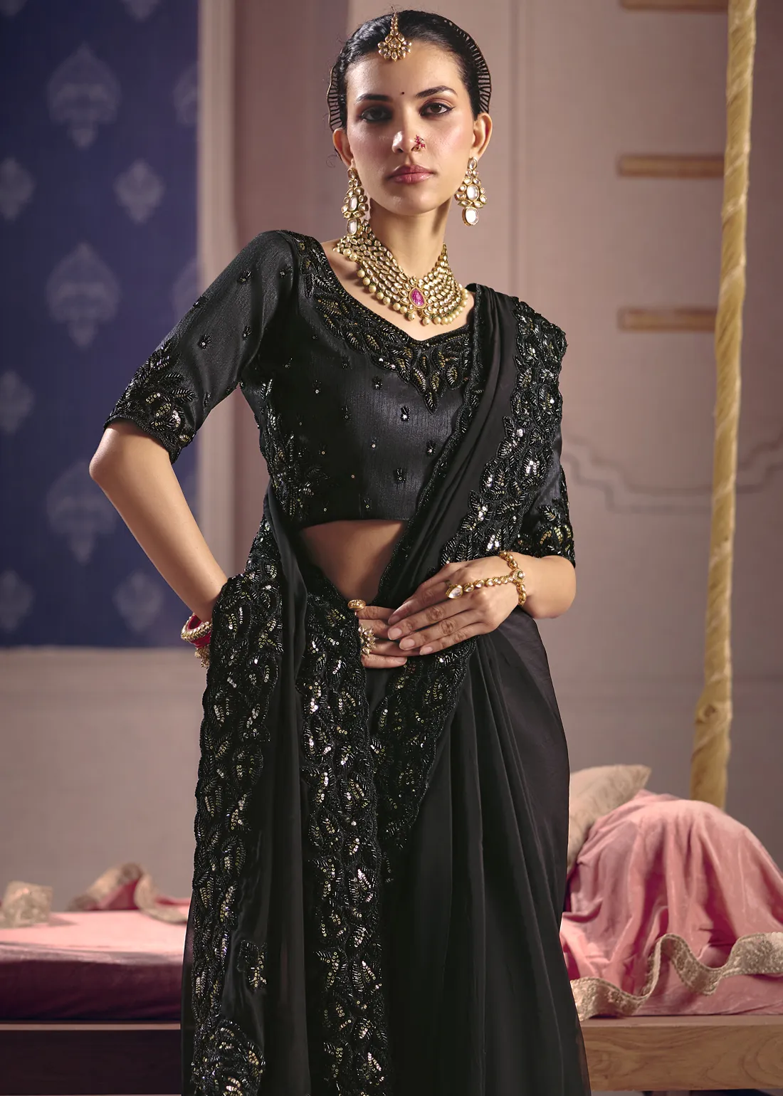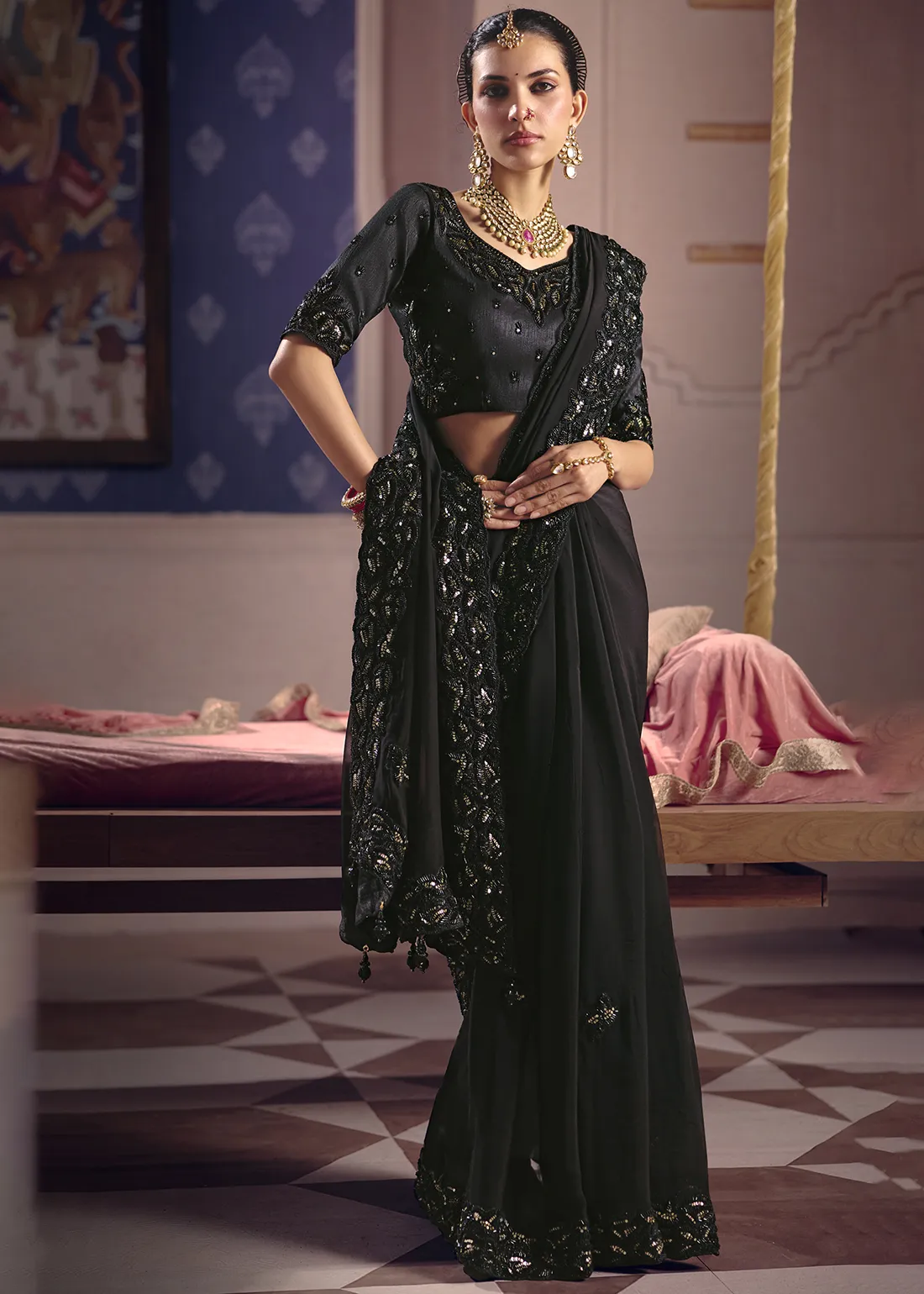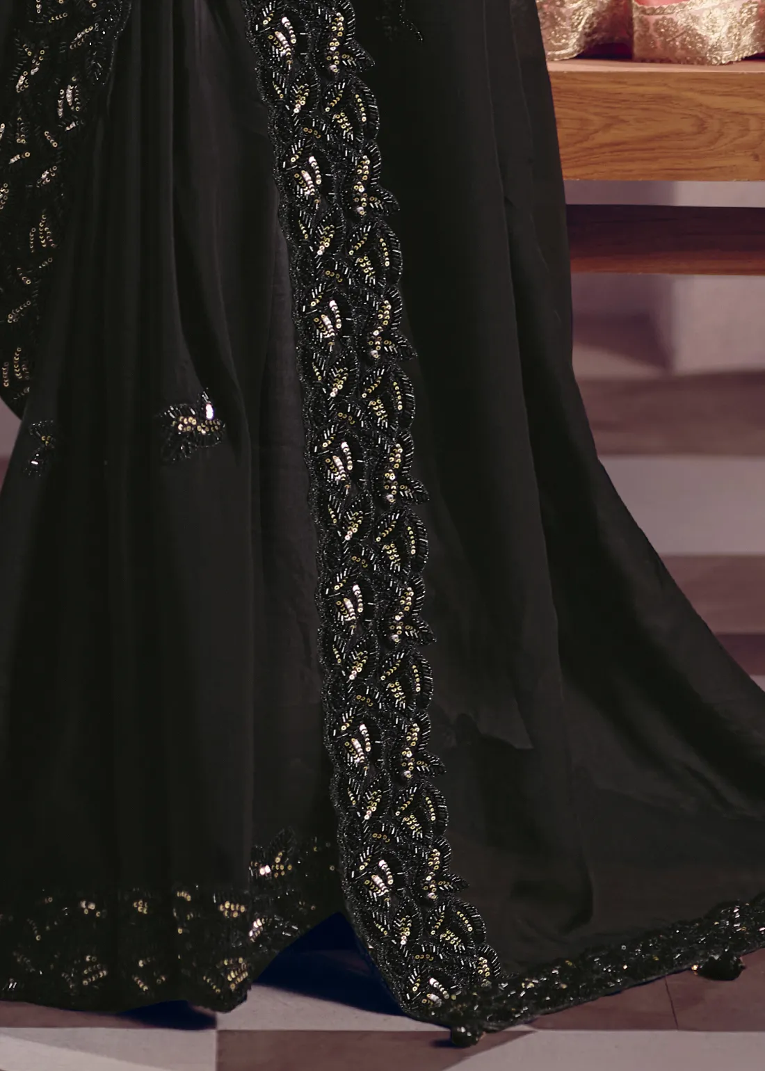 Saree: Command the room with this breathtaking Onyx Black Tissue Silk Saree. The premium tissue silk fabric offers a sophisticated, subtle metallic sheen and a crisp, graceful drape. It is masterfully framed by a heavy, intricately scalloped border, meticulously hand-embellished with dazzling golden sequins and rich black cutdana (glass beads) and pearl. This bold, modern masterpiece is the ultimate statement piece for cocktail parties, glamorous evening receptions, and high-fashion galas.
