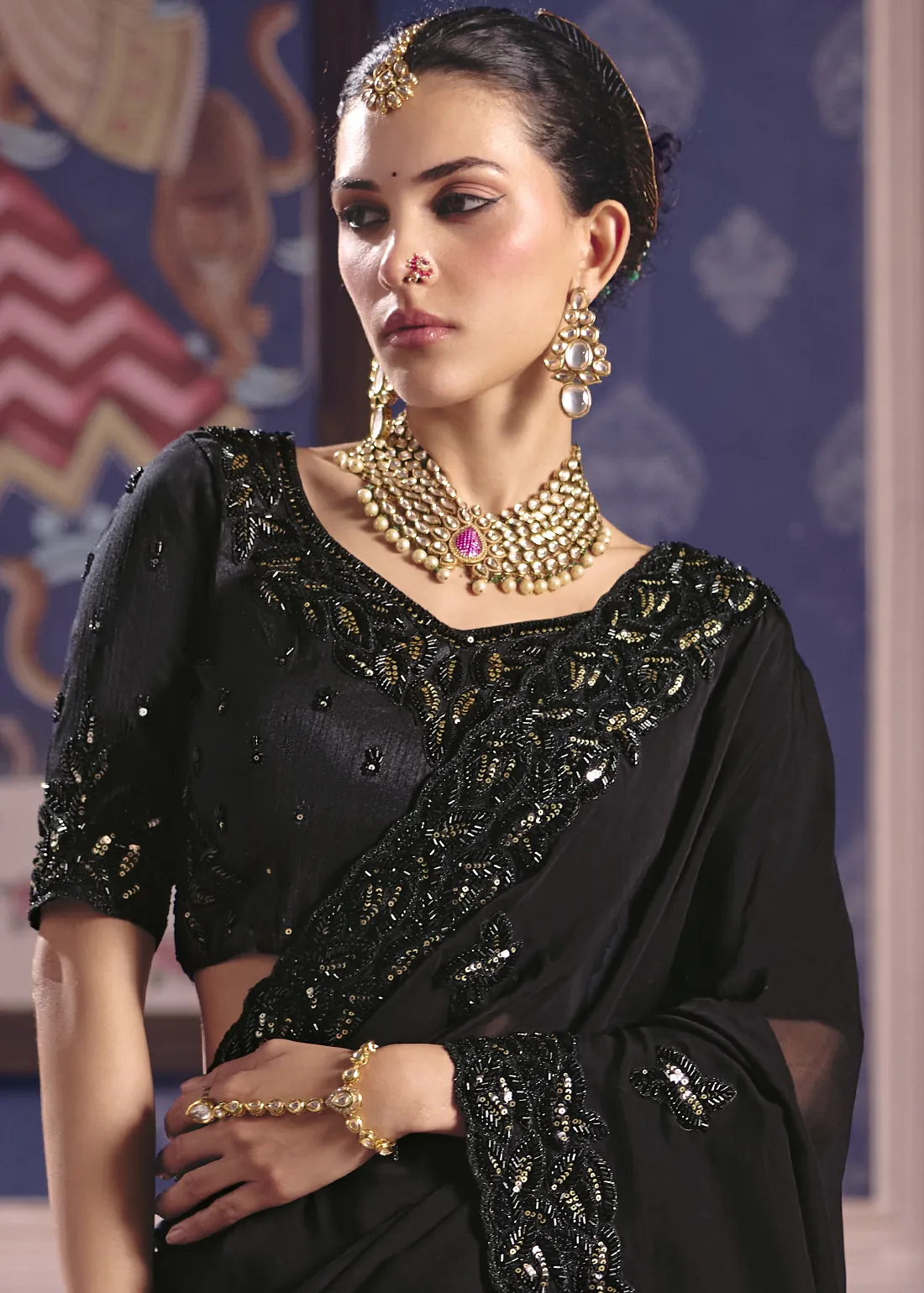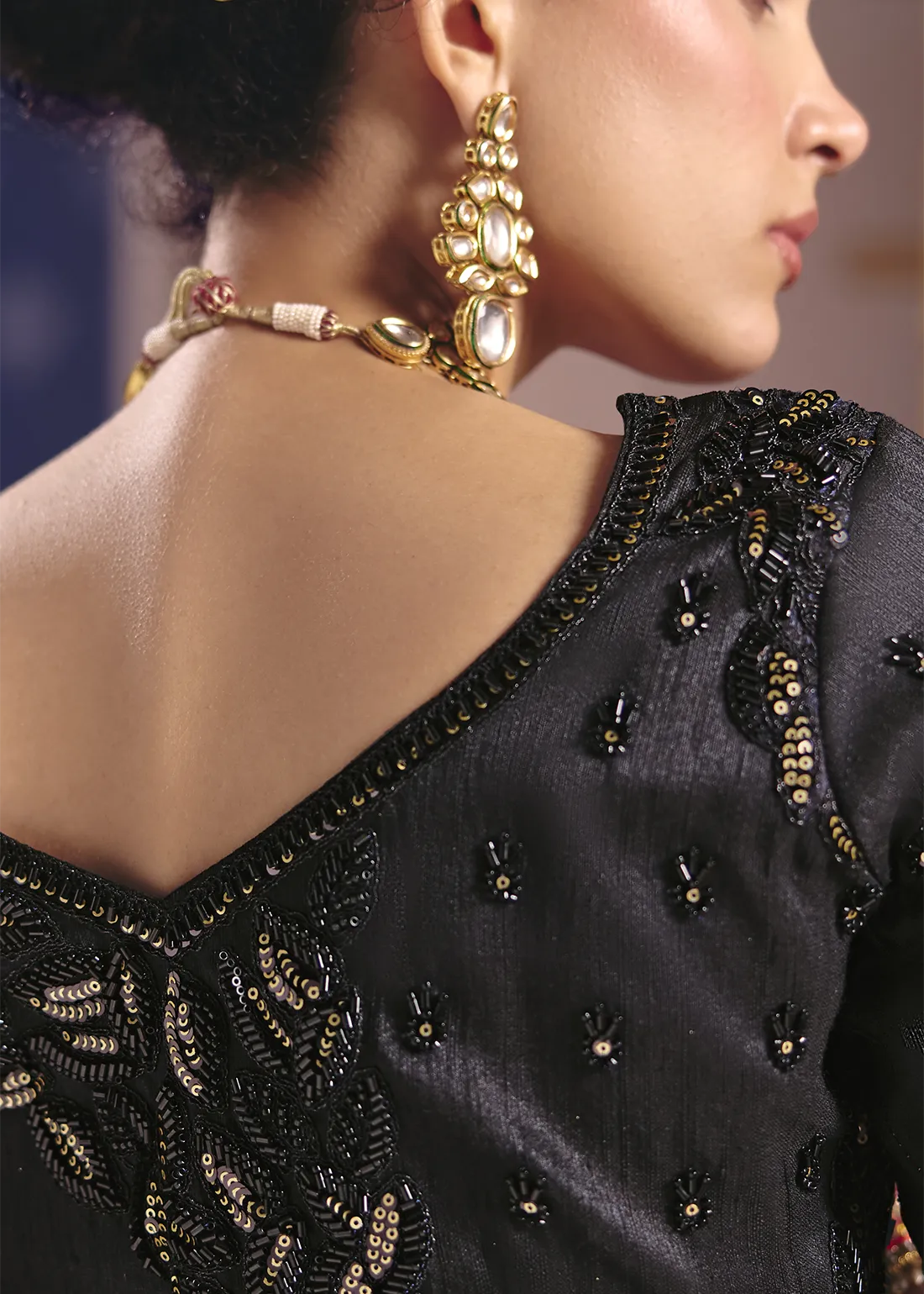 Blouse: Includes a matching Onyx Black unstitched blouse piece that perfectly anchors the monochromatic look. Featuring spectacular, heavy, all-over embroidery with coordinating golden sequins and black cutdana across the front, back, and sleeves, it allows you to tailor a flawless, head-turning designer ensemble.