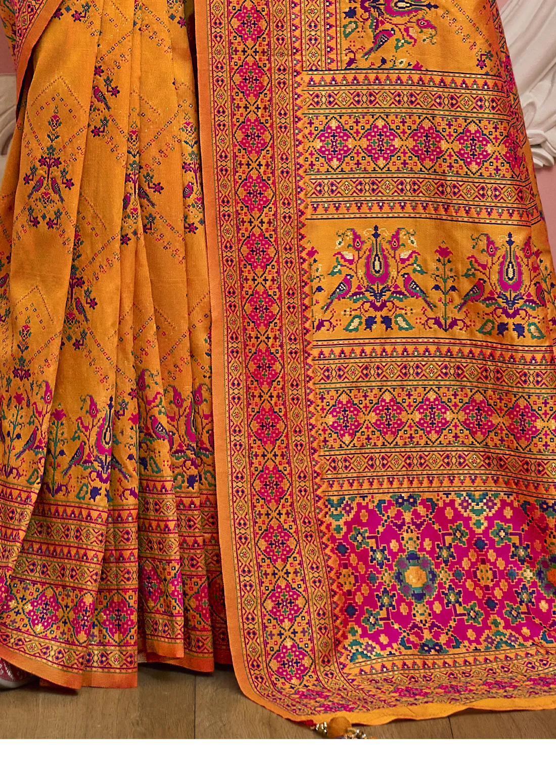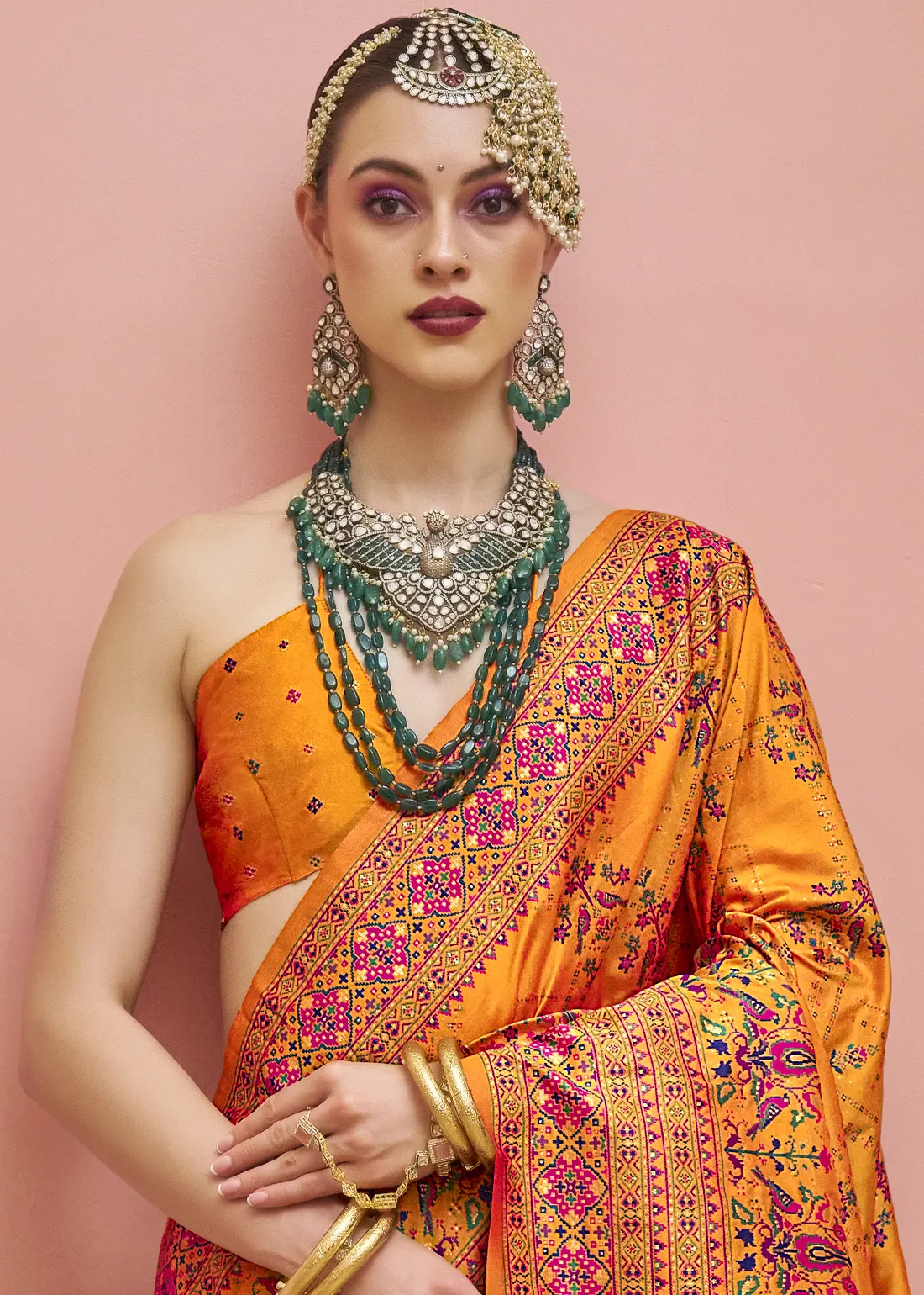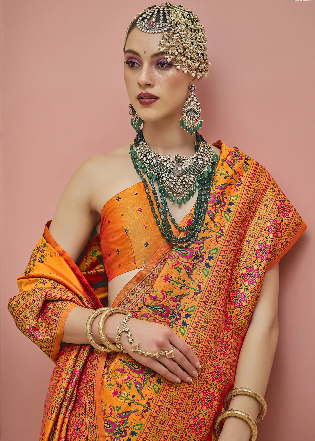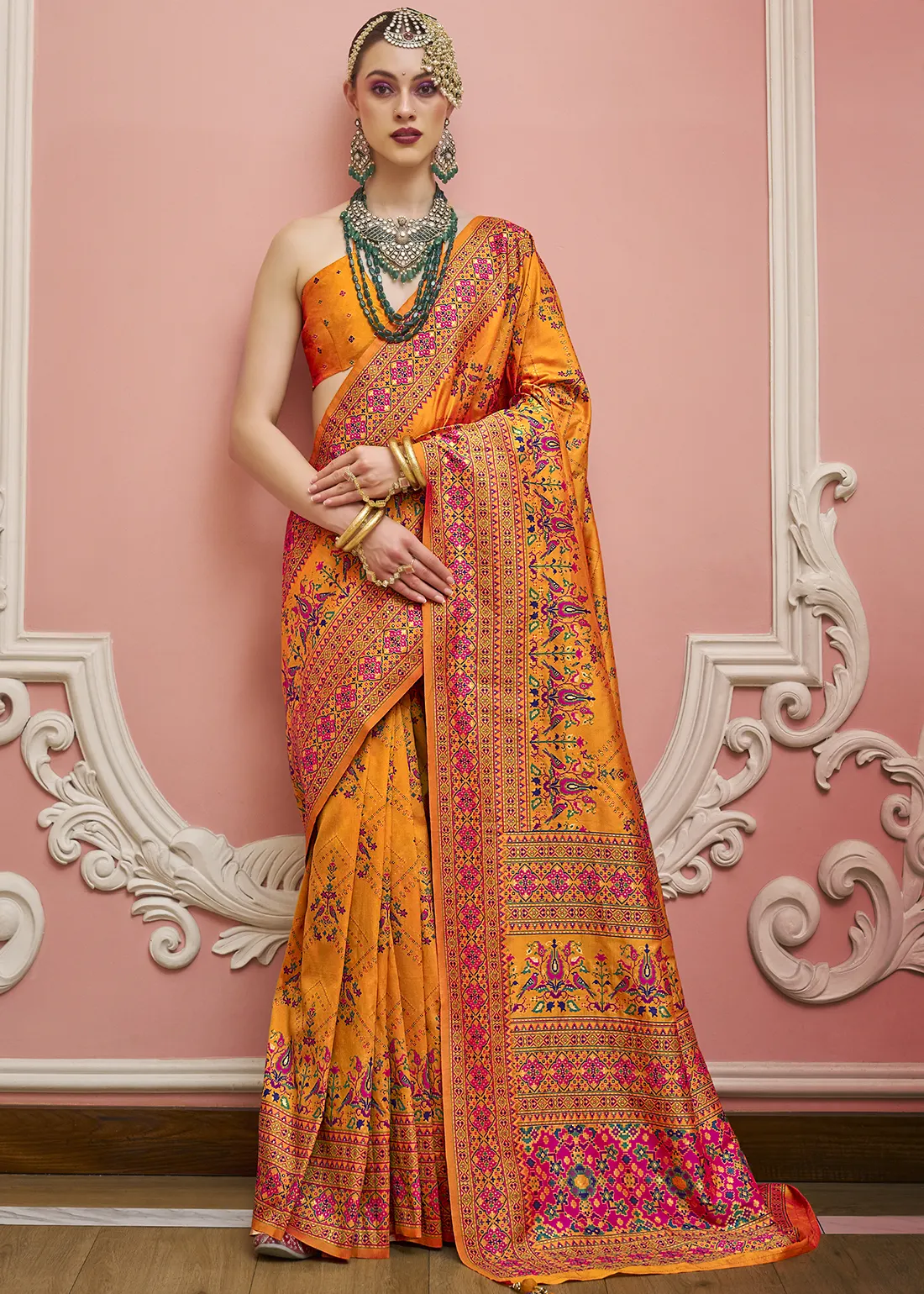 Saree: Adorned with intricately woven colourful Jamawar motifs, this Orange Kashmiri Jamawar Silk Saree is a tribute to the rich heritage of Kashmiri artistry, making it a treasured possession for generations to come. With its versatile drape, this saree beautifully complements any occasion, whether it’s a wedding celebration, a festive gathering, or a social event.