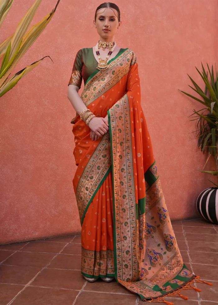 ■ This exquisite Orange Paithani Silk Saree is a timeless masterpiece crafted with unwavering devotion and love.