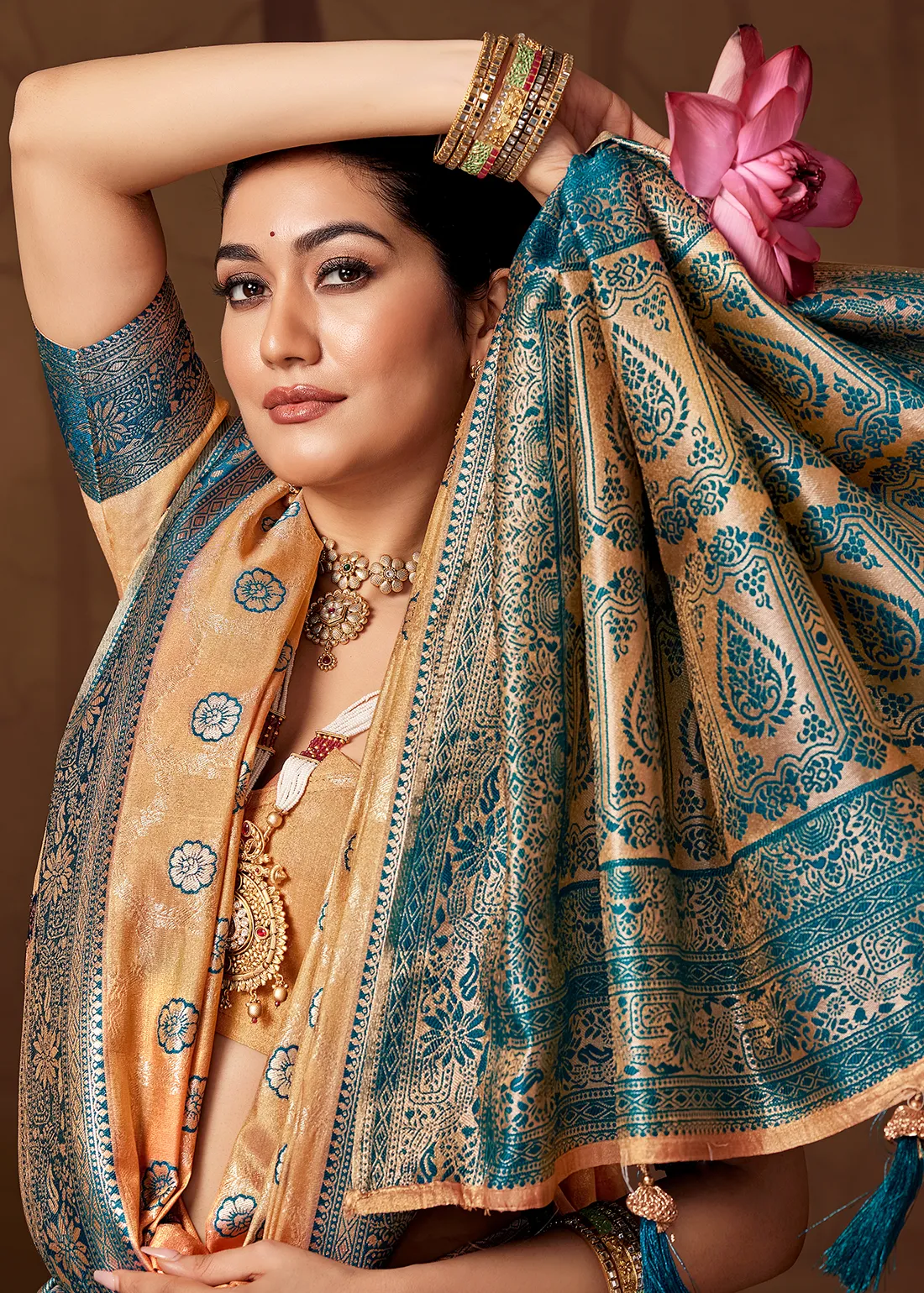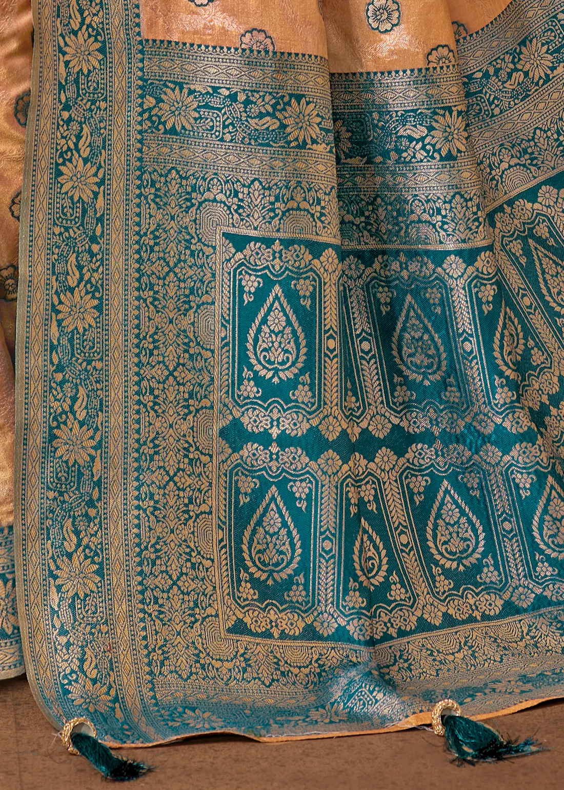 The contrasting peacock blue border and pallu feature elaborate Banarasi craftsmanship with intricate weaving and classic ornamental motifs. The pallu showcases finely detailed paisley and floral patterns, adding a luxurious depth to the drape.