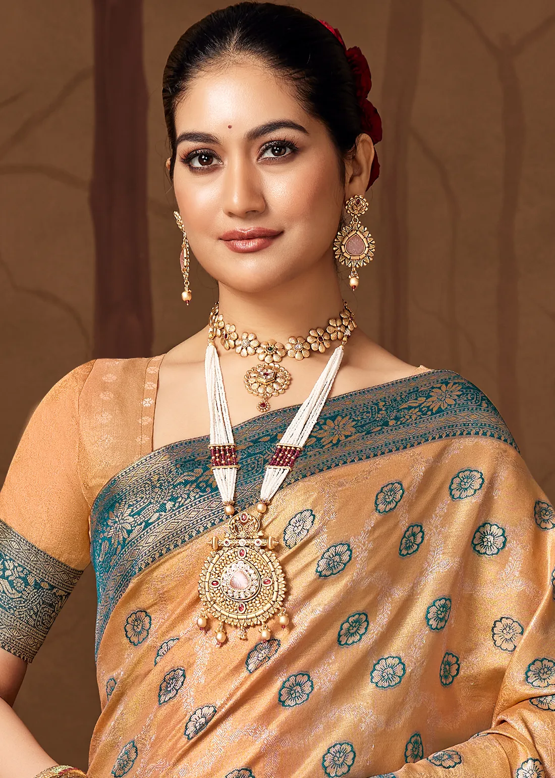 This saree is paired with a beautifully coordinated brocade blouse, enhancing the overall look. Ideal for weddings, receptions, festive gatherings, and celebrations, this saree brings out an aura of sophistication and elegance.