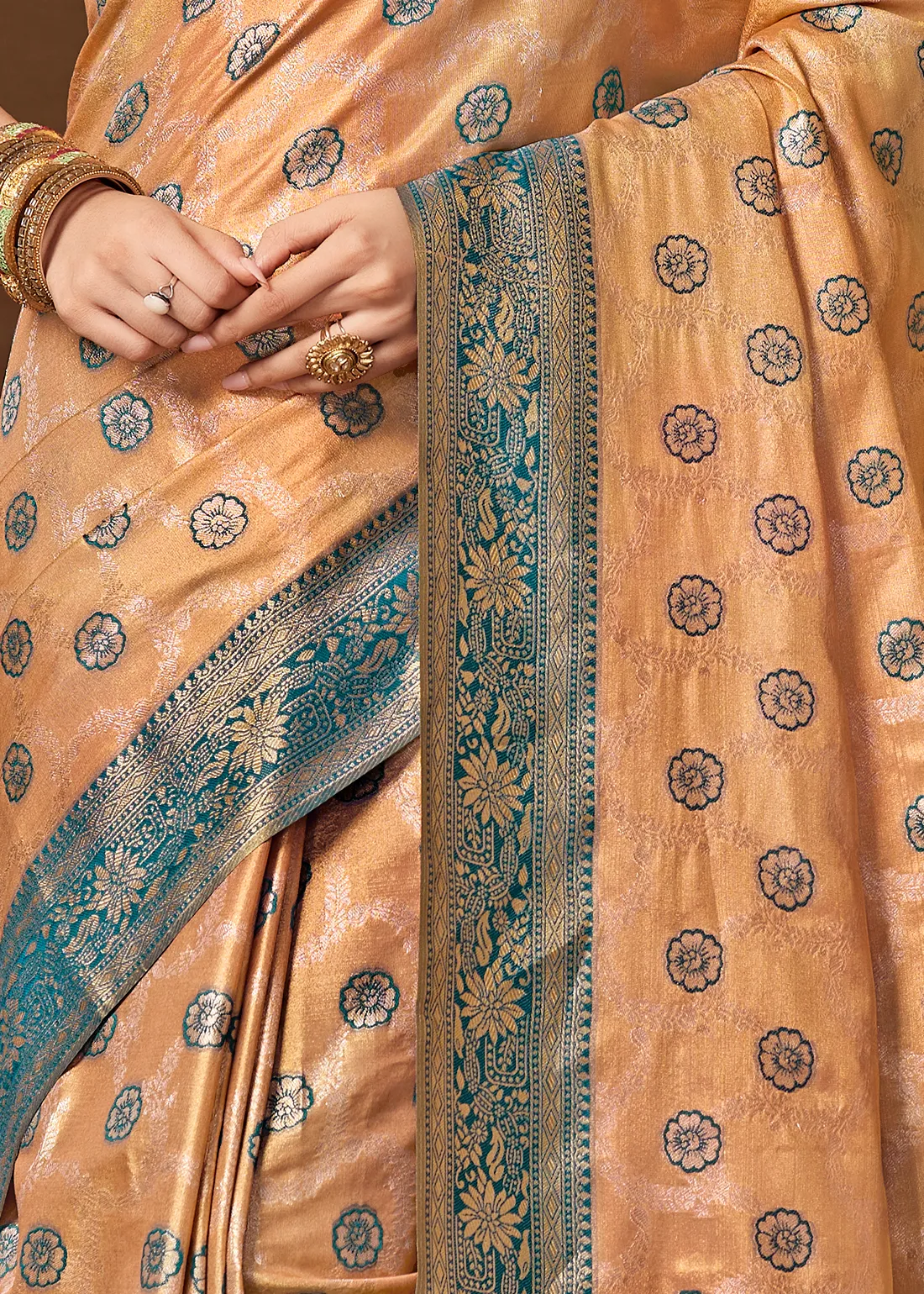 Peach & Peacock Blue Dual Colour Banarasi Saree with Brocade Blouse