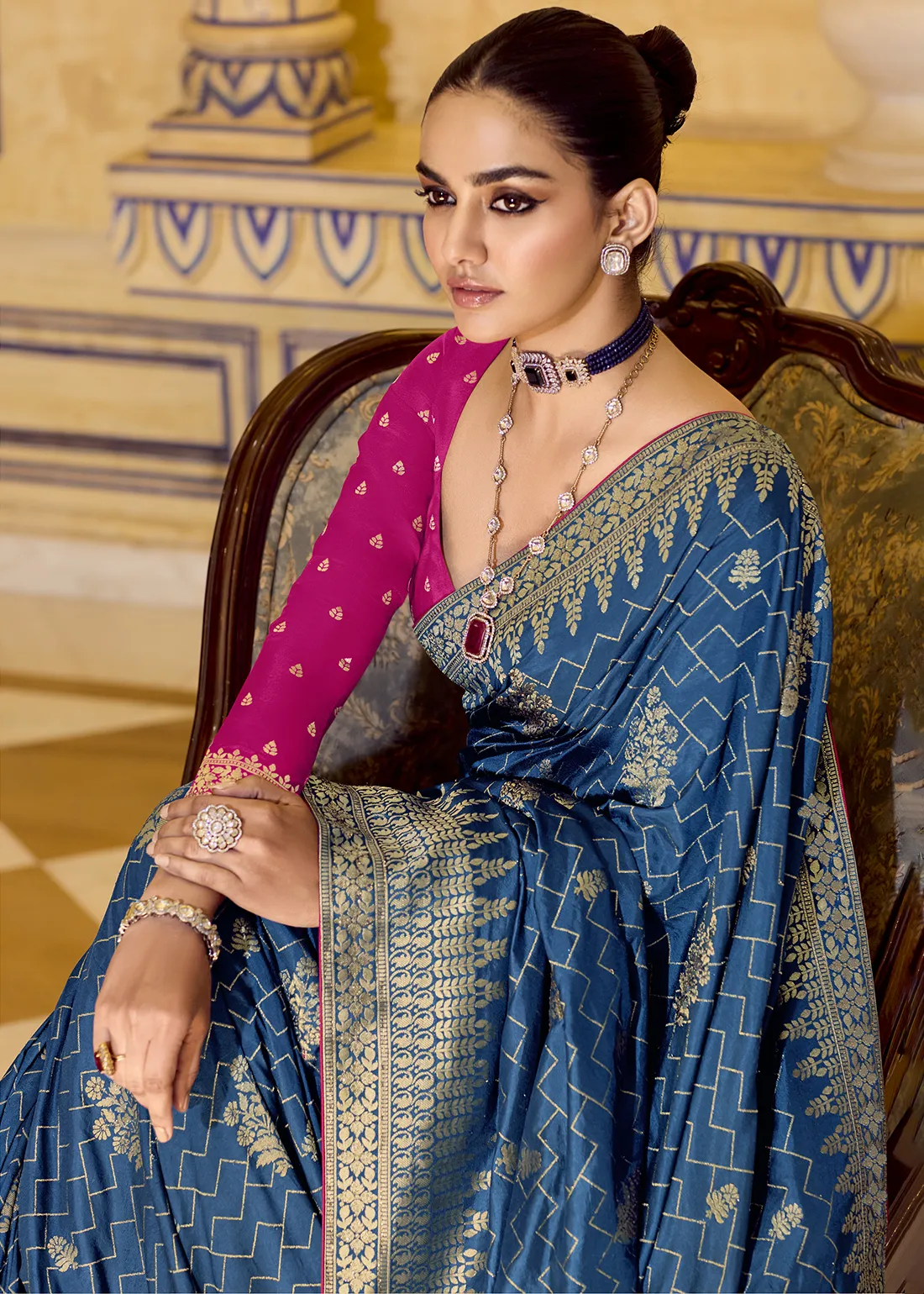 Navy Blue Banarasi Dola Silk Saree with Designer Blouse
