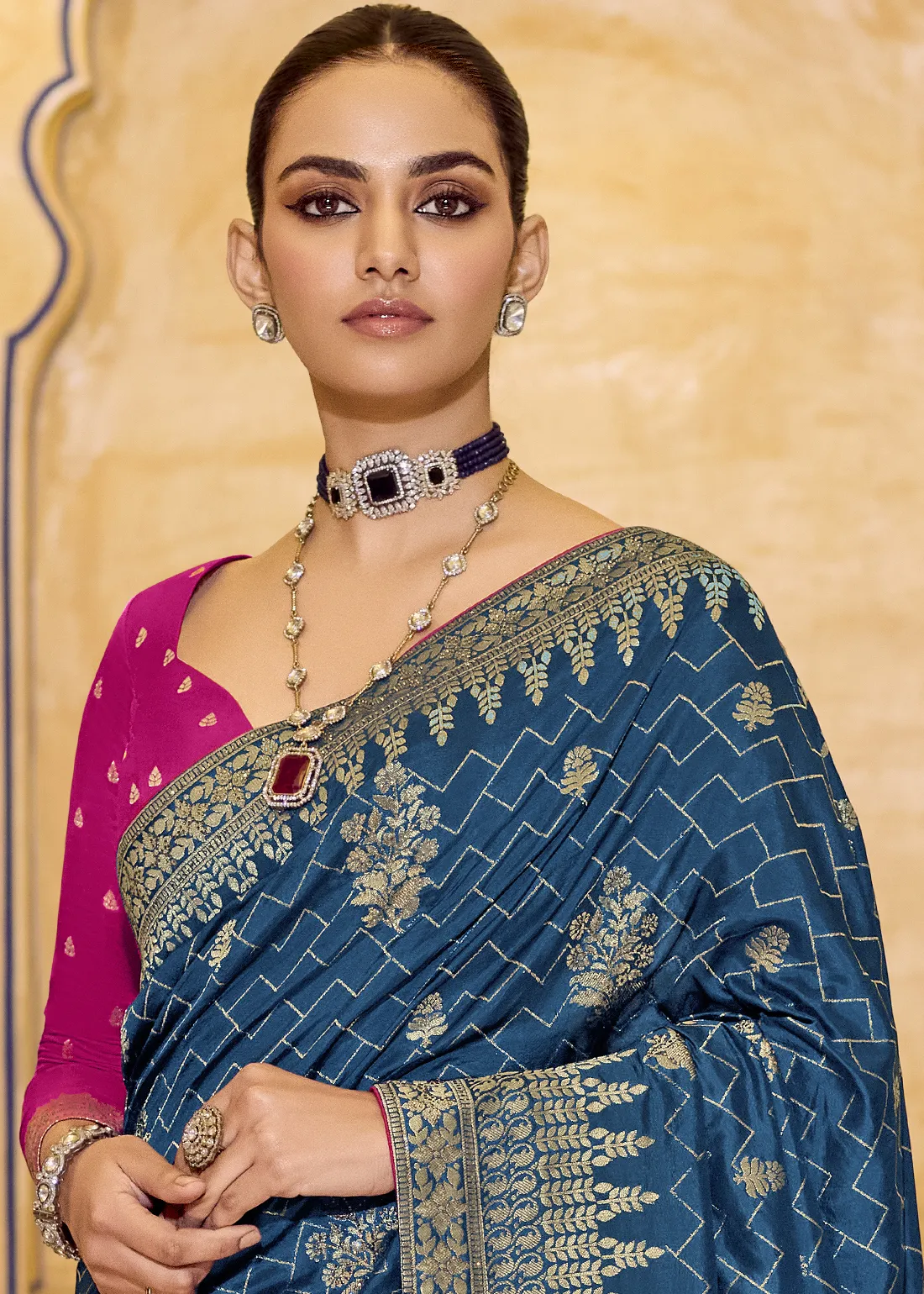 Azure Blue Banarasi Silk Saree with Golden Zari Floral Weaving
