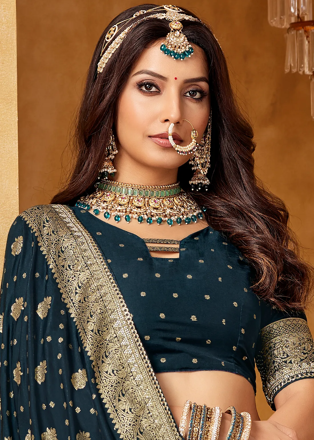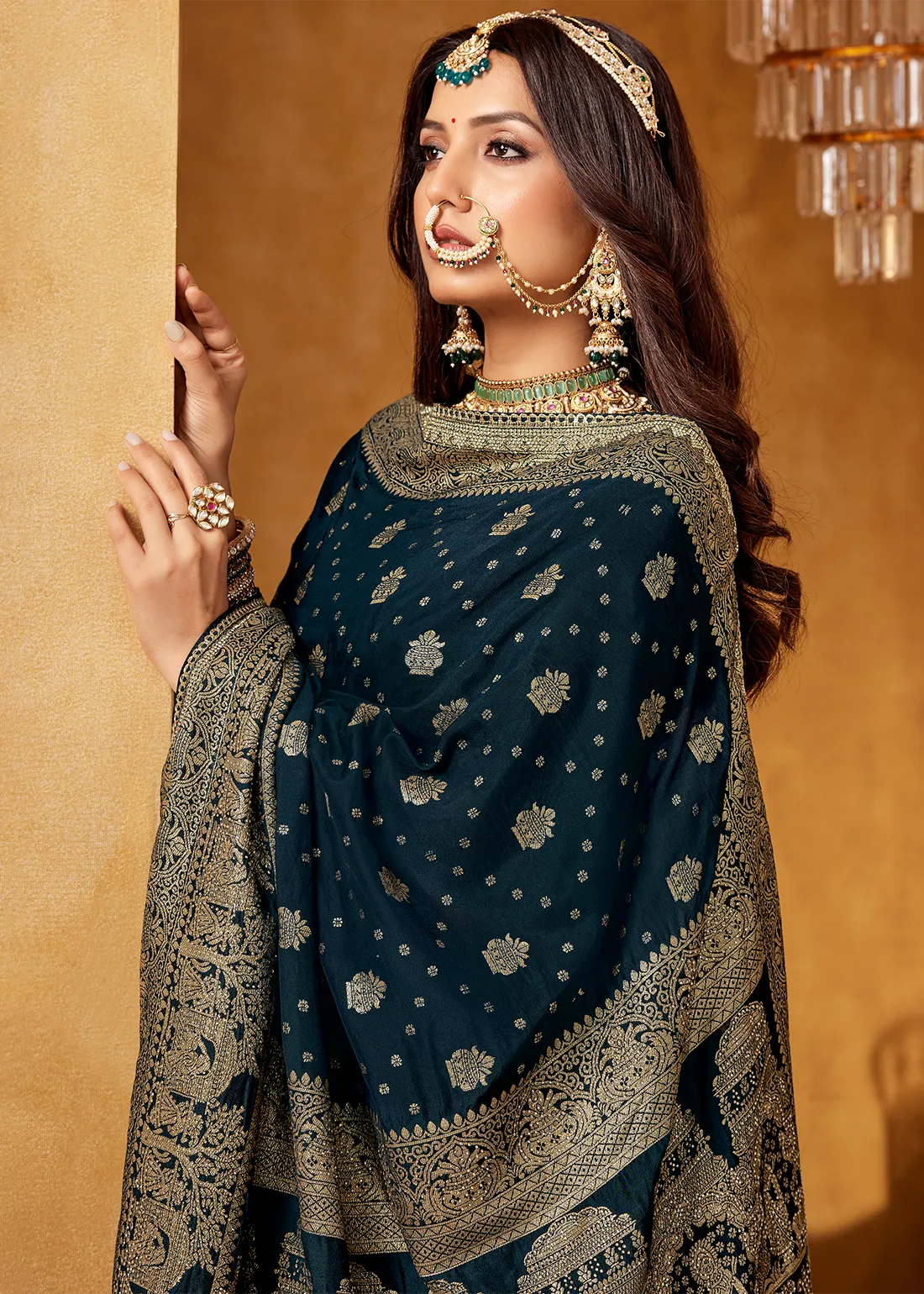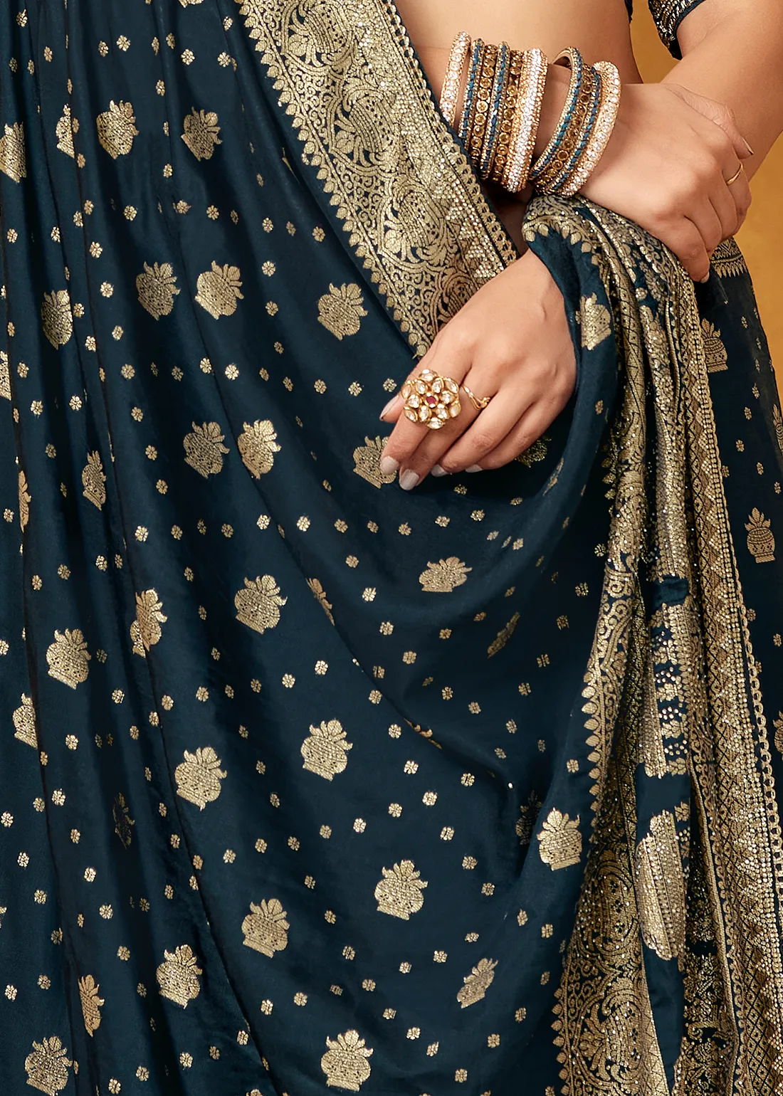 This saree blends royal craftsmanship with modern glamour, giving you a regal drape with effortless grace.