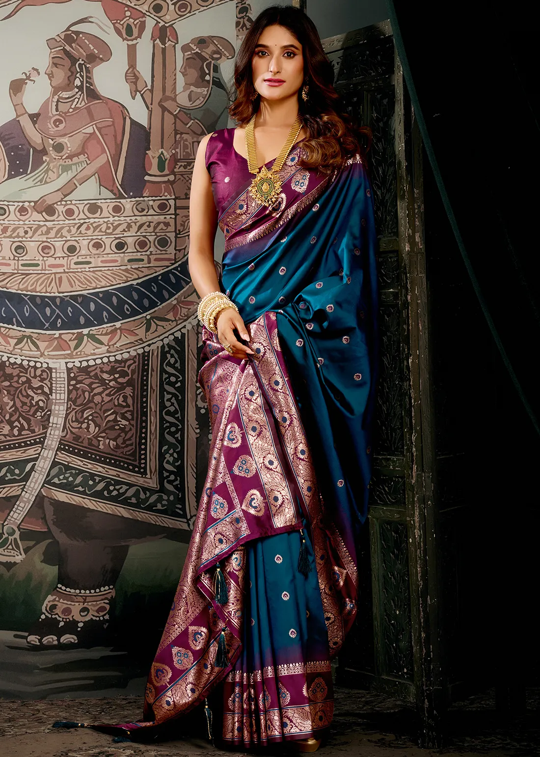Peacock Blue Banarasi Silk Saree with Wine Blouse