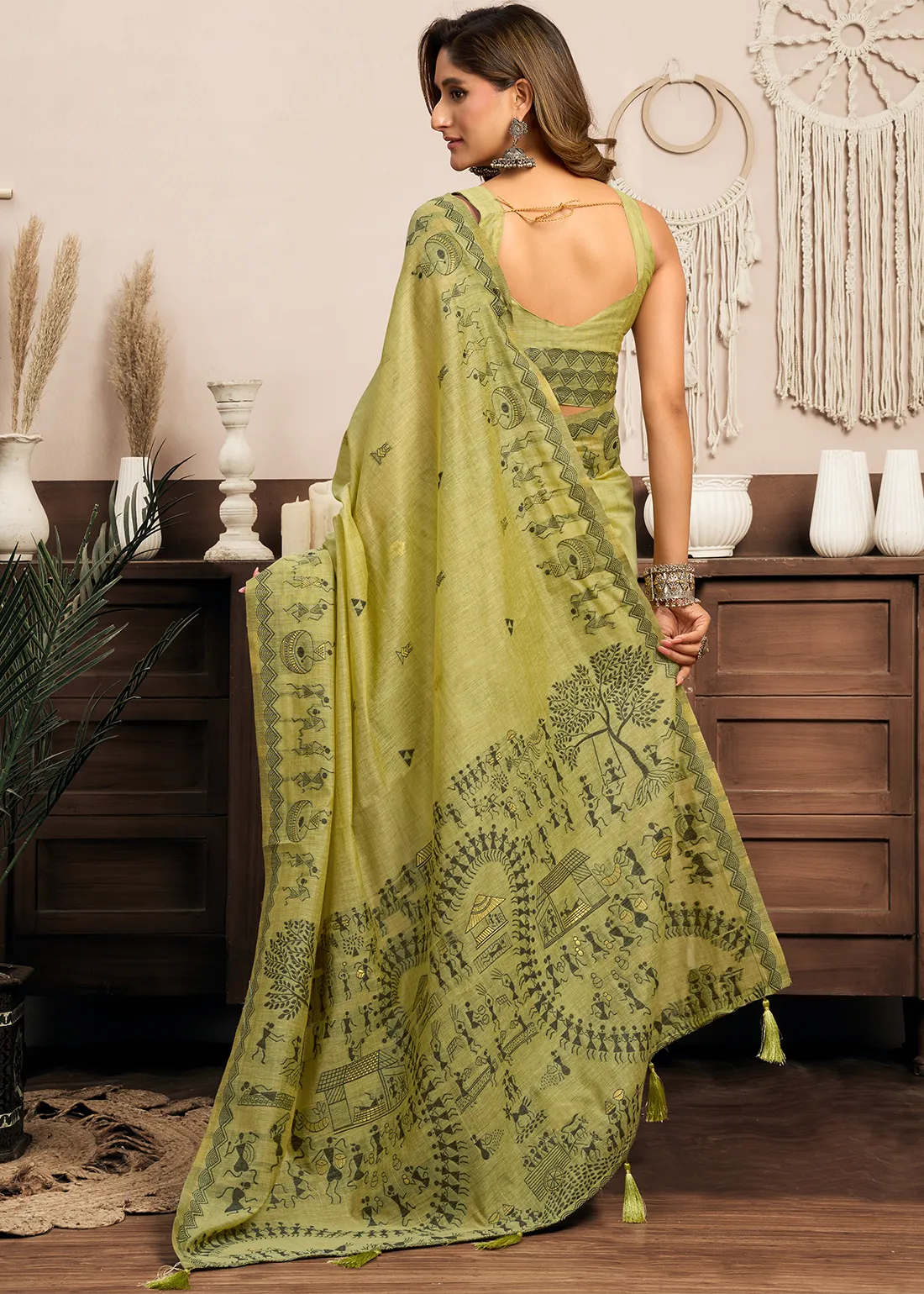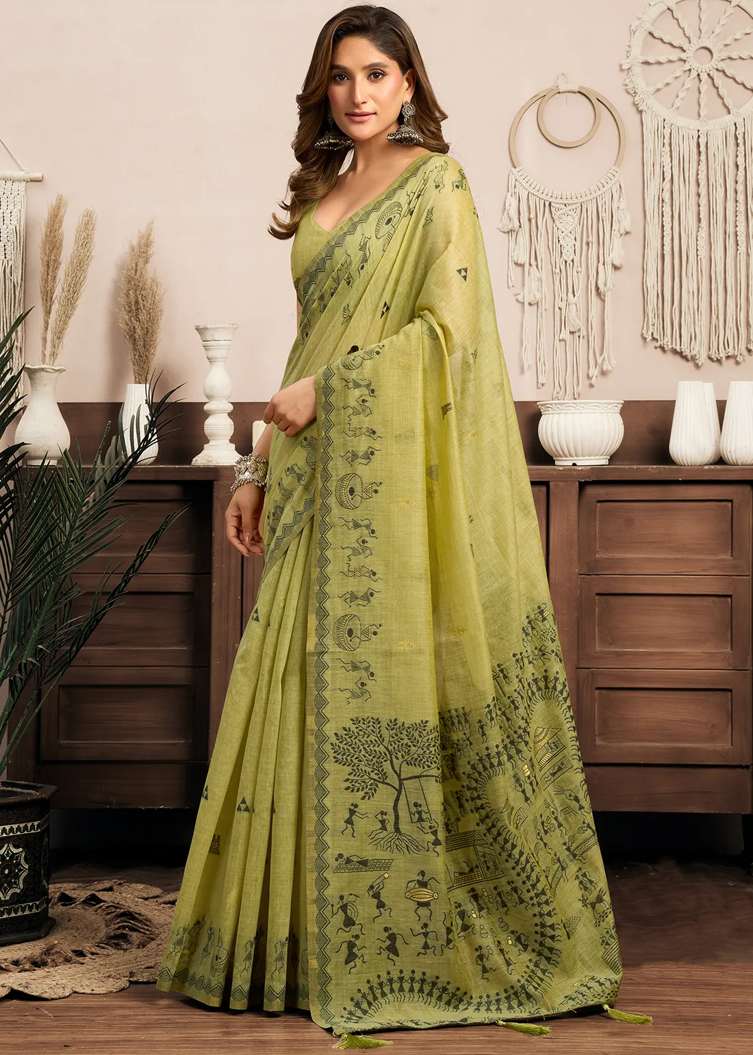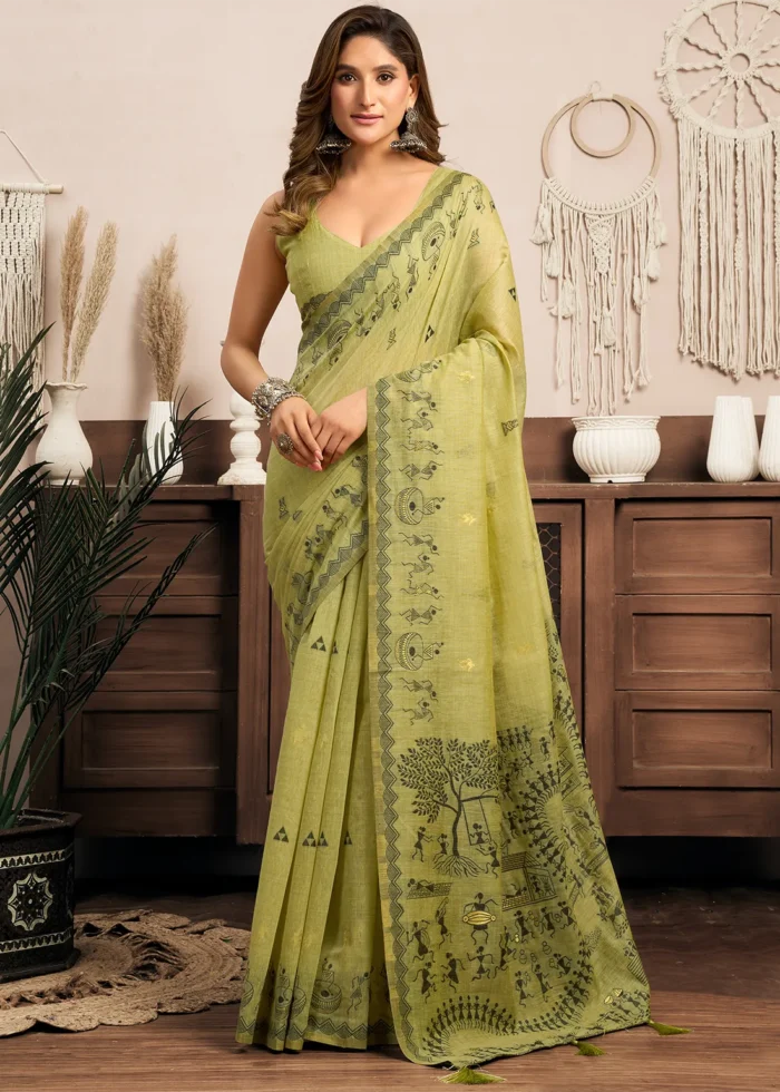 Woven Pistachio Green Linen Worli Work Saree