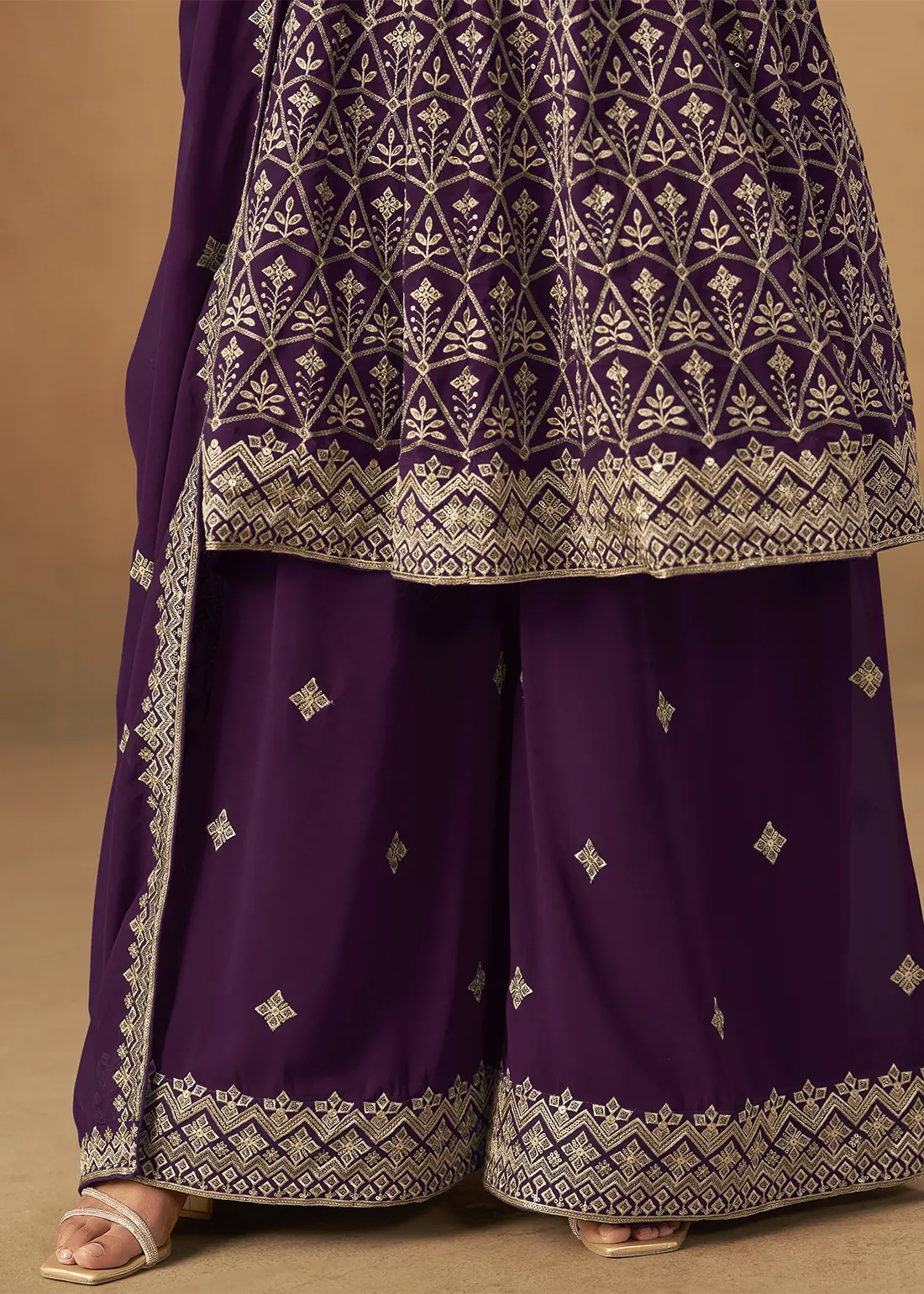 Add a regal charm to your festive and wedding wardrobe with this purple Georgette Palazzo Suit. Designed with intricate sequin and resham embroidery, the semi-stitched top pairs beautifully with a stitched palazzo bottom and an embroidered dupatta for a graceful ensemble. Crafted with santoon inner fabric, this outfit combines comfort with elegance, making it an ideal pick for weddings, receptions, and festive occasions.