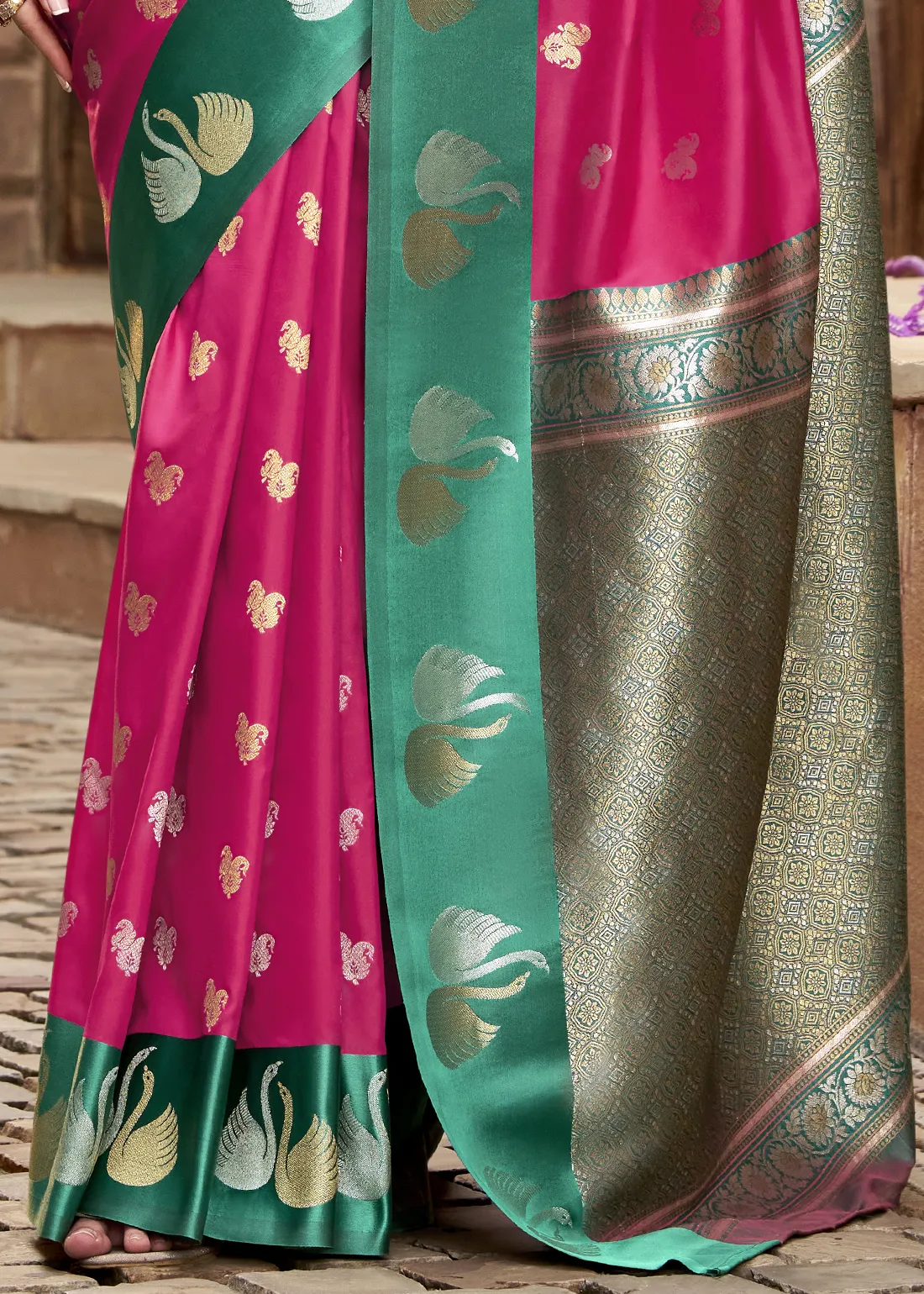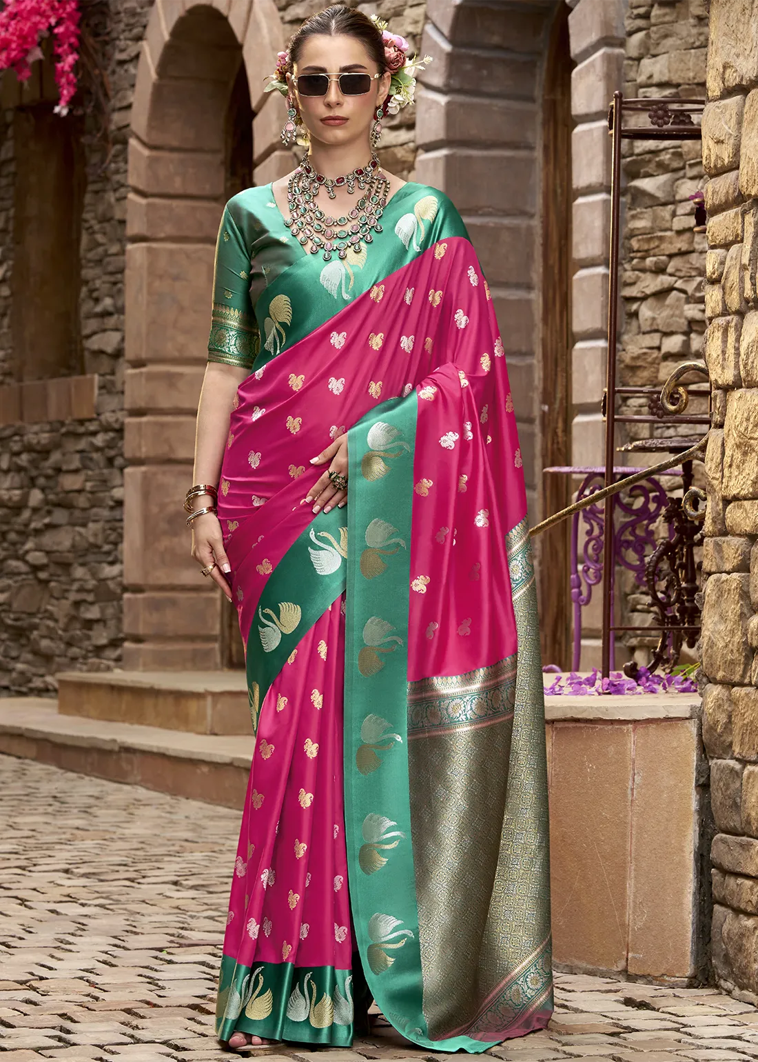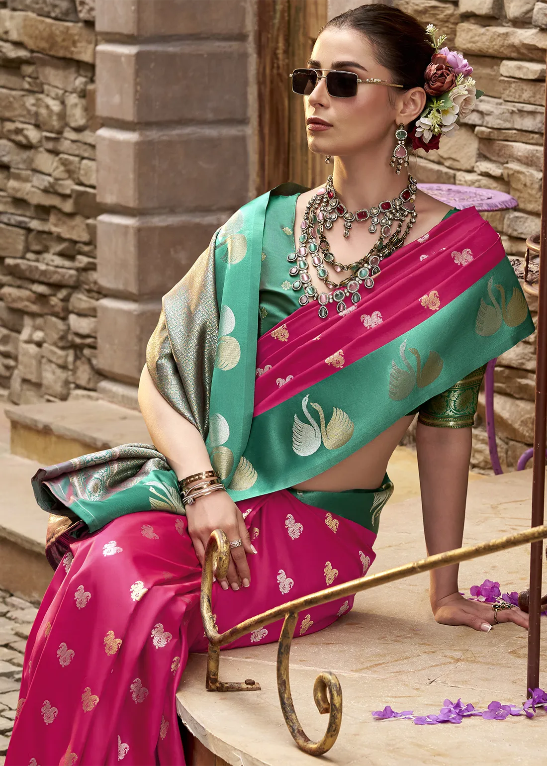 Rani Pink and Emerald Green Banarasi Saree with Gold & Silver Zari