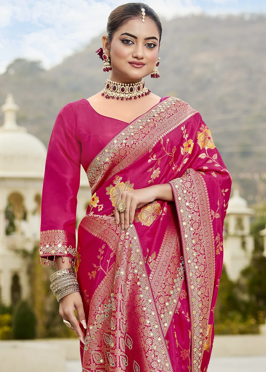 Hot Pink Banarasi Organza Silk Saree