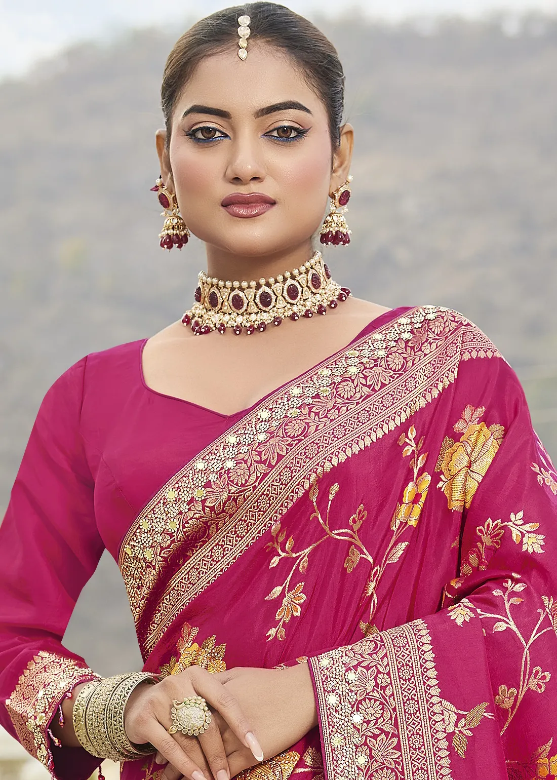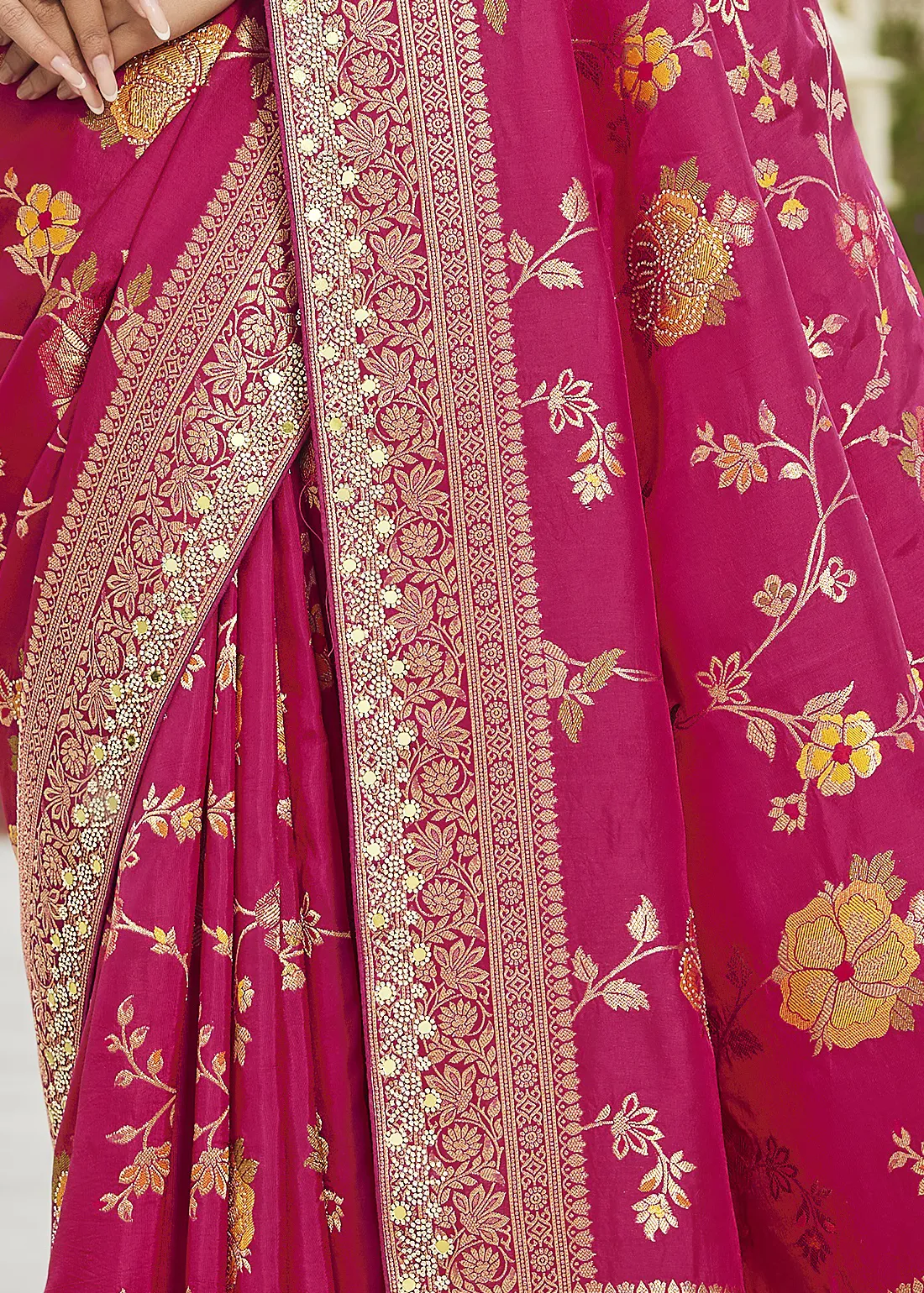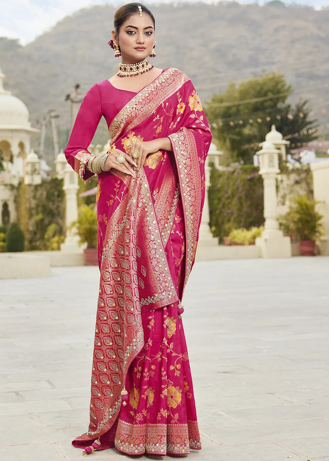 Saree: Command the room with this breathtaking Rani Pink Banarasi Silk Saree. This radiant masterpiece beautifully marries traditional handloom artistry with modern glamour. The luminous pink silk body is intricately woven with warm, multi-colored floral Meenakari motifs that stand out gorgeously against the rich base. Elevating its regal charm is a heavy, meticulously crafted border and grand pallu, entirely embellished with brilliant Zarkan stones and sparkling mirror work. This dazzling drape is the ultimate statement piece for grand weddings, glamorous evening receptions, and joyous festive celebrations.