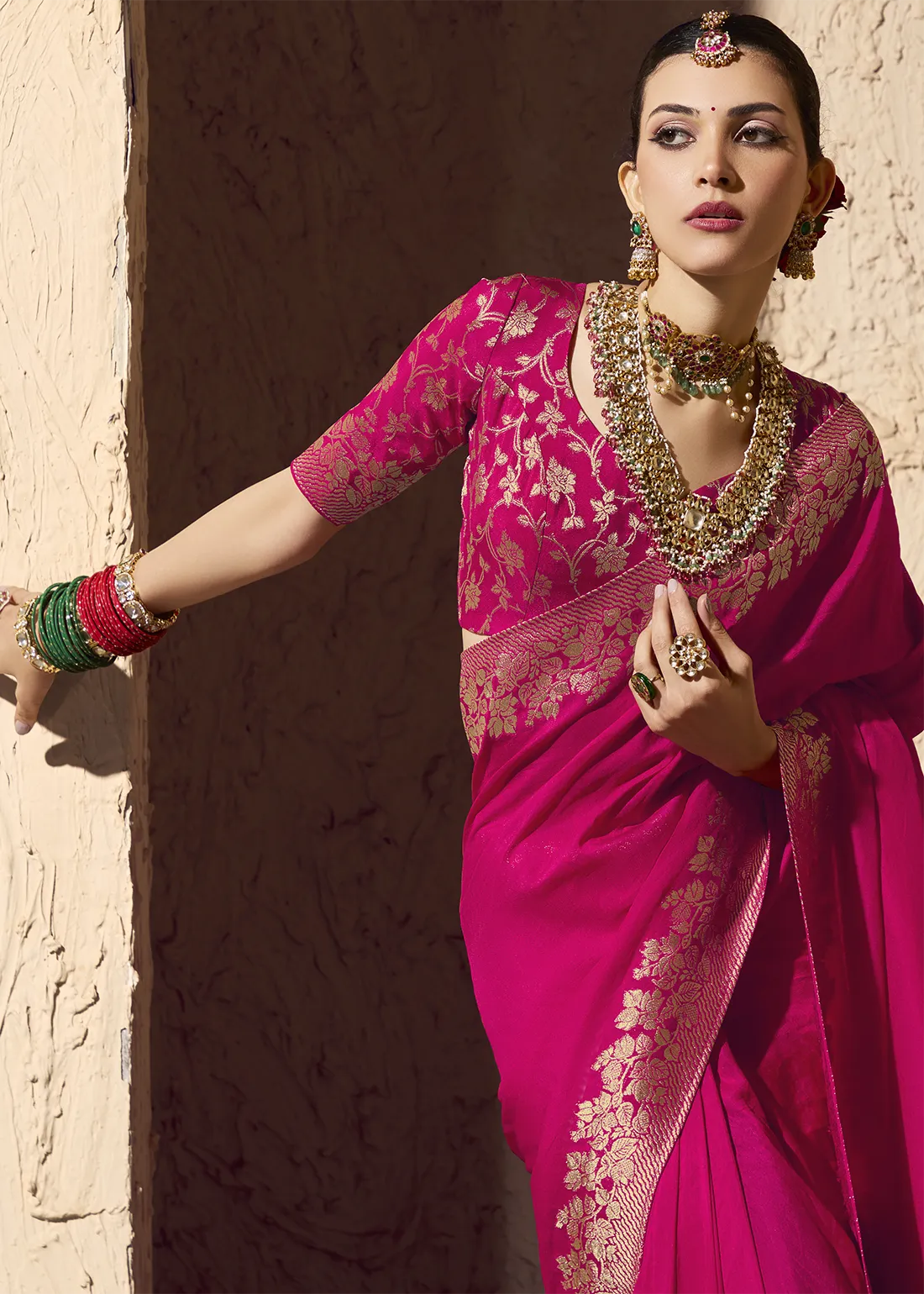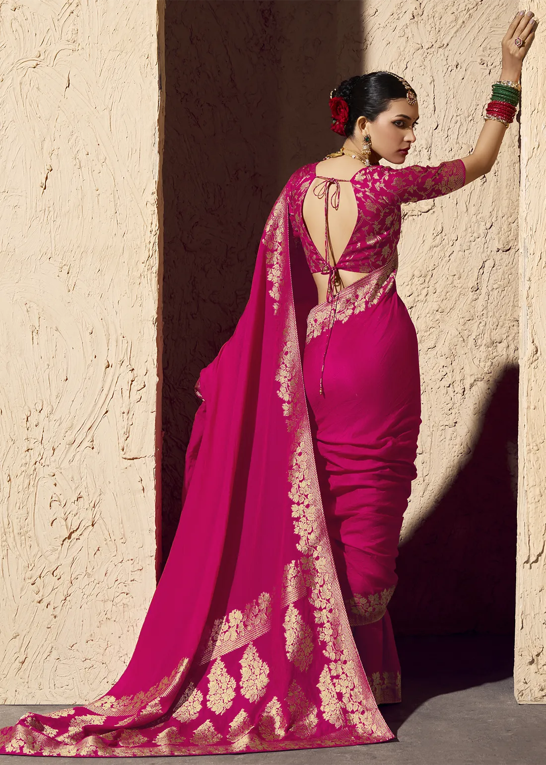 Magenta Georgette Banarasi Saree with Golden Zari