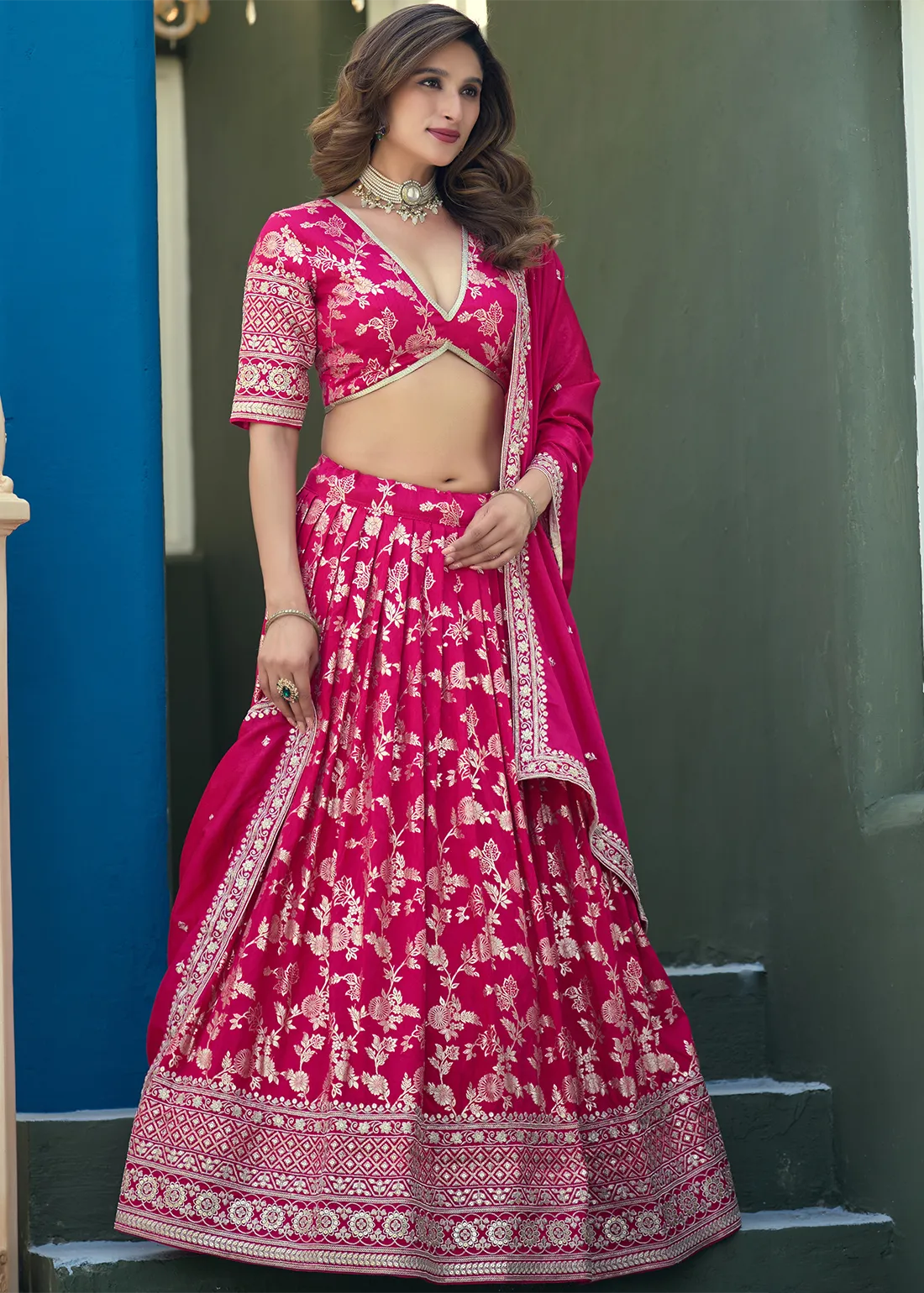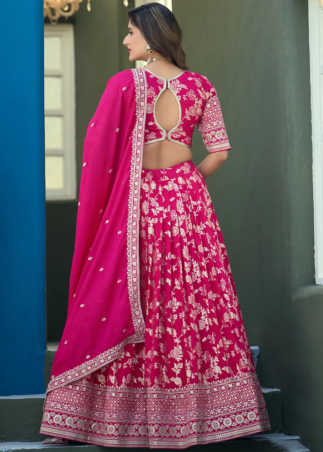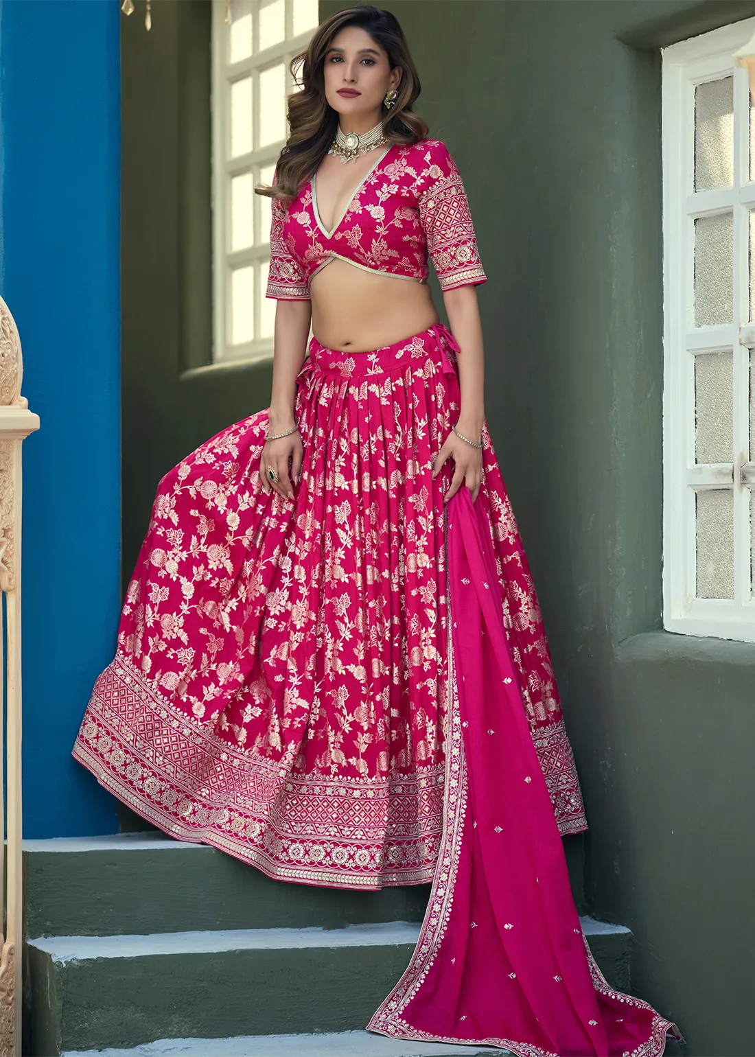 Crafted with meticulous attention to detail, this resplendent Raspberry Pink Dola Silk Lehenga is adorned with opulent banarasi weaving, Zari Embroidery and Sequins work, creating an enchanting tapestry of shimmering beauty. The lustrous fabric lends an ethereal charm to the ensemble, while the intricate embroidery adds a touch of grandeur and sophistication. The Lehenga has been carefully crafted by skilled artisans, ensuring impeccable craftsmanship and a flawless finish.