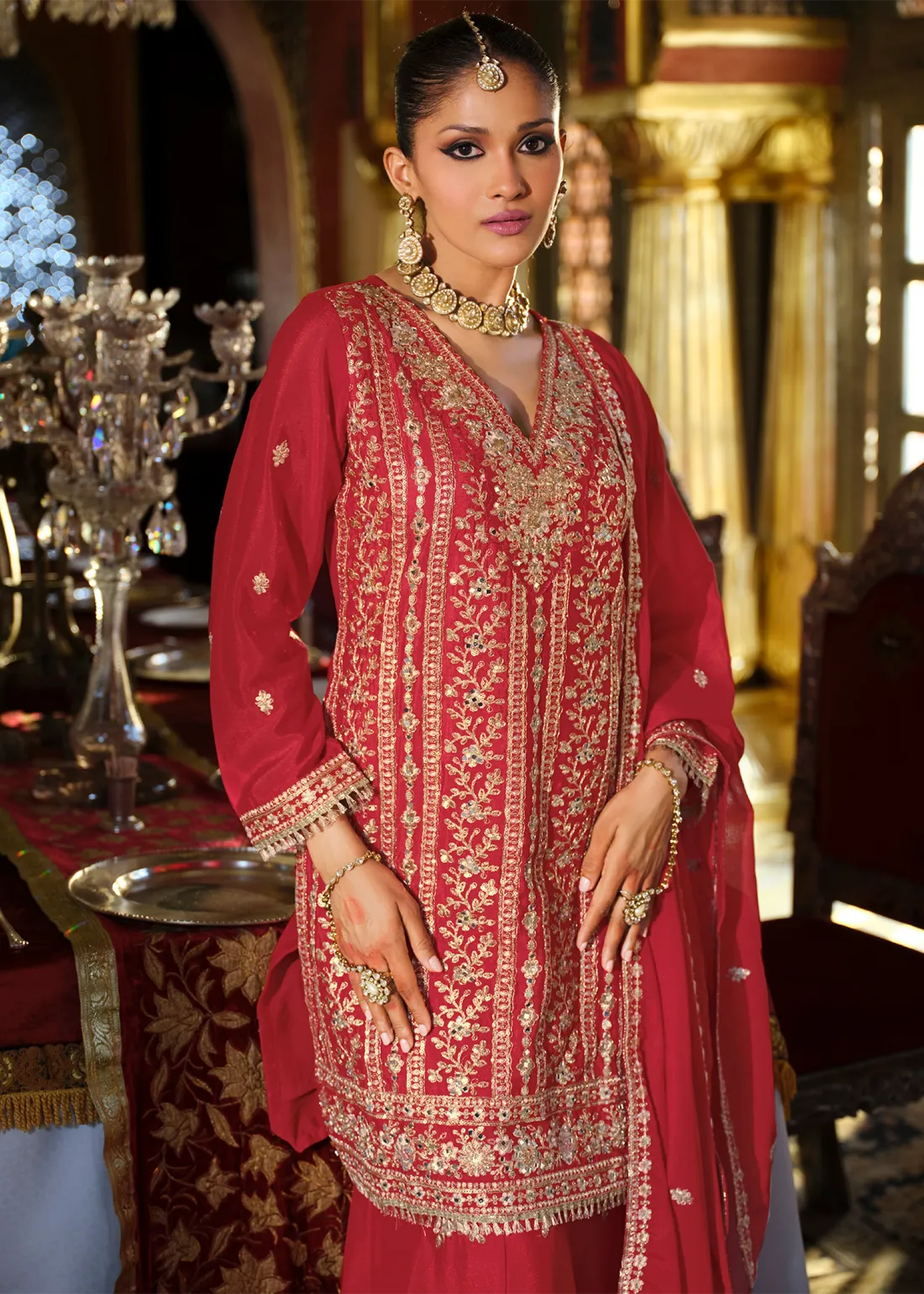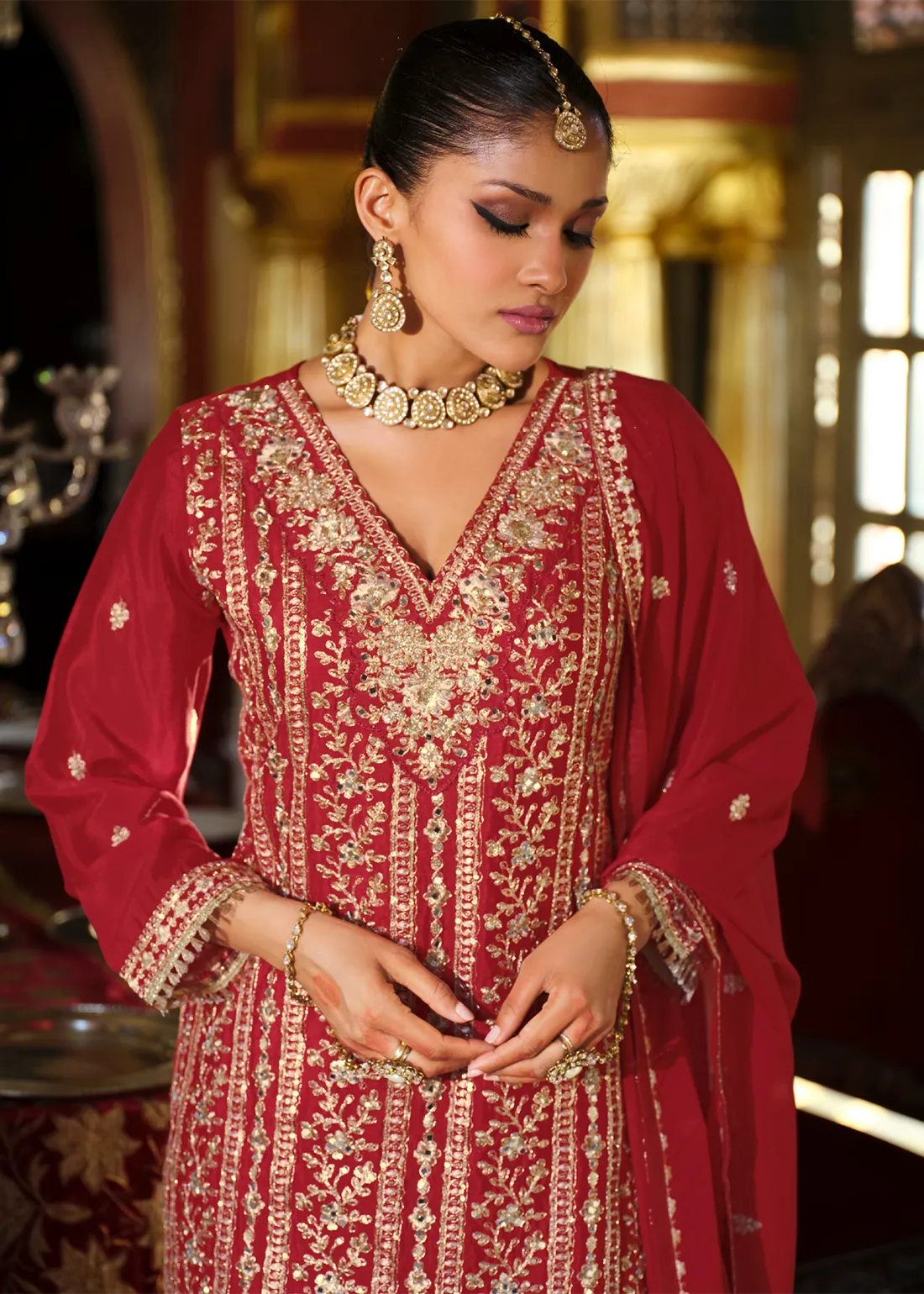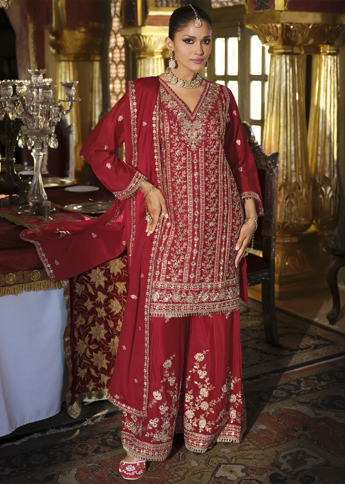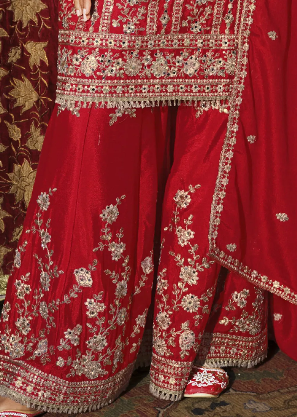 Red Chinon Silk Sharara Suit with Embroidery and Sequins Work