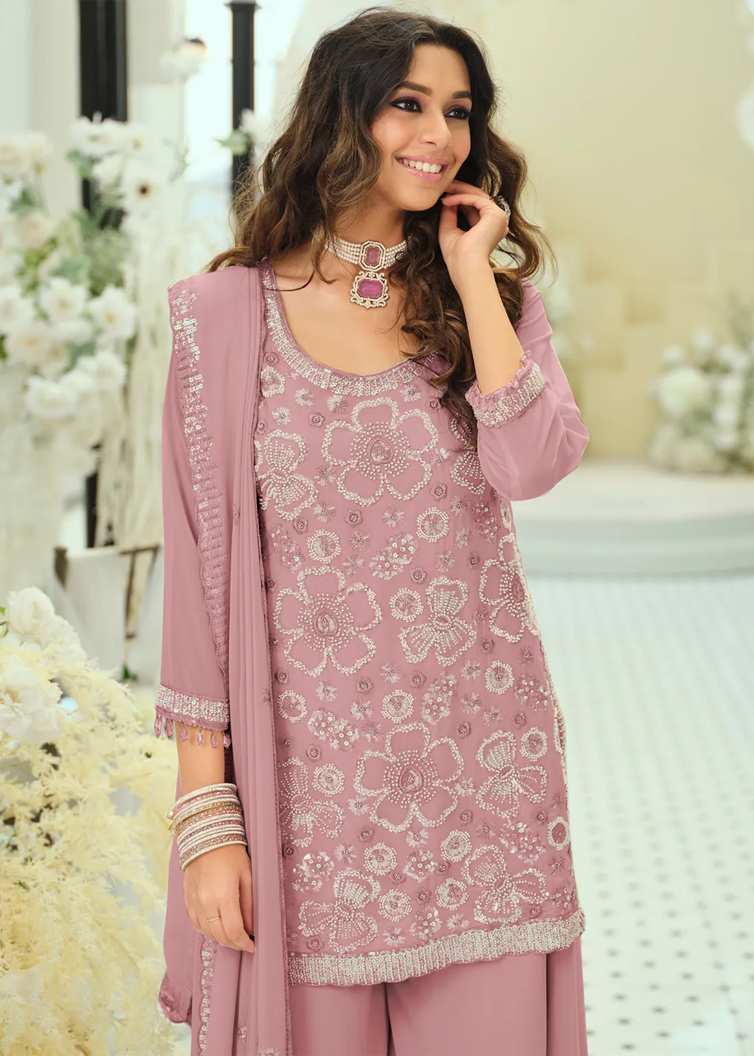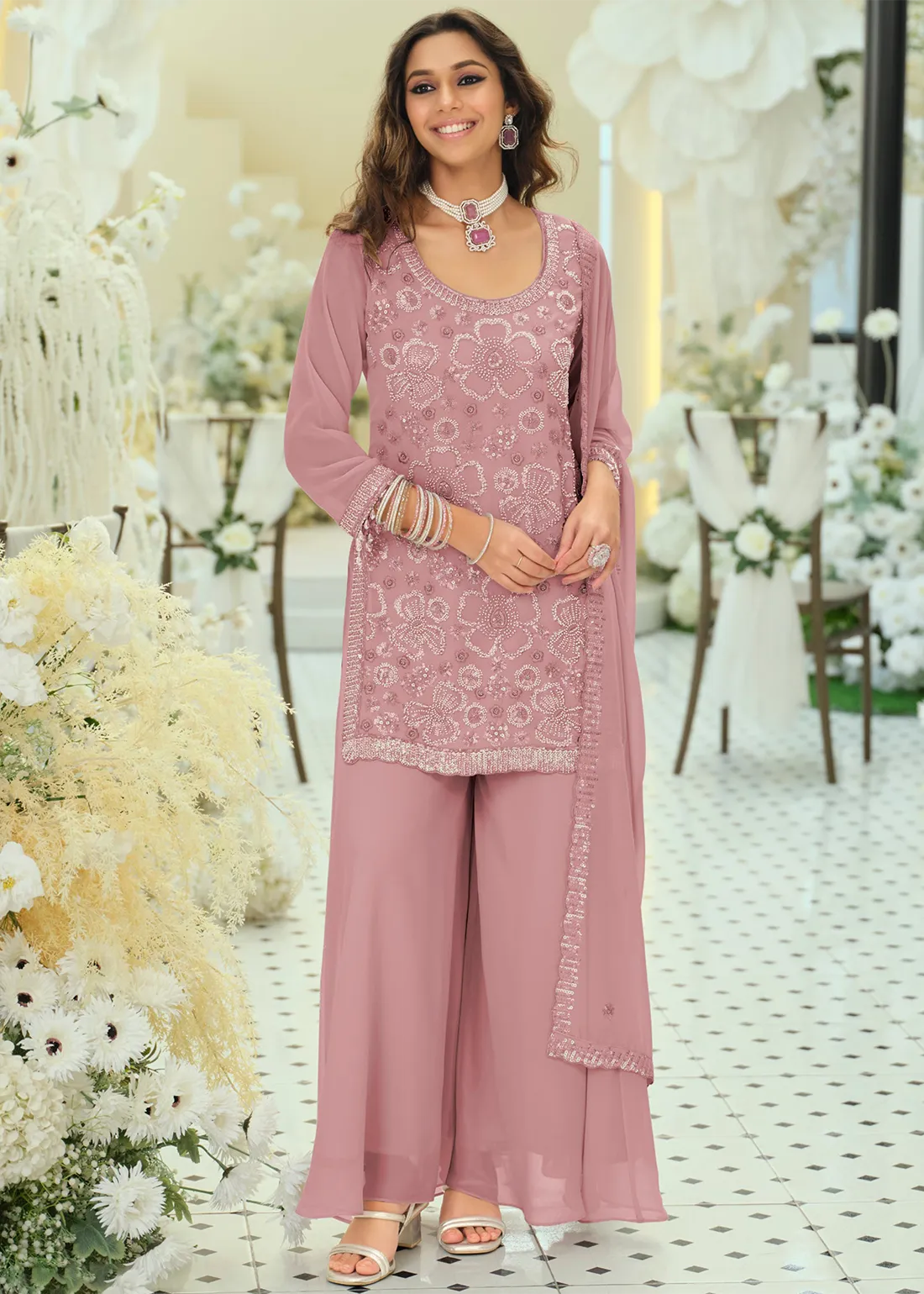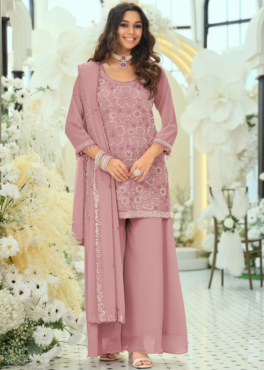 Rose Pink Georgette Palazzo Suit with Embroidery and Cutdana Work