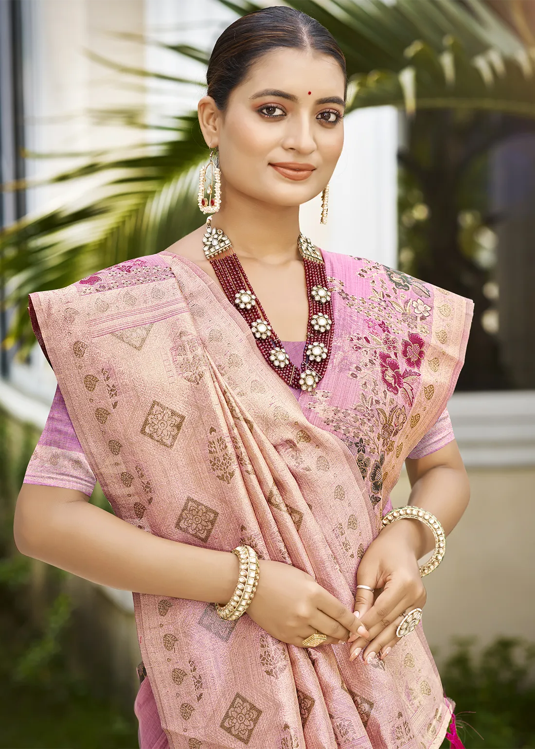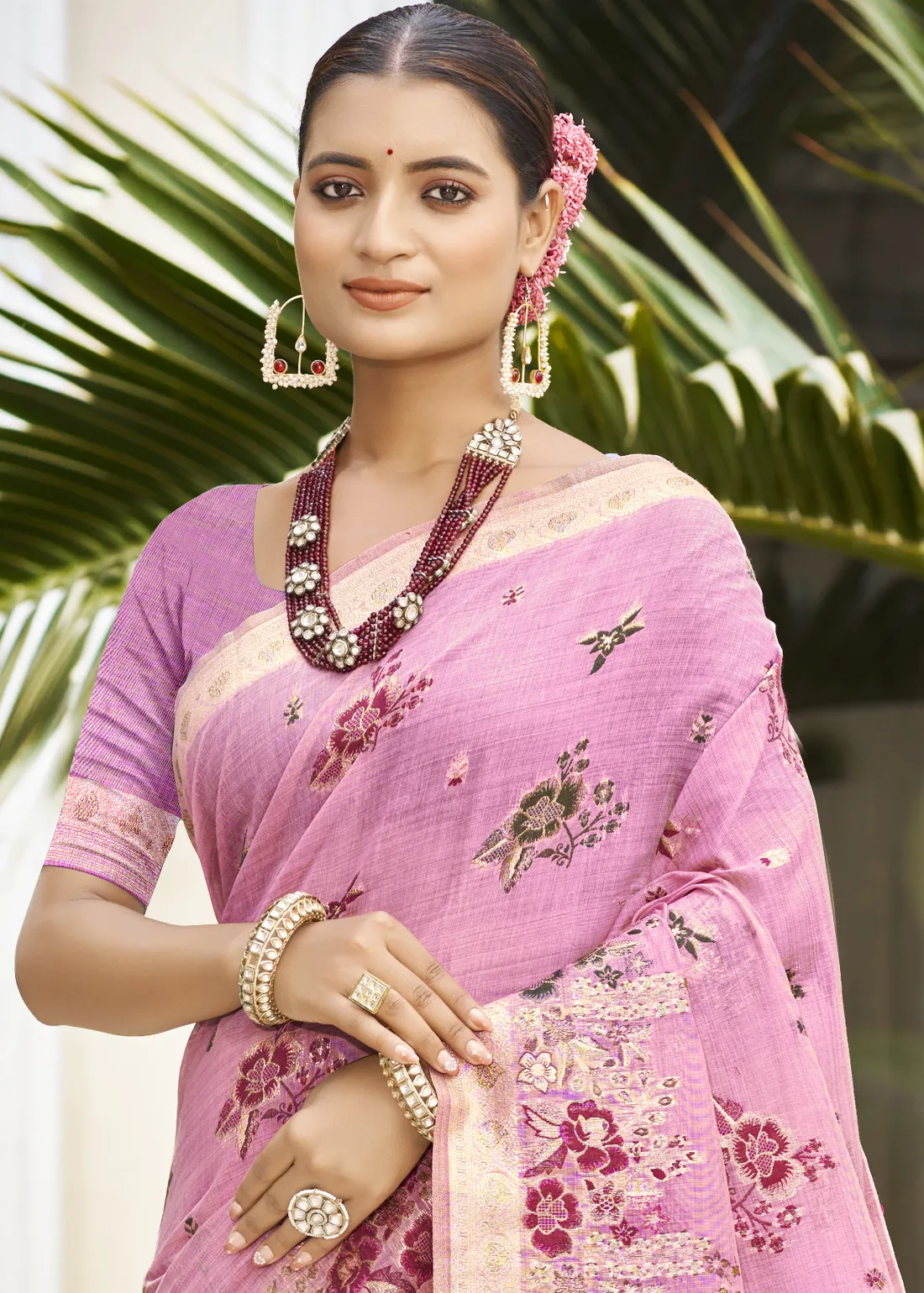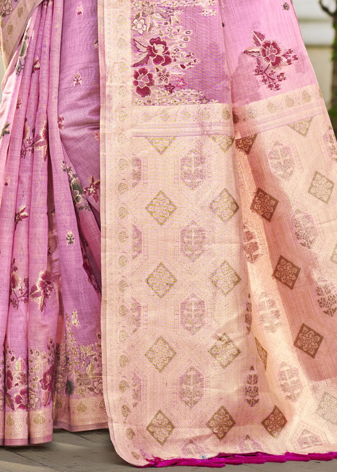Rose Pink Linen Silk Banarasi Saree with Meenakari Floral Buttis