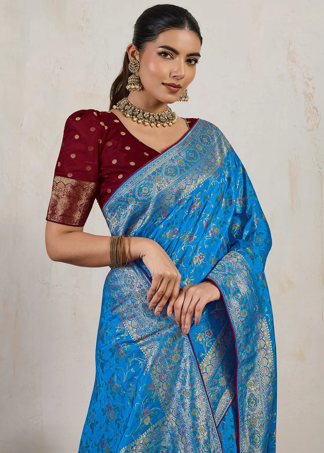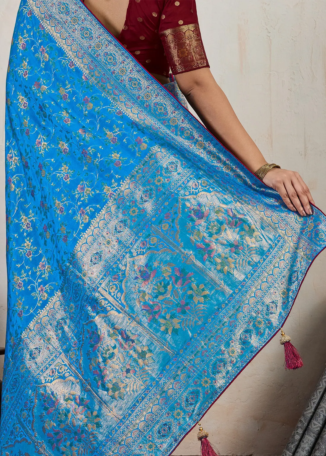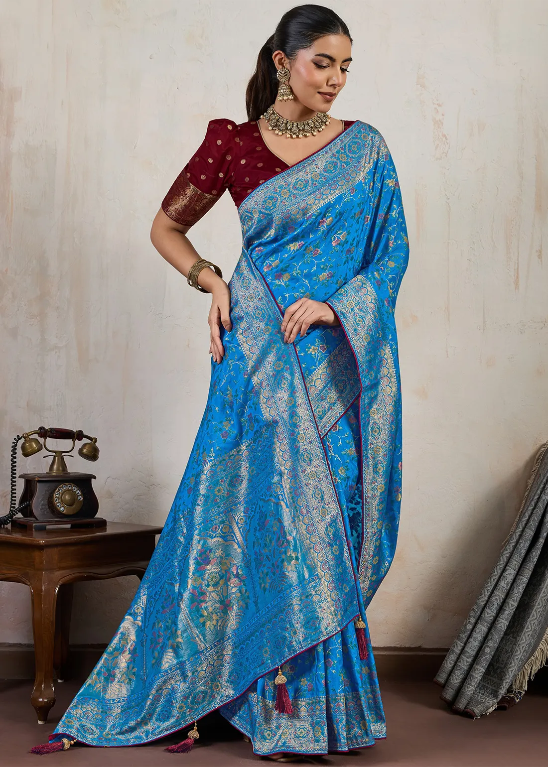Peacock Blue Banarasi Silk Saree with Wine Blouse
