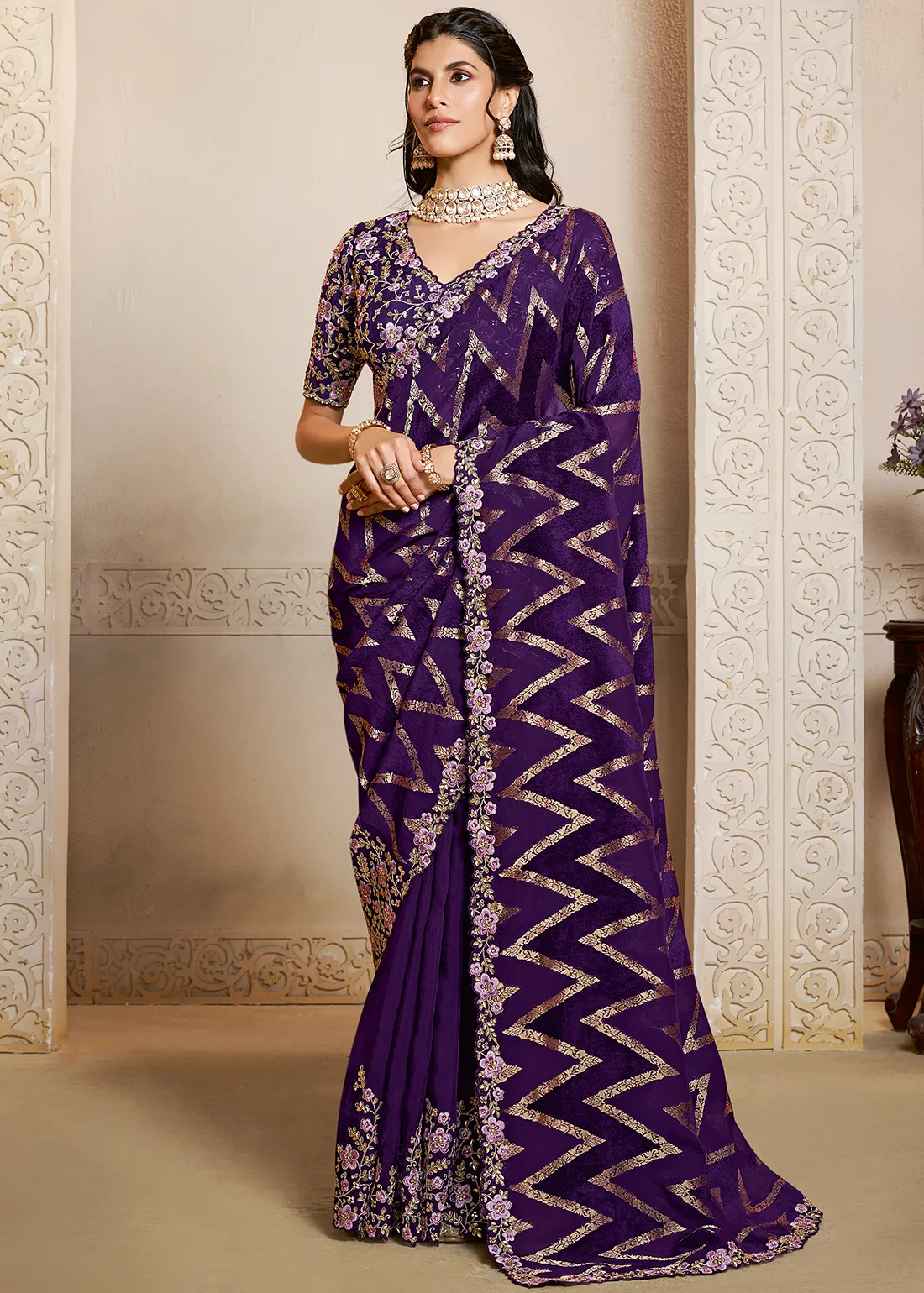 Radiate regal charm in this captivating royal purple designer saree from our Luxe Collection. Crafted from premium fabric with a subtle sheen, this saree features a striking gold zari chevron pattern, gracefully complemented by intricate floral embroidery along the borders and blouse. The beautifully crafted blouse showcases exquisite thread, sequin, and bead work that enhances the saree’s overall sophistication. Designed to exude luxury, this ensemble is perfect for festive occasions, wedding receptions, and high-end celebrations. Its deep purple hue symbolizes elegance and power, while the detailed craftsmanship adds a modern twist to traditional aesthetics — making it a must-have statement piece in your ethnic wardrobe.