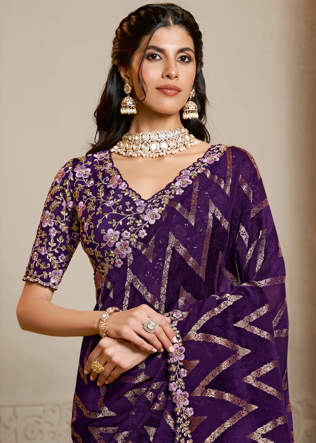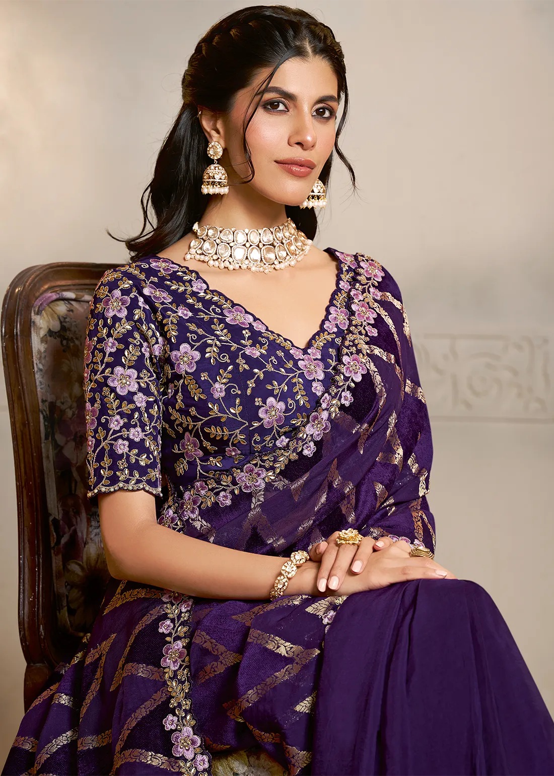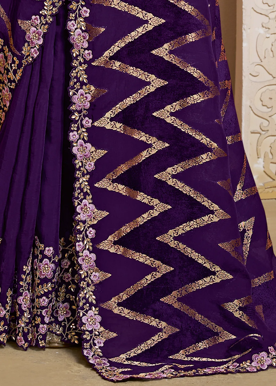 Royal Purple Embroidered Saree with Floral Work & Zari Weaving