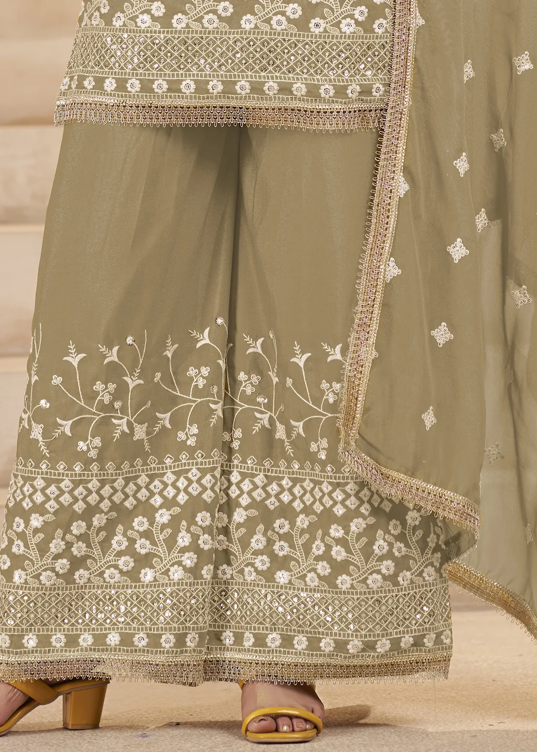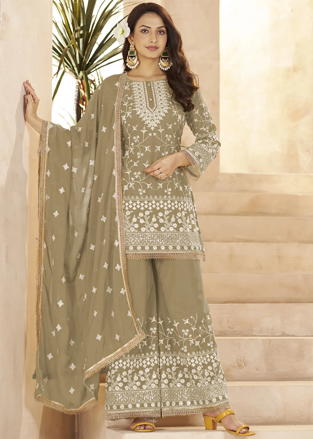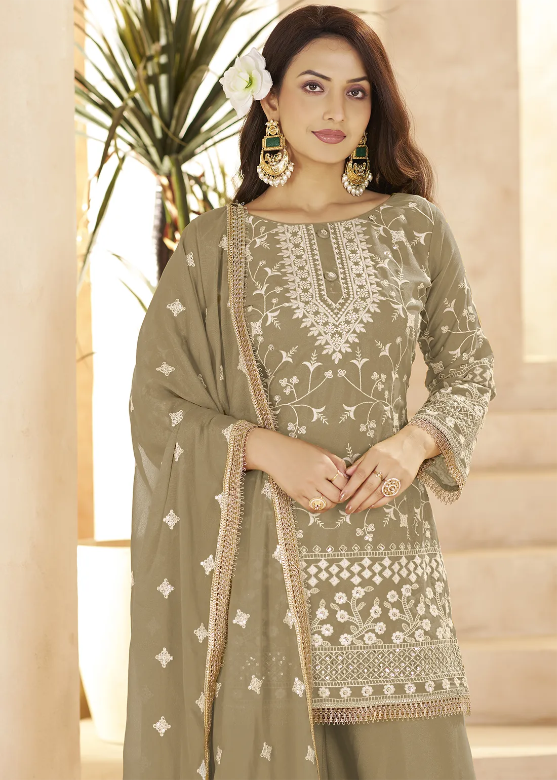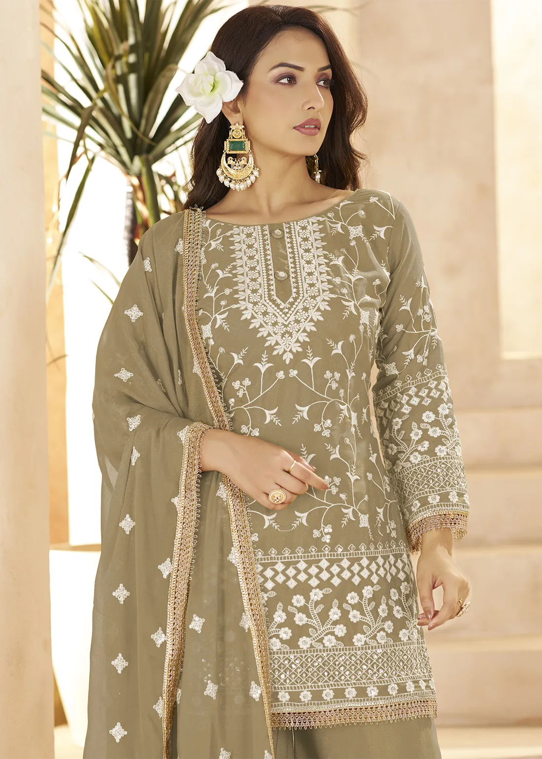 Step into timeless elegance with this Safari Beige Georgette Palazzo Suit featuring rich sequin and resham embroidery. The top is perfectly paired with a palazzo bottom and a matching embroidered dupatta. Crafted with this ensemble is an ideal choice for festive gatherings, and special celebrations.