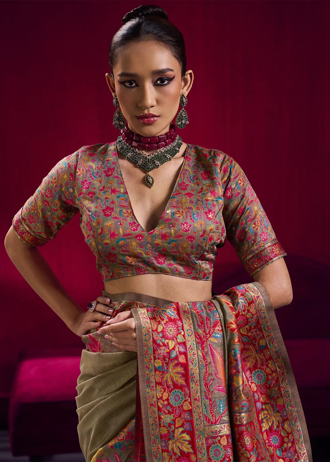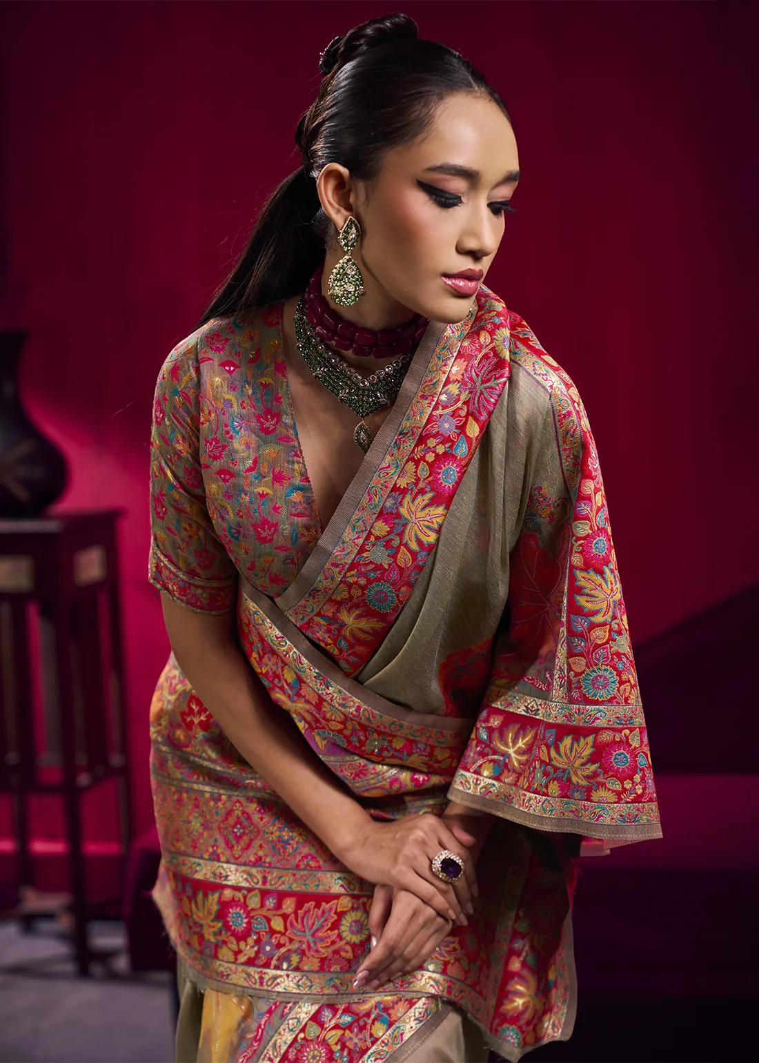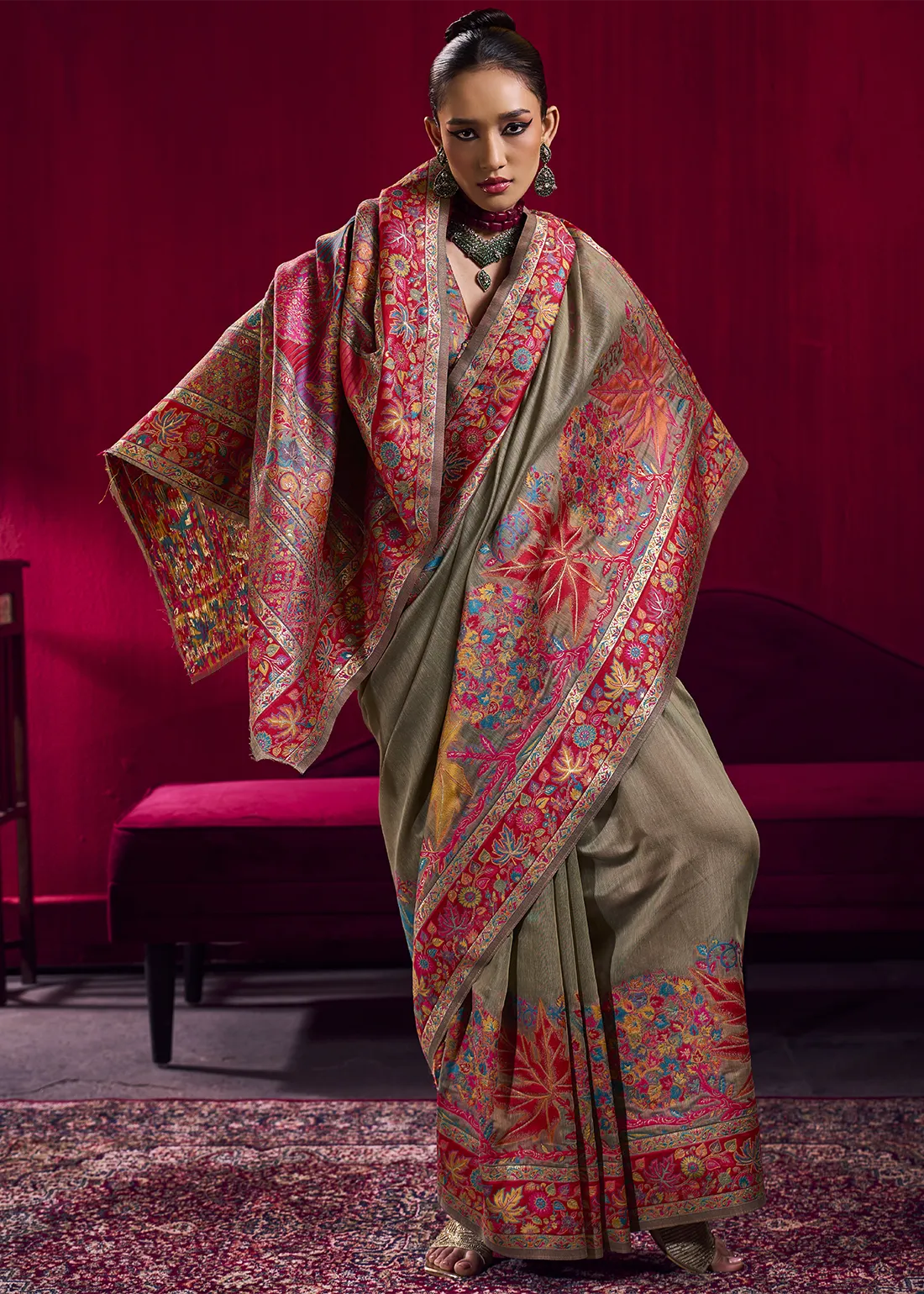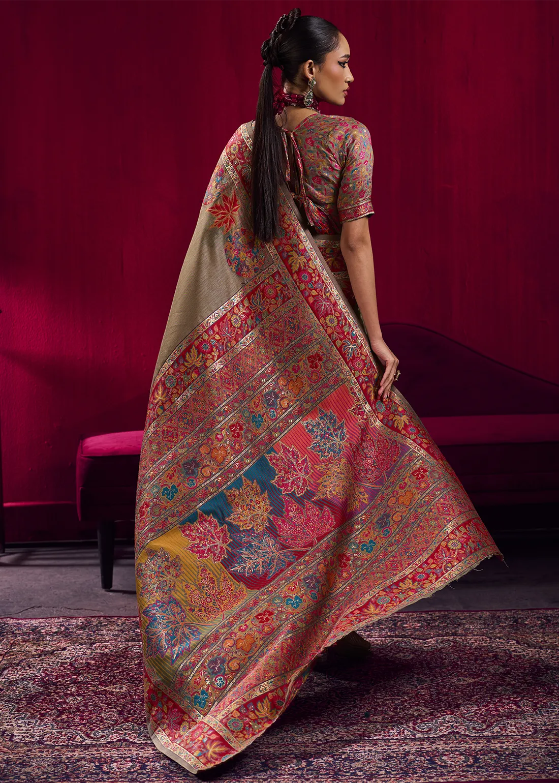 Safari Beige Kashmiri Jamawar Pashmina Saree