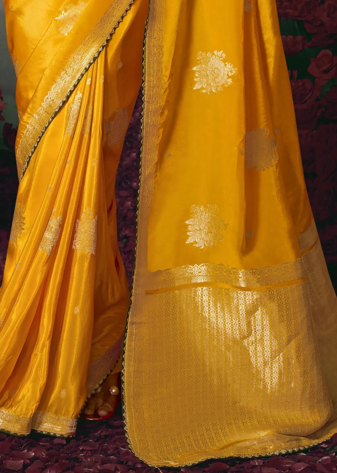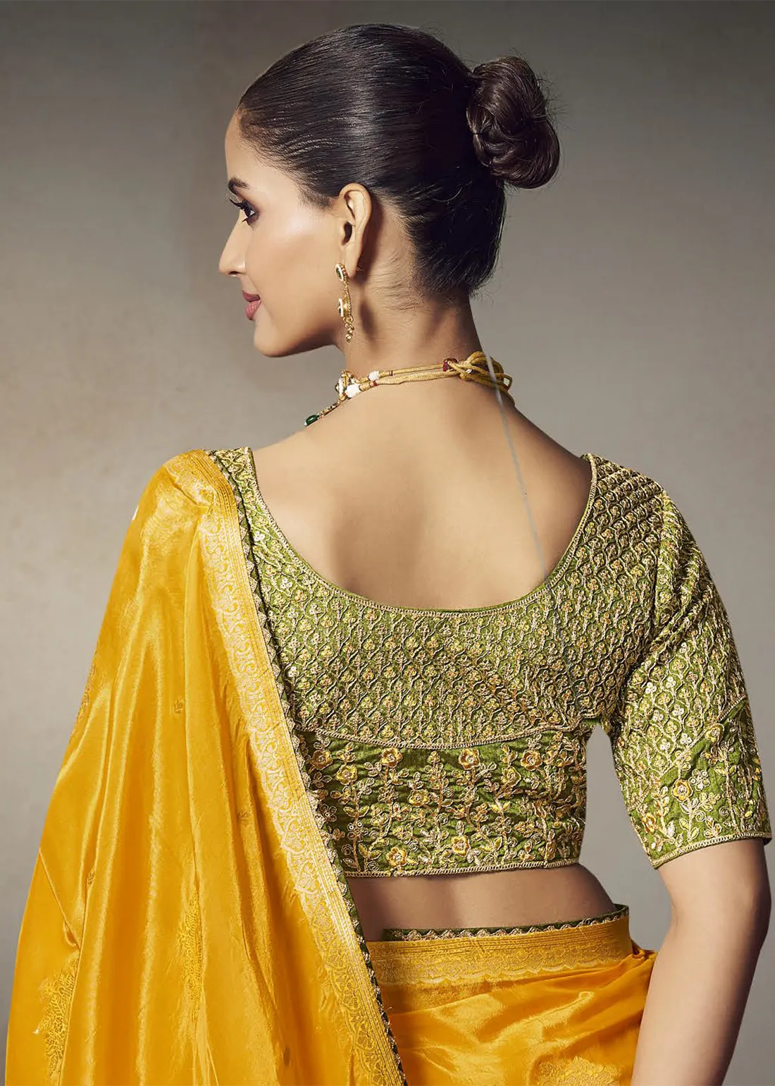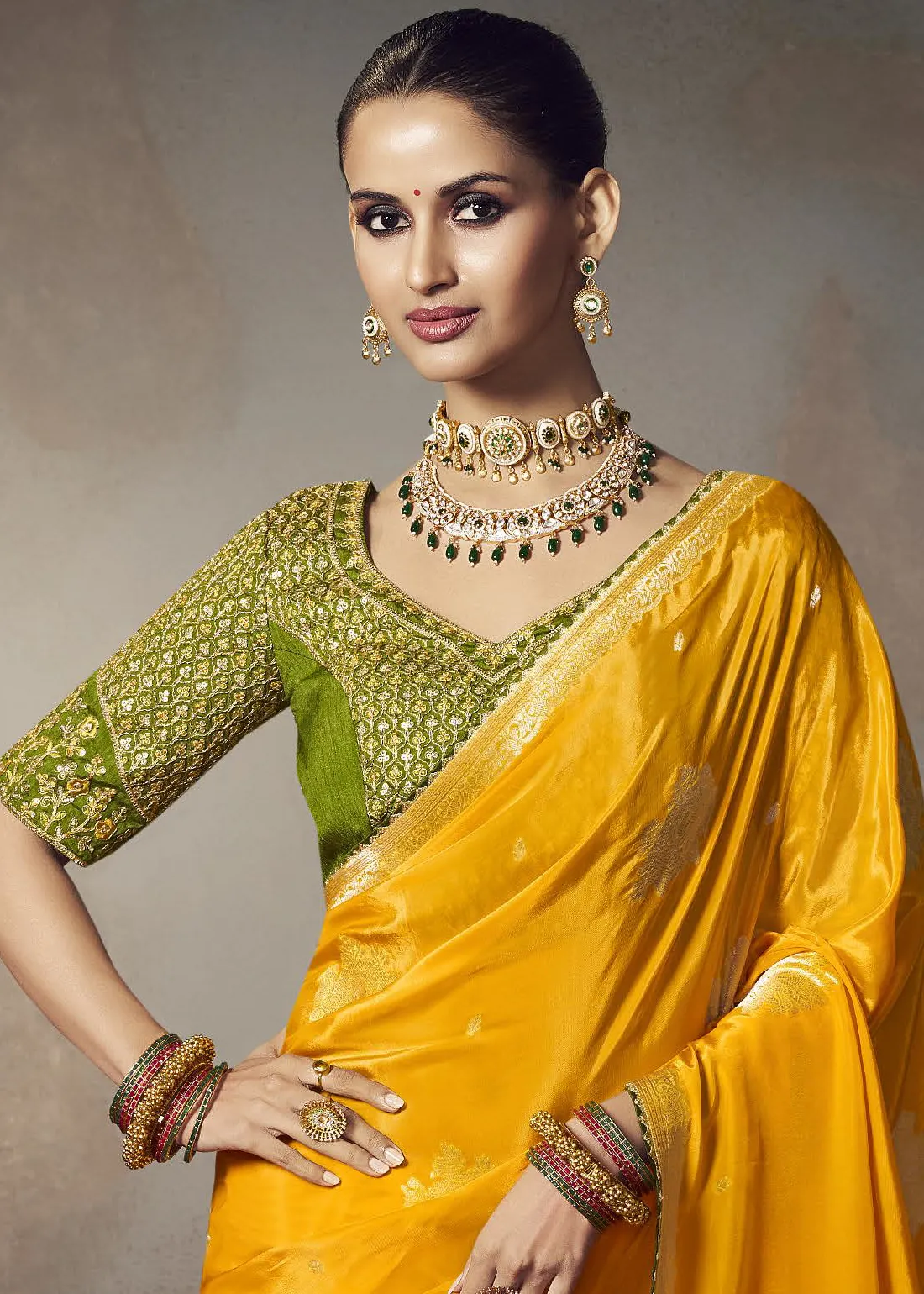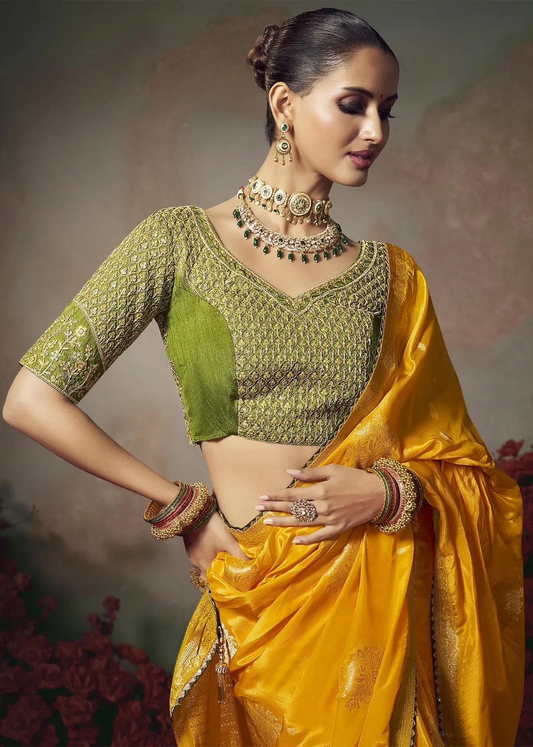 Saffron Yellow Banarasi Saree with Green Embroidered Blouse