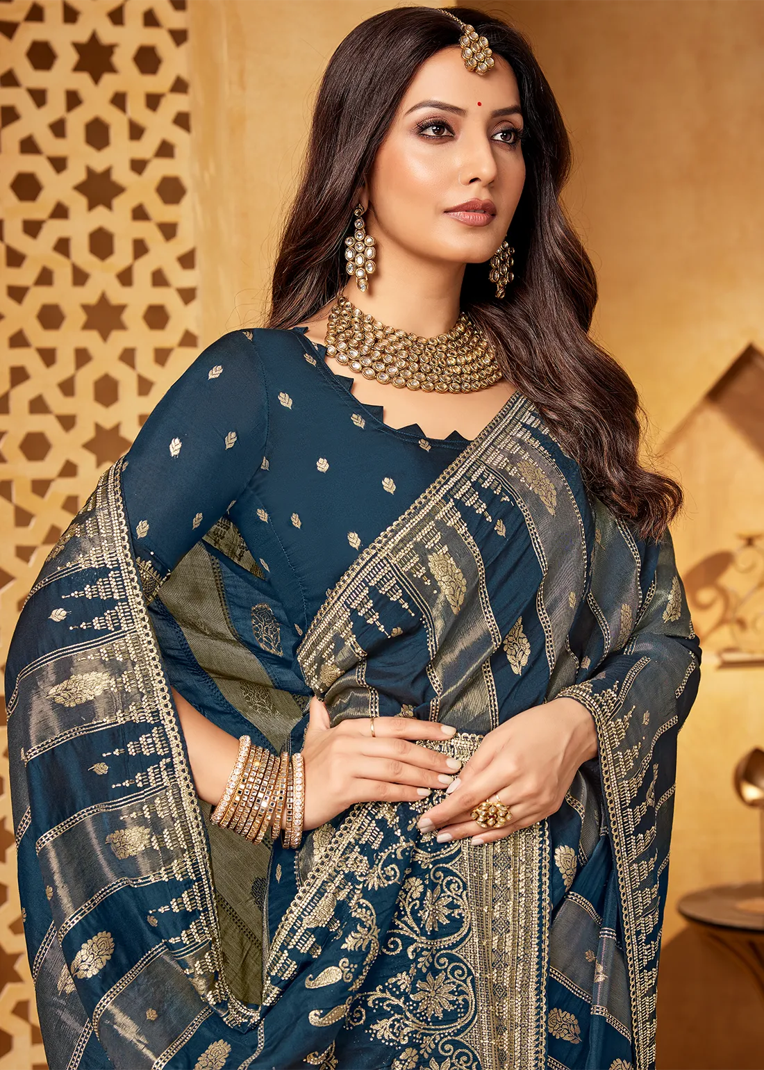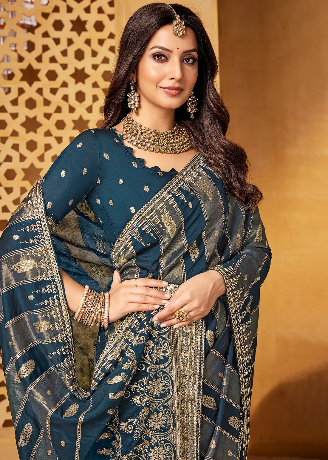 Navy Blue Banarasi Dola Silk Saree with Embroidery Work