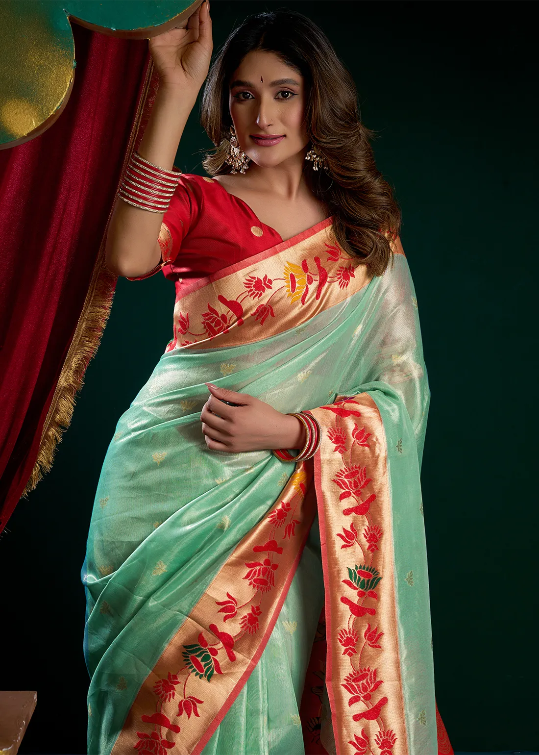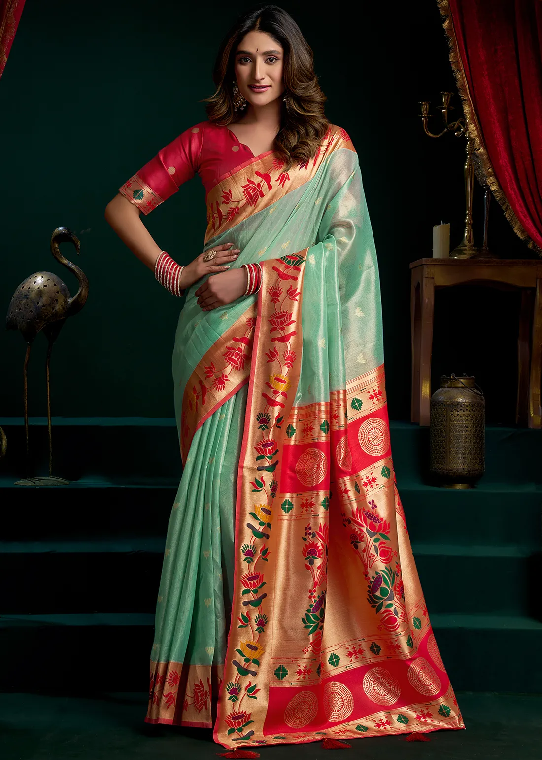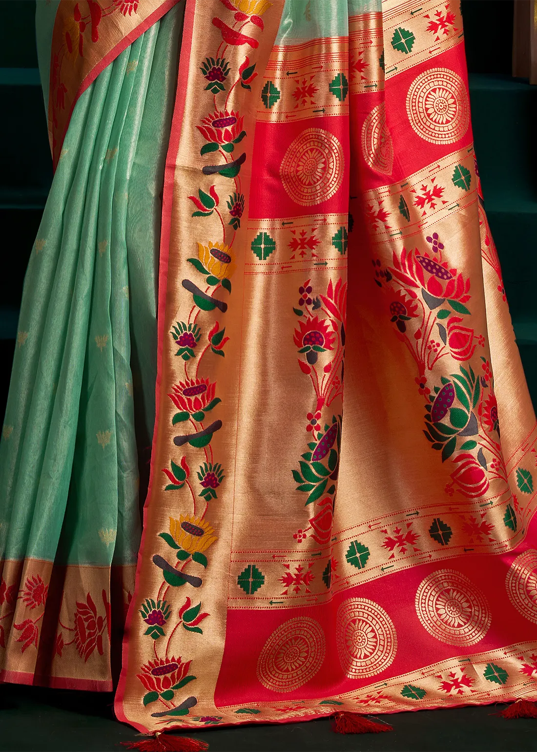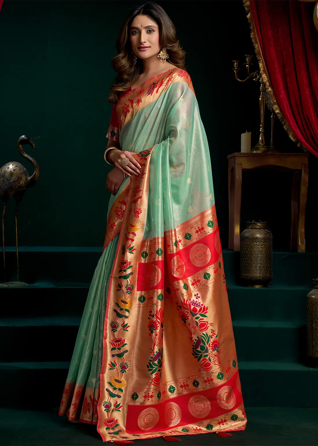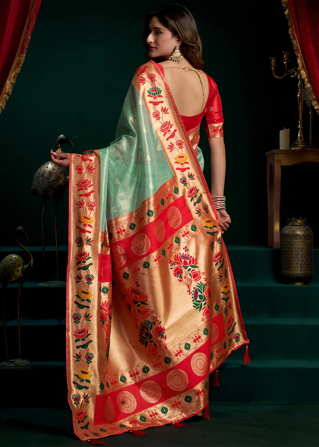 Sea Green Tissue Silk Paithani Saree with Red Blouse